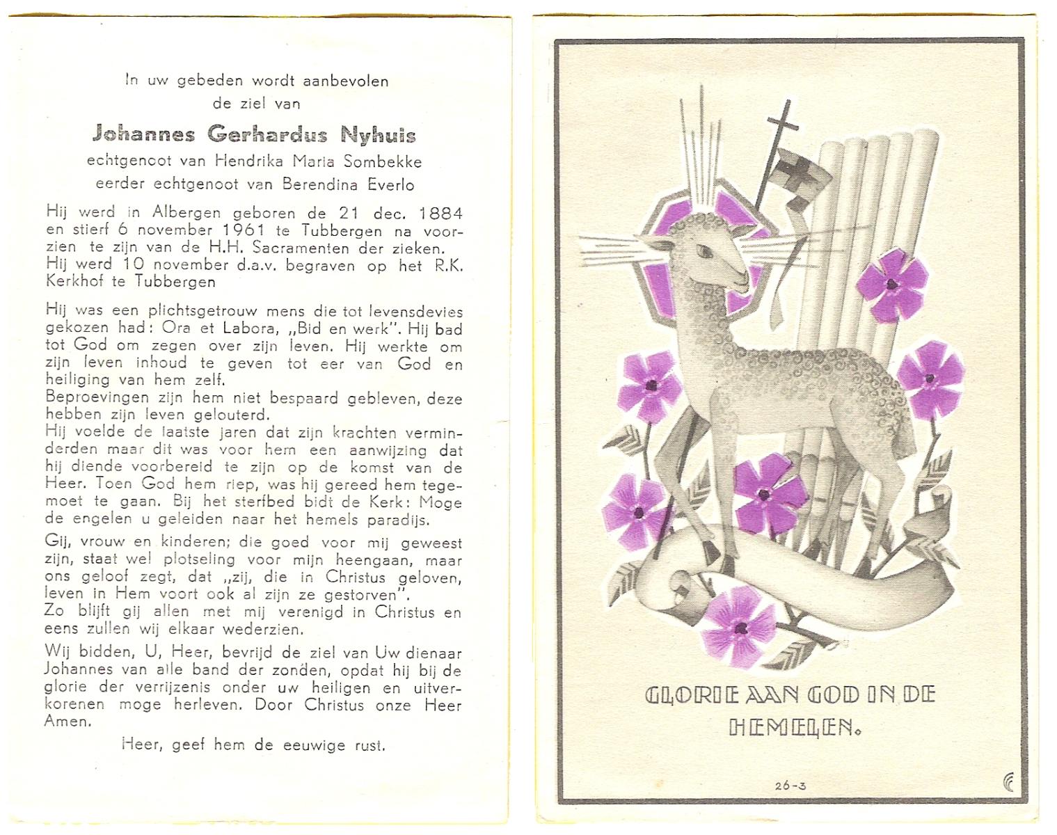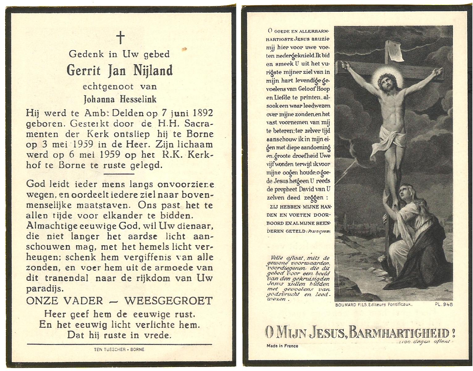NIJLAND, Gerrit Jan, geboren op 07-06-1892 te Delden, Ambt, overleden op 3-5-1959 te Borne op 66-jarige leeftijd, begraven op 6-5-1959 te Borne.