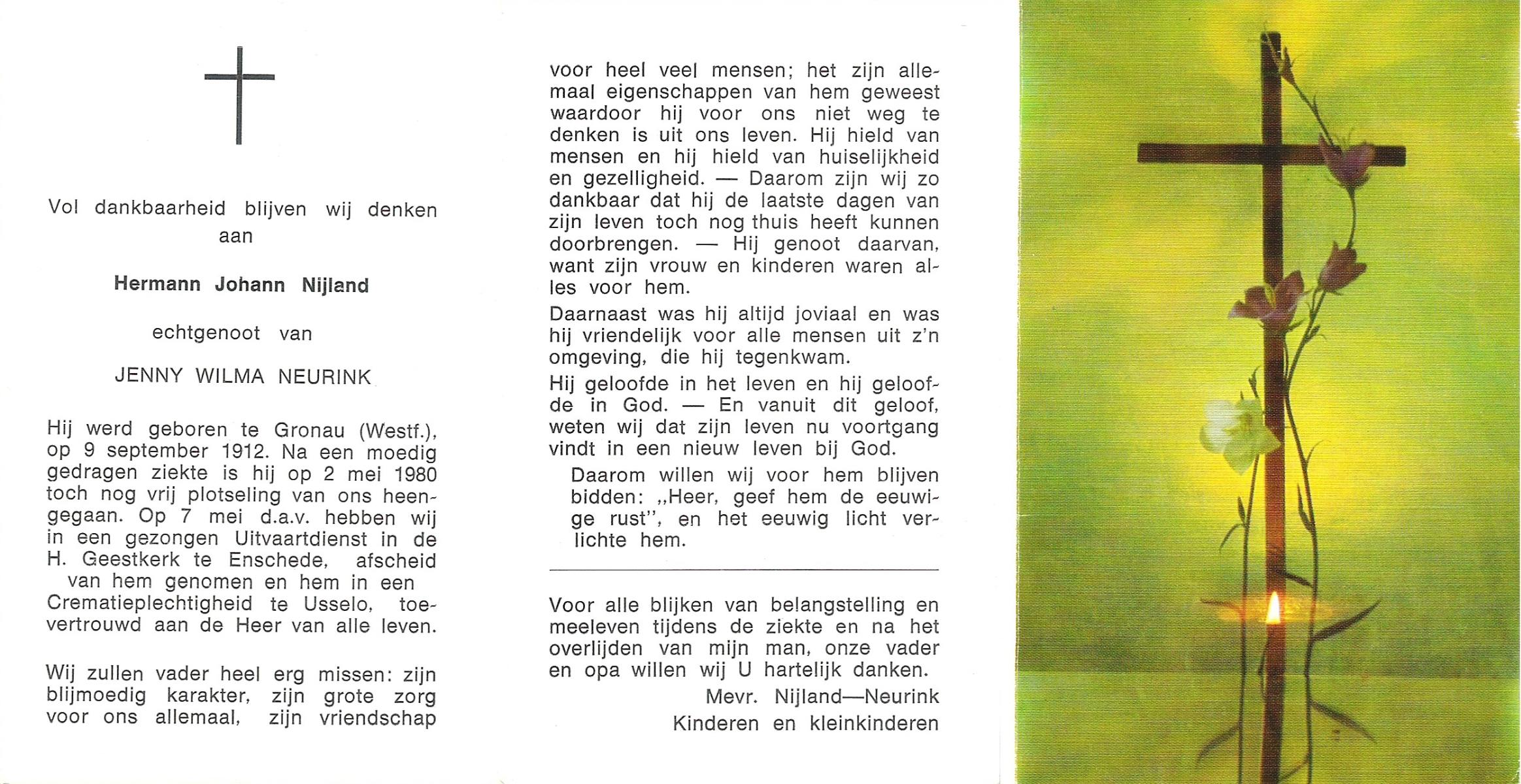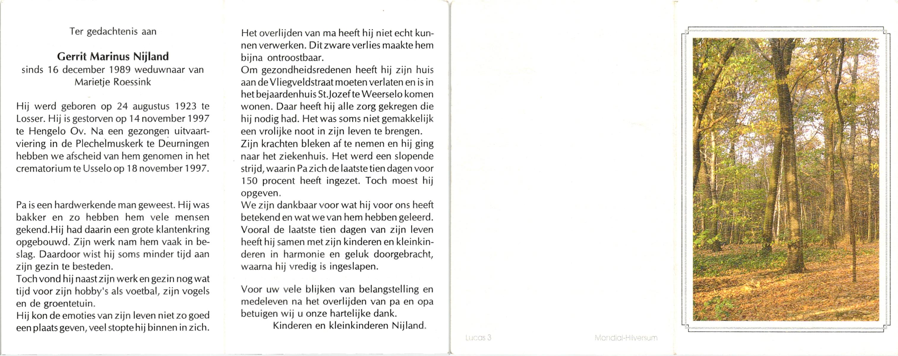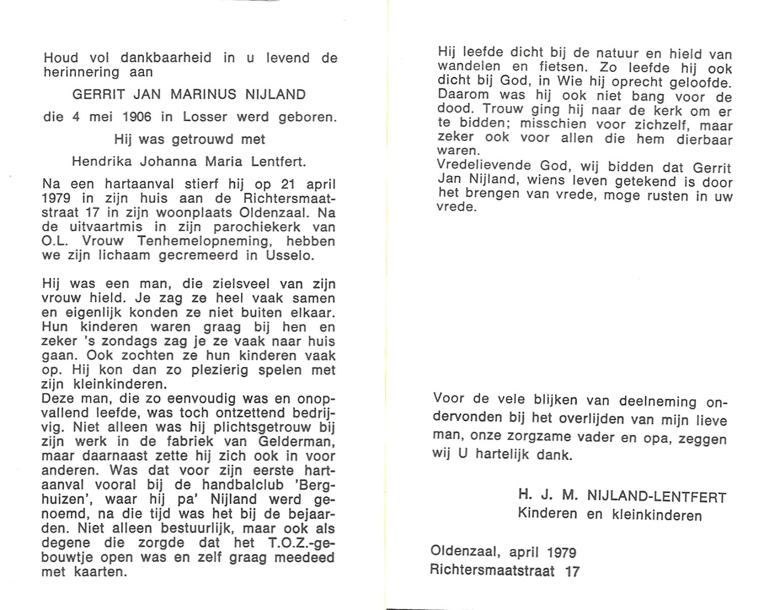 NIJLAND, Gerrit Jan Marinus, geboren op 4-5-1906 te Losser, overleden op 21-4-1979 te Oldenzaal op 72-jarige leeftijd, gecremeerd te Usselo.