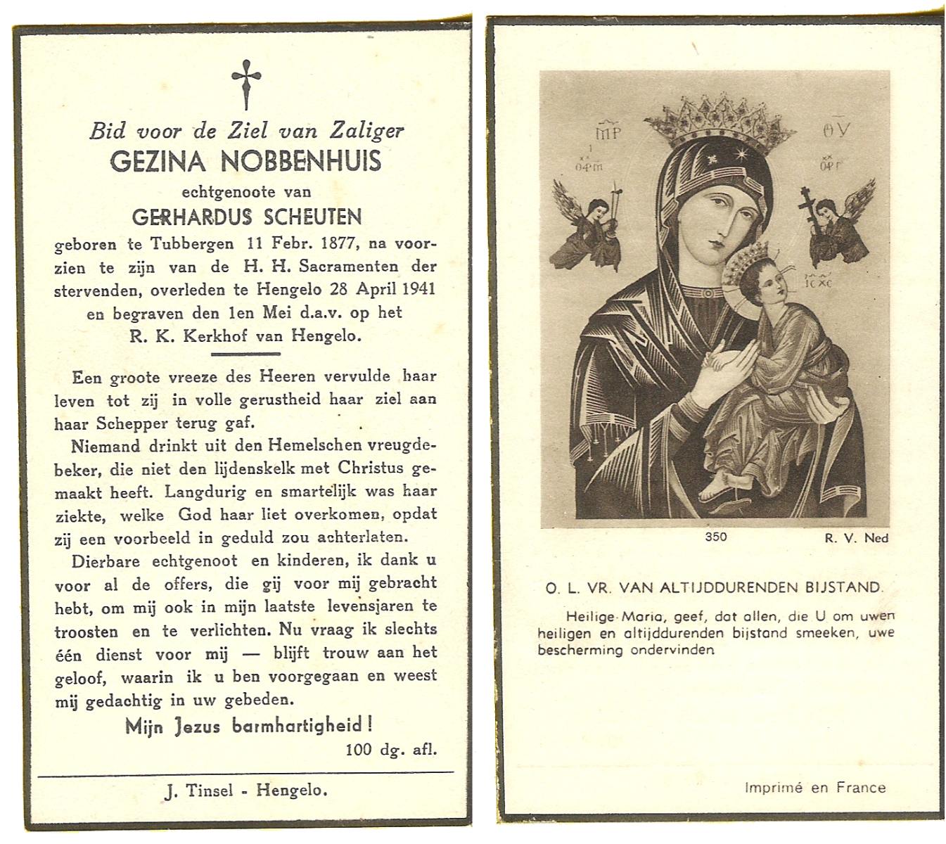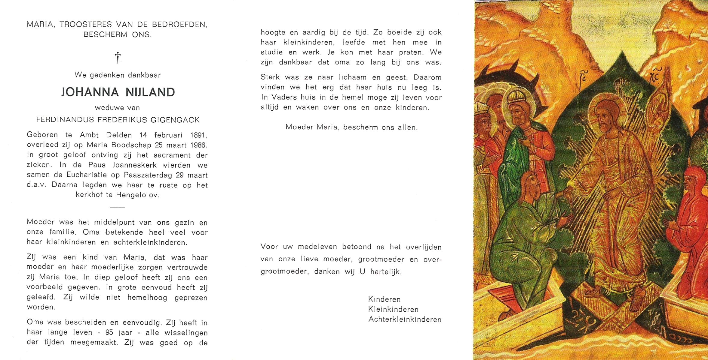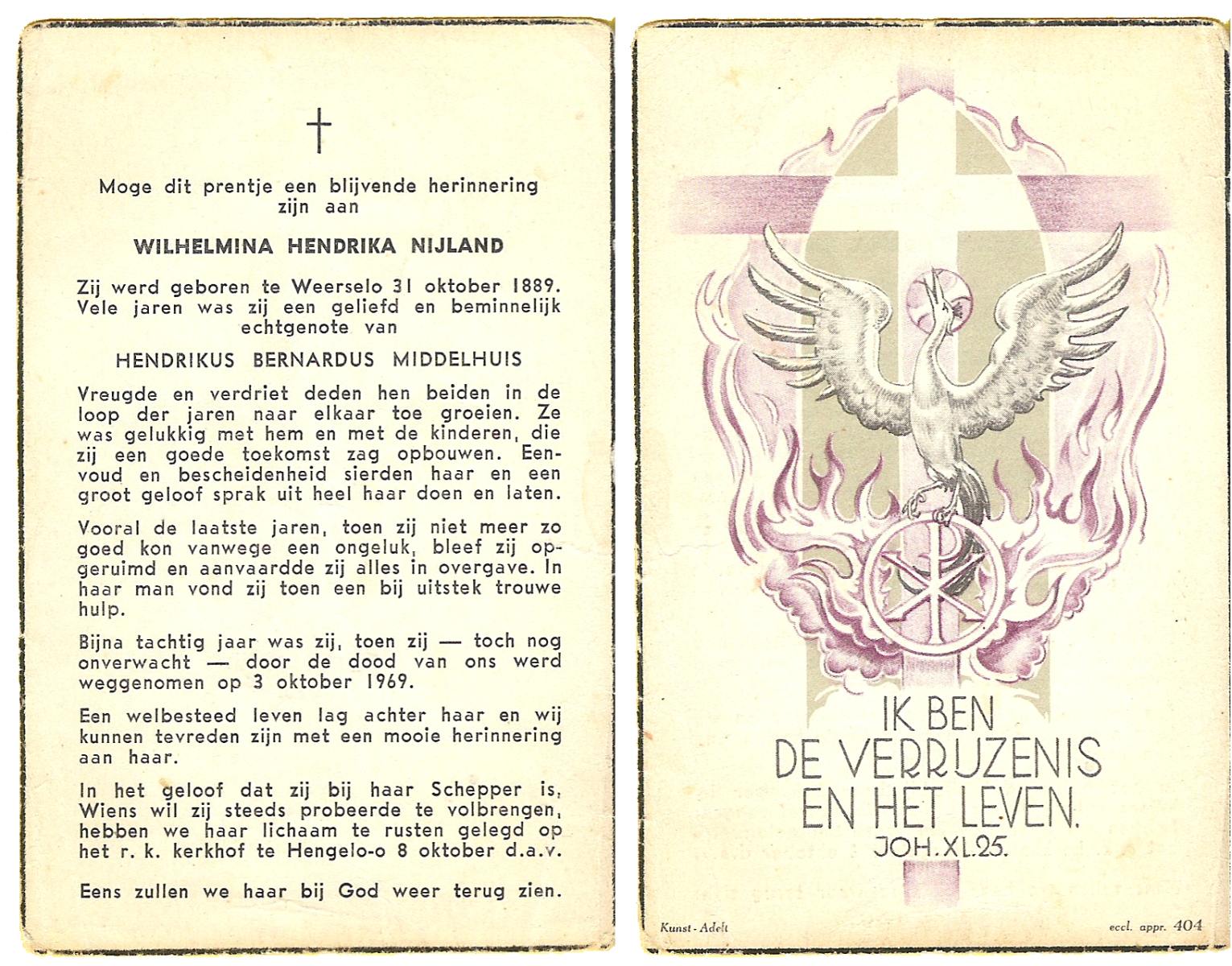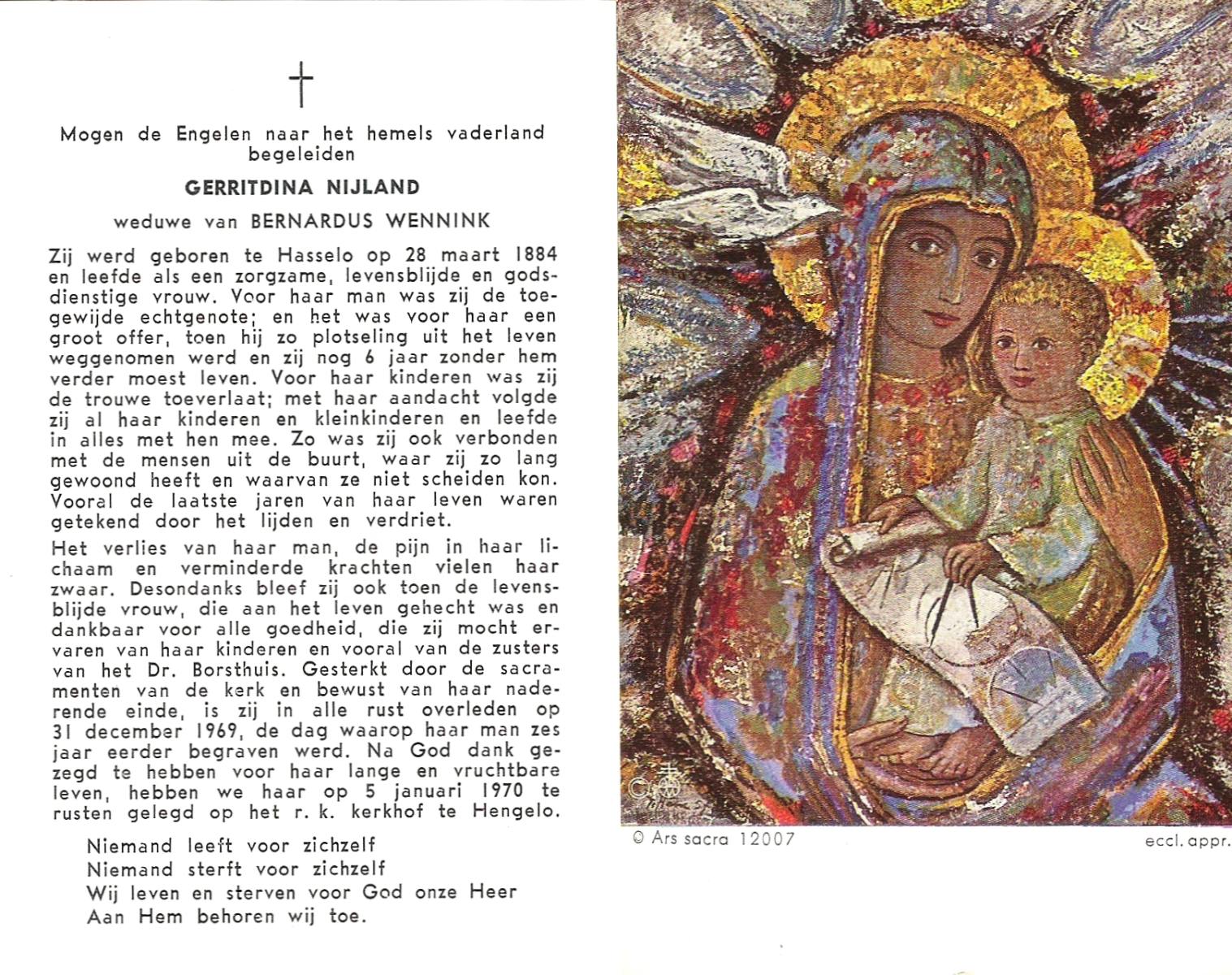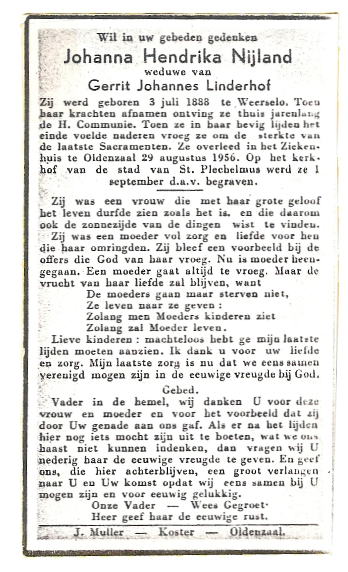 NIJLAND, Gerritdina, geboren op 28-03-1884 te Hasselo, overleden op 31-12-1969 te Hengelo (Ov.) op 85-jarige leeftijd, begraven op 5-1-1970 te Hengelo (Ov.).