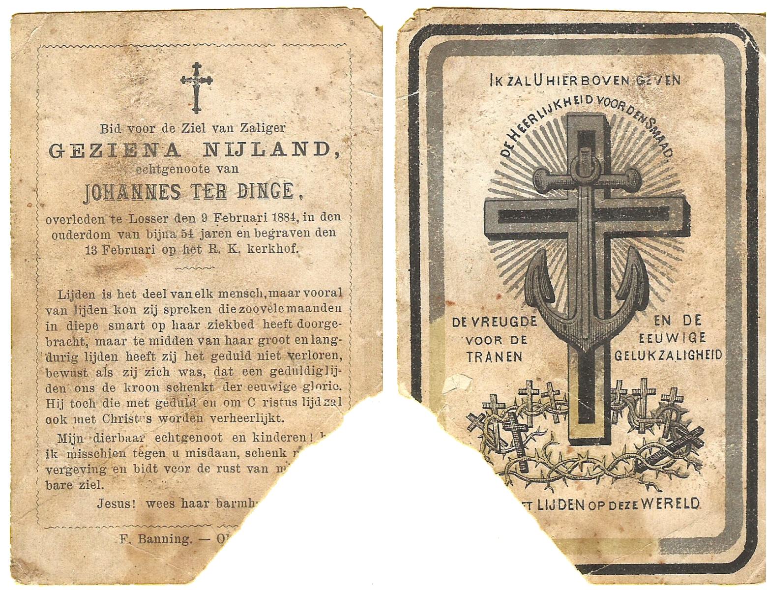 NIJLAND, Geziena, overleden op 09-02-1884 te Losser op 53-jarige leeftijd, begraven op 13-02-1884 te Losser.