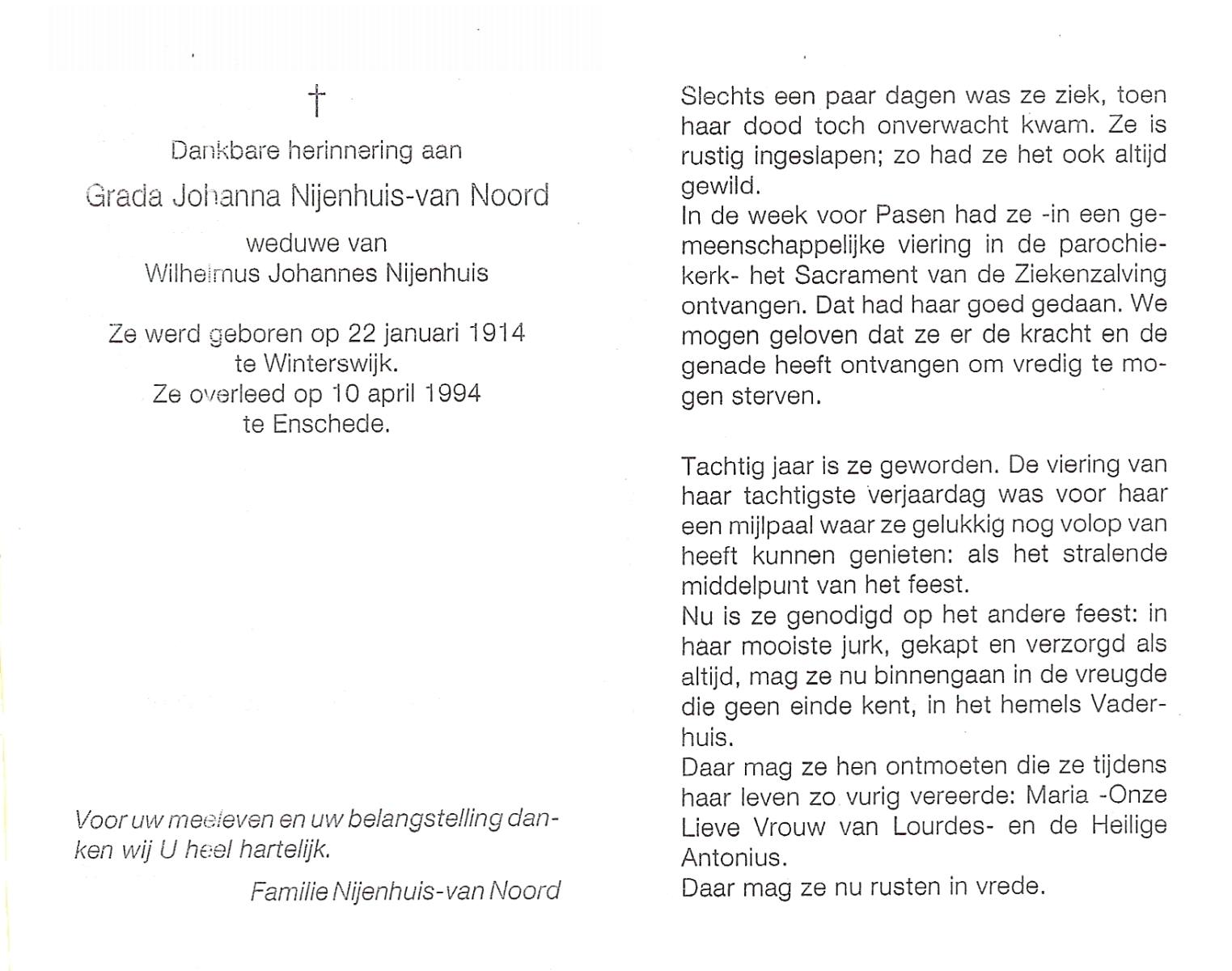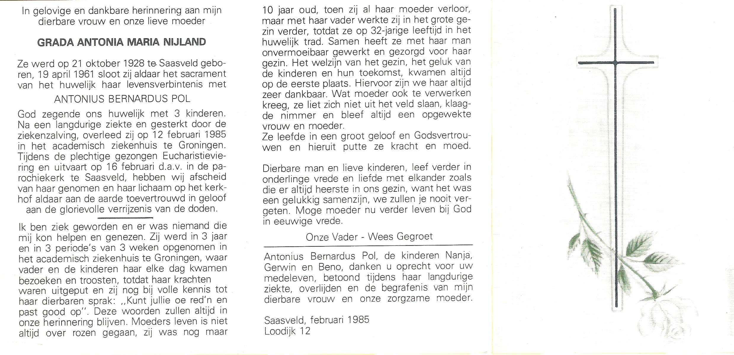 NIJLAND, Grada Antonia Maria, geboren op 21-10-1928 te Saasveld, overleden op 12-2-1985 te Groningen op 57-jarige leeftijd, begraven op 16-2-1985 te Saasveld.