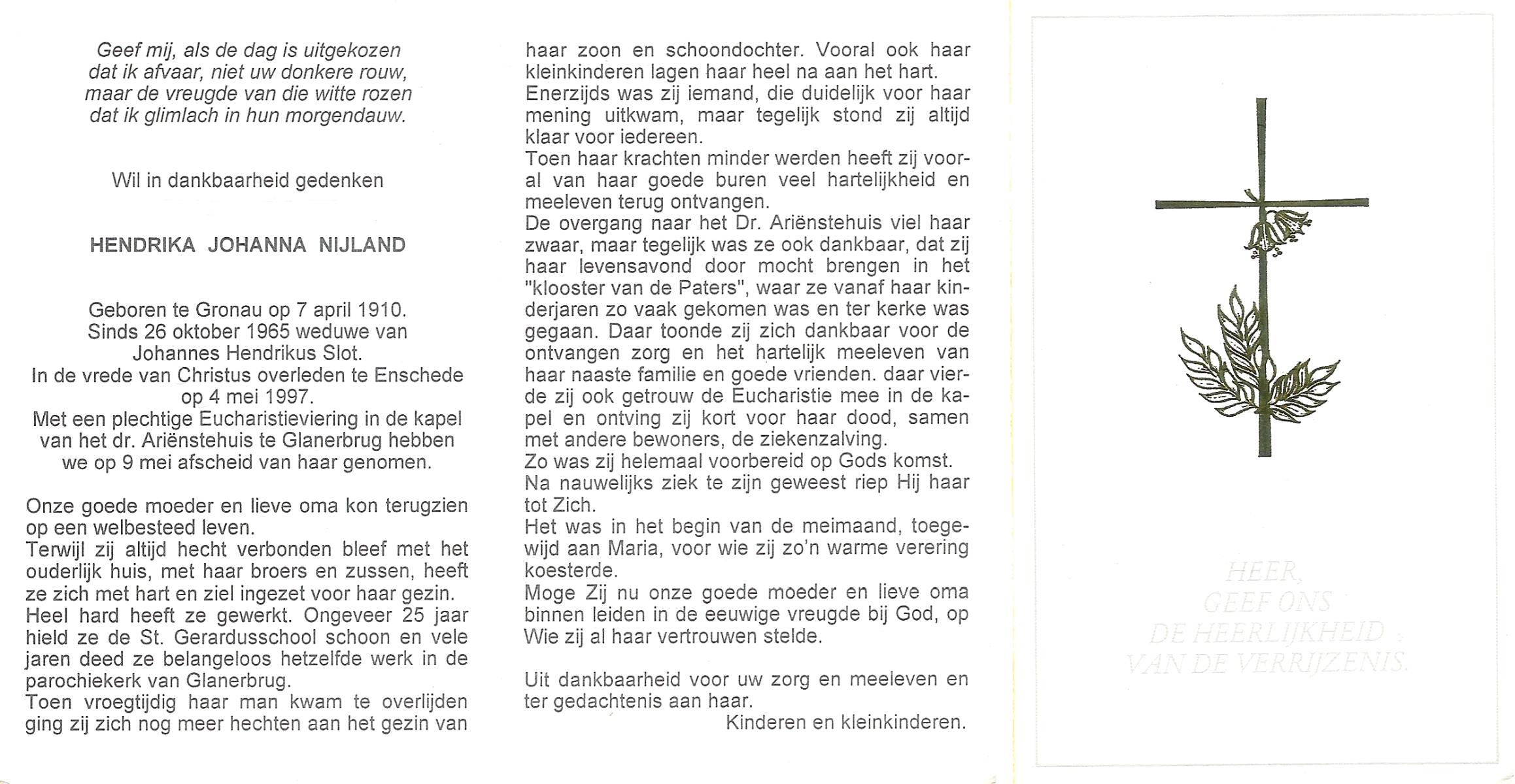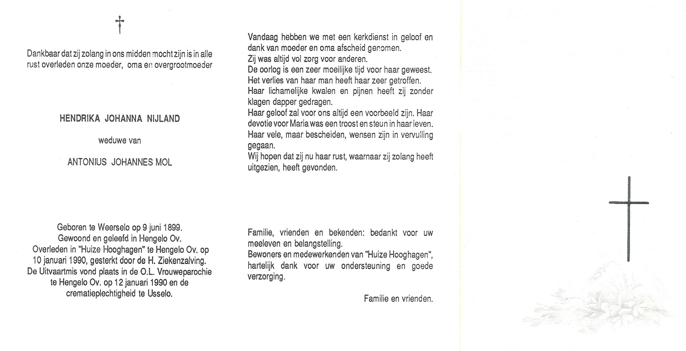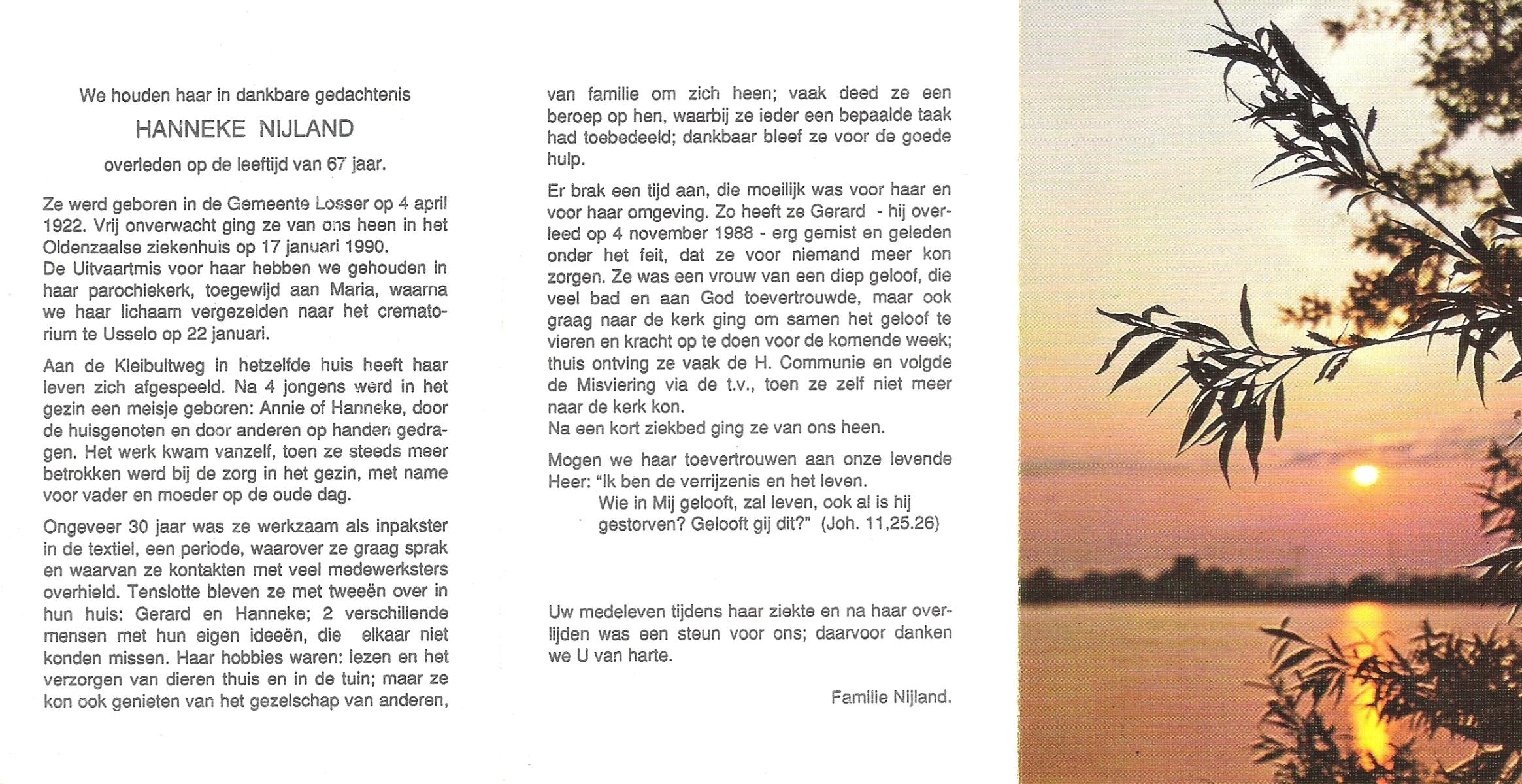 NIJLAND, Hanneke, geboren op 4-4-1922 te Losser, overleden op 17-1-1990 te Oldenzaal op 67-jarige leeftijd, gecremeerd op 22-1-1990 te Usselo.