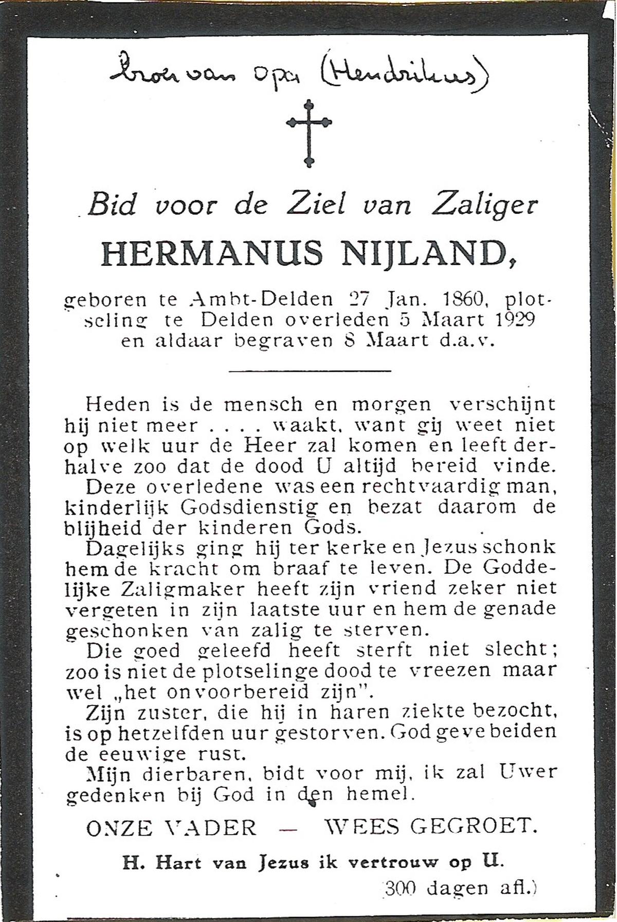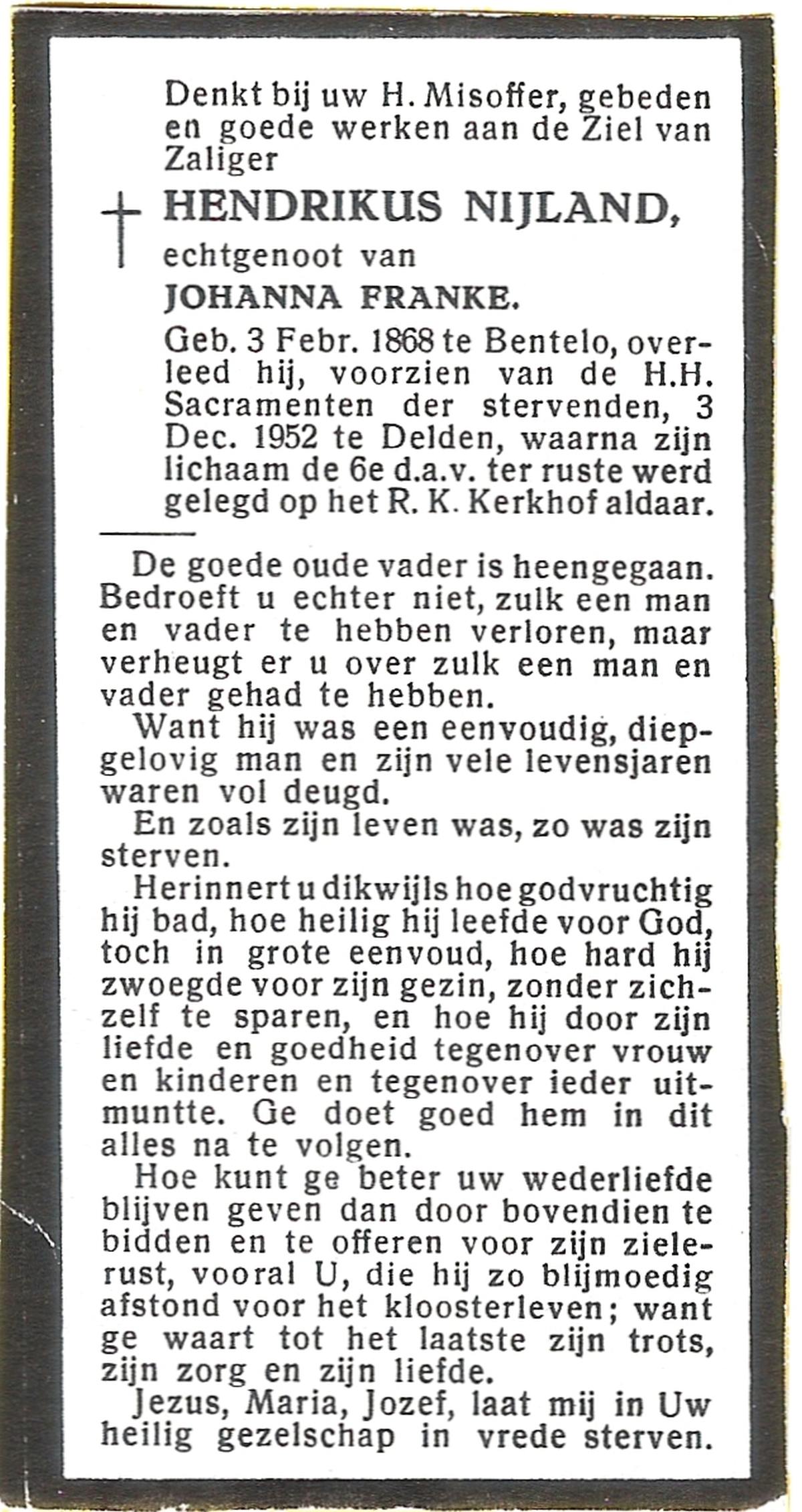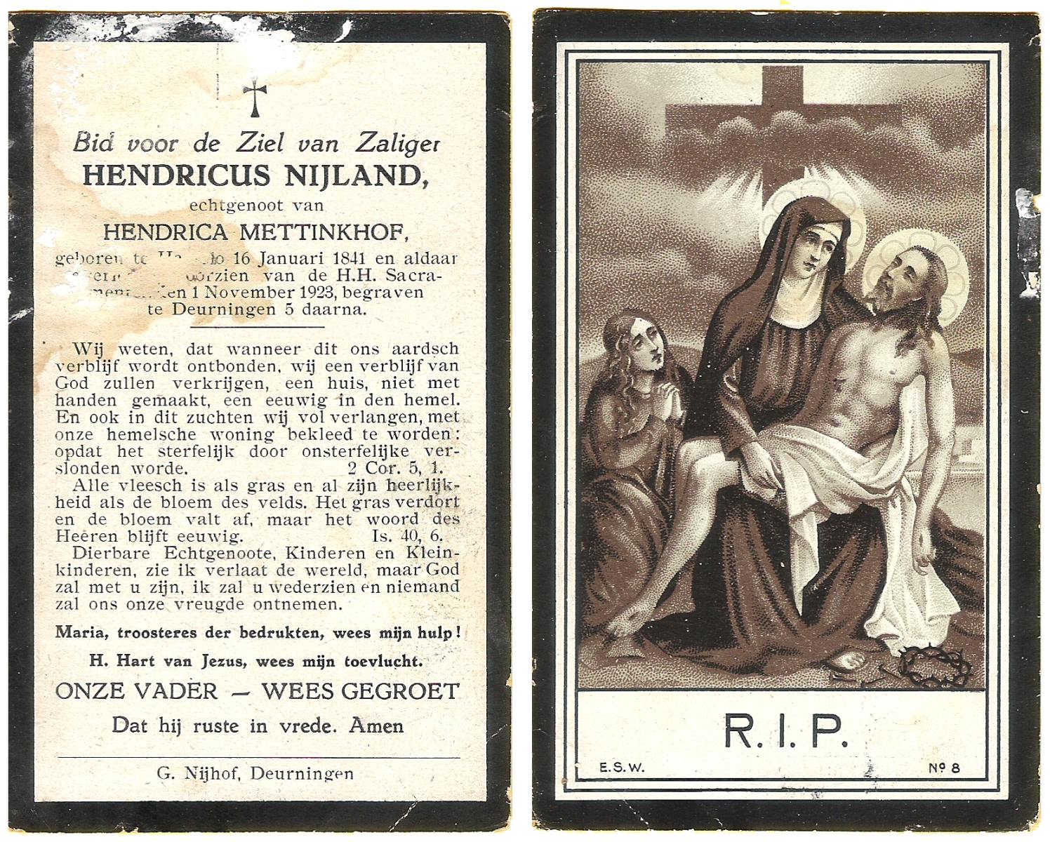 NIJLAND, Hendricus, geboren op 16-01-1841 te Hasselo, overleden op 1-11-1923 te Hasselo op 82-jarige leeftijd, begraven op 5-11-1923 te Deurningen.
