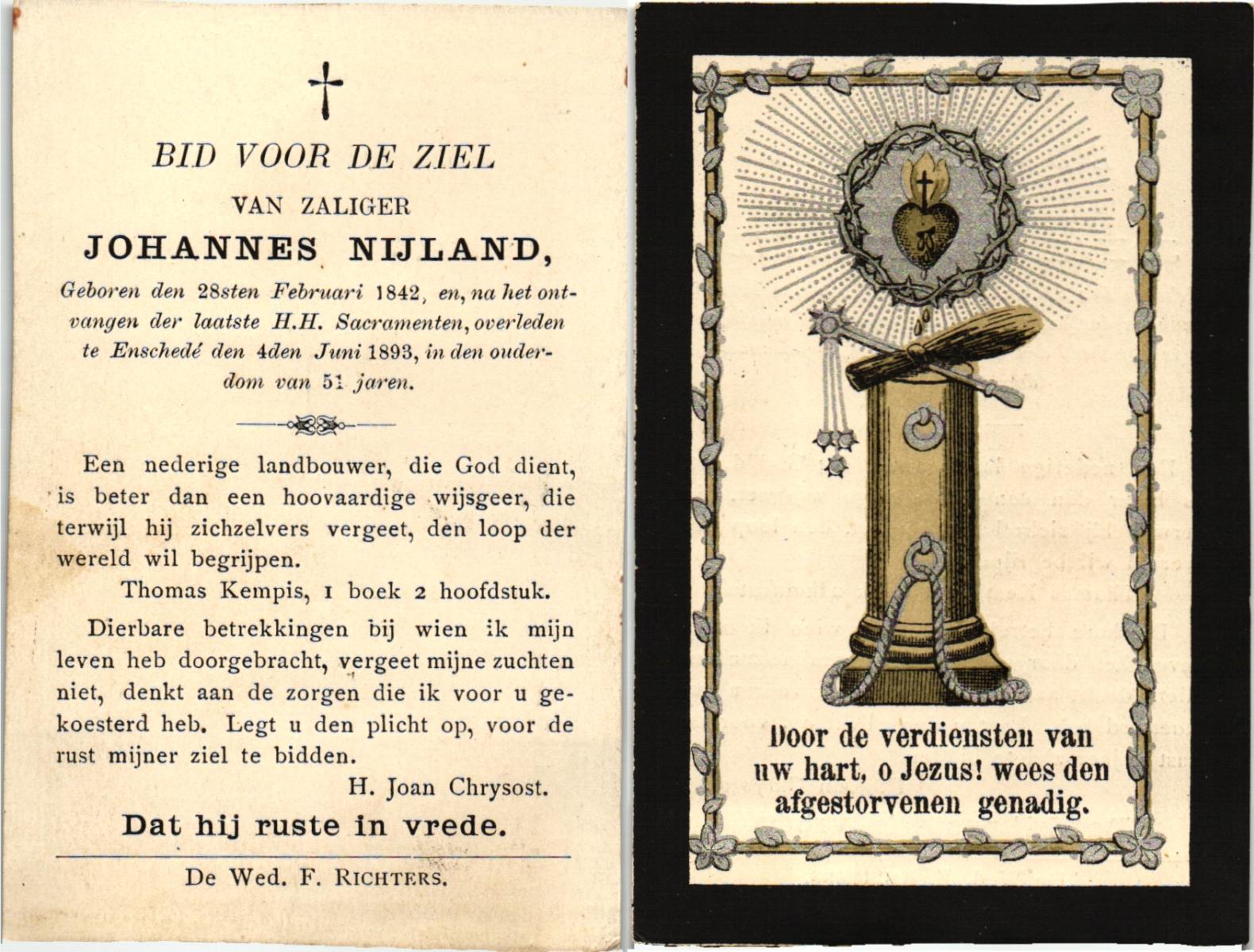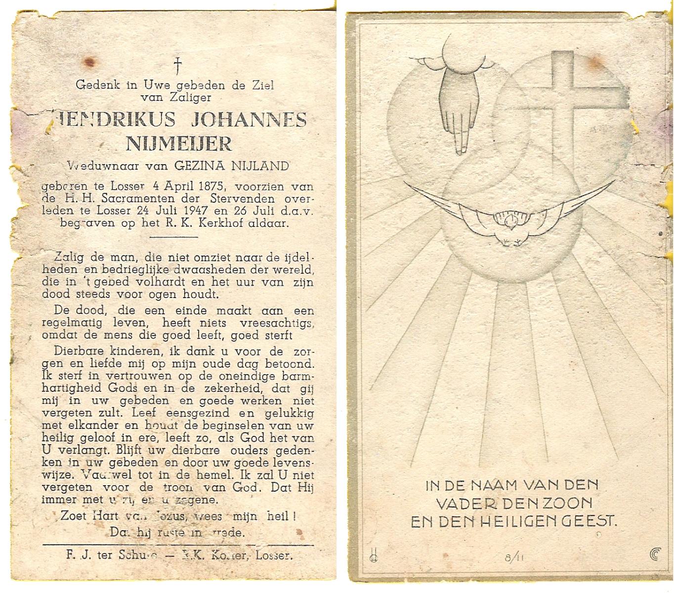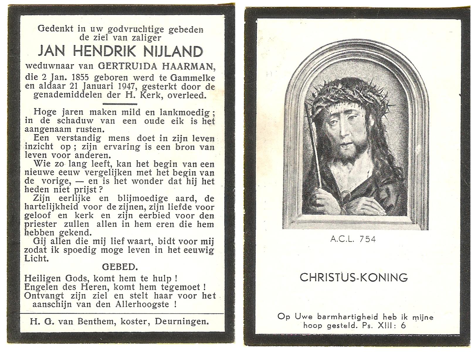 NIJLAND, Hendricus, geboren op 16-01-1841 te Hasselo, overleden op 1-11-1923 te Hasselo op 82-jarige leeftijd, begraven op 5-11-1923 te Deurningen.