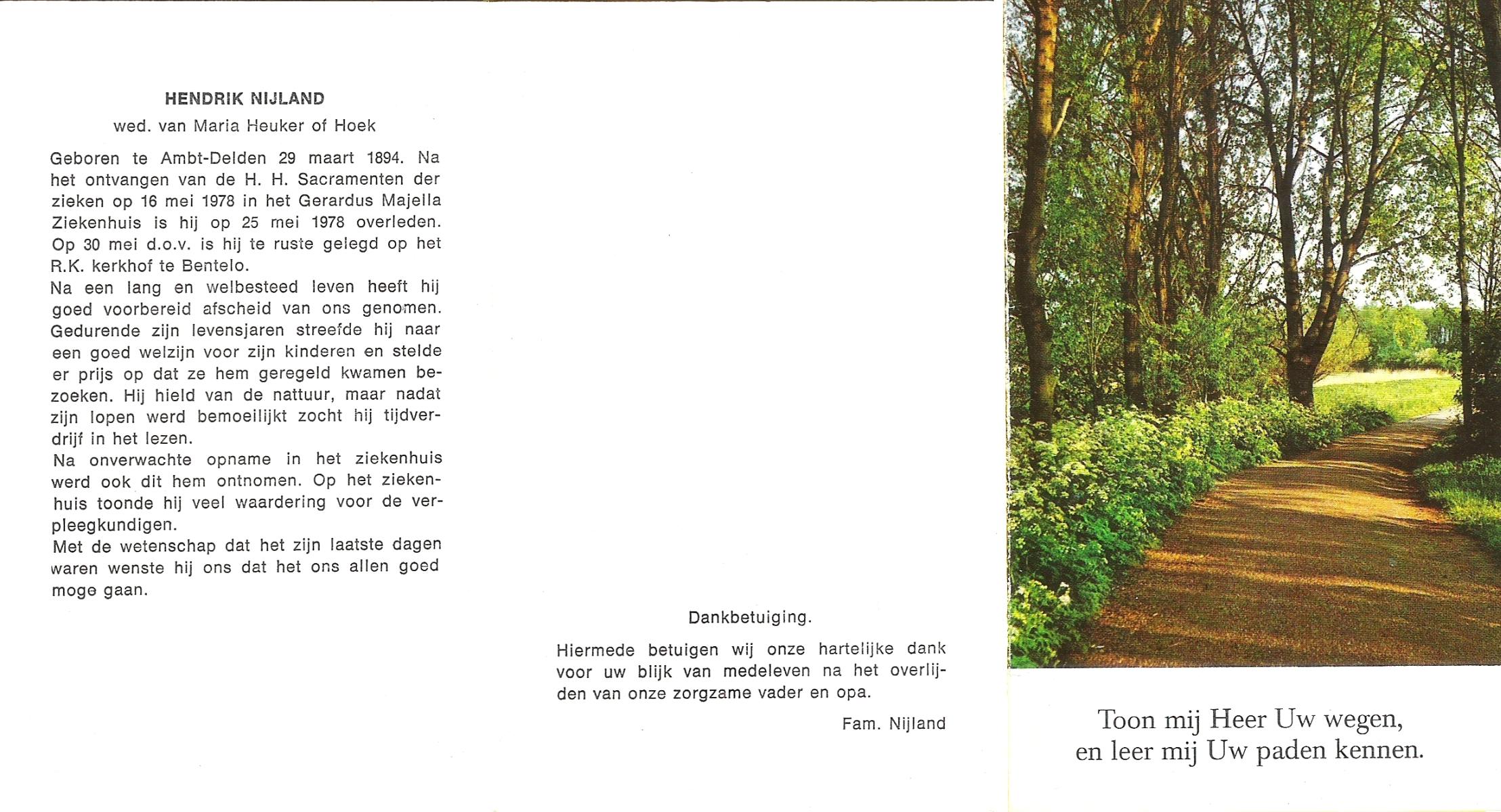 NIJLAND, Hendrik, geboren op 29-03-1894 te Delden, Ambt, overleden op 25-5-1978 op 84-jarige leeftijd, begraven op 30-5-1978 te Bentelo.