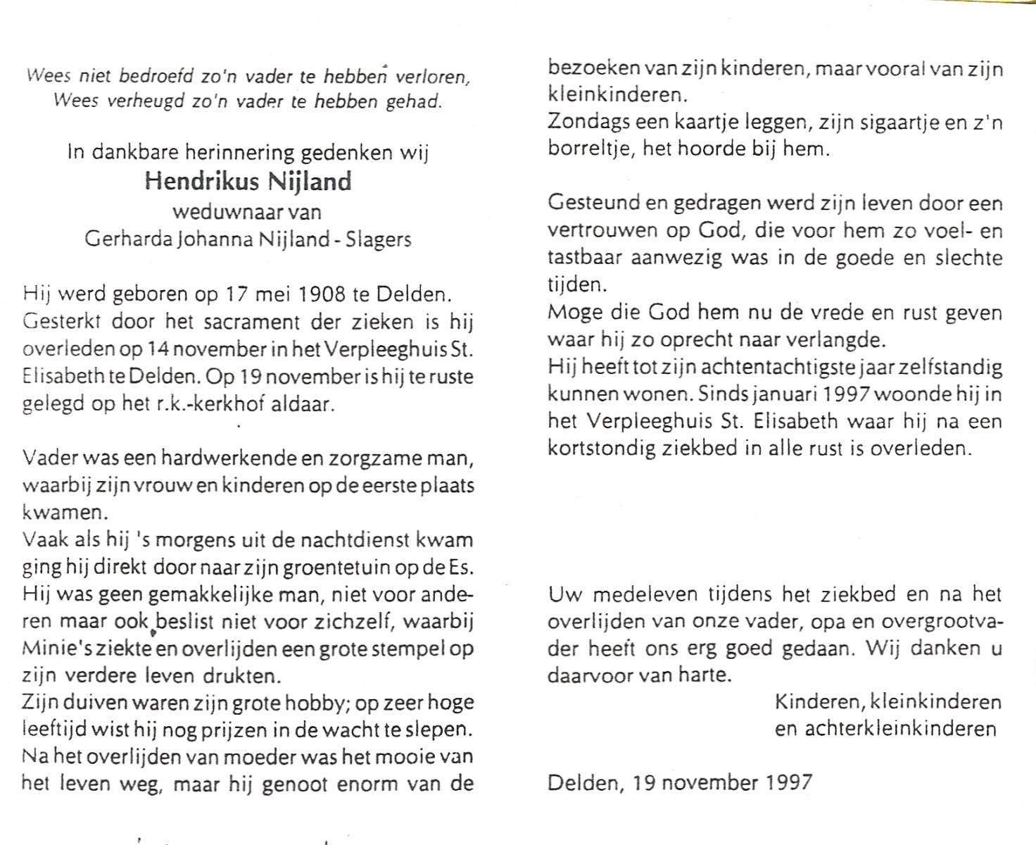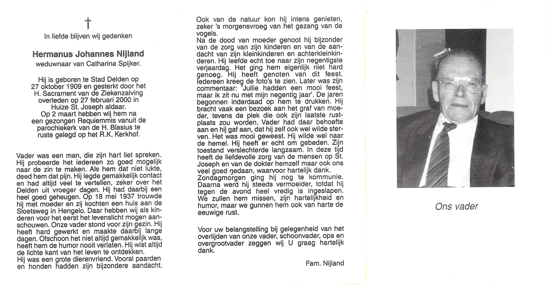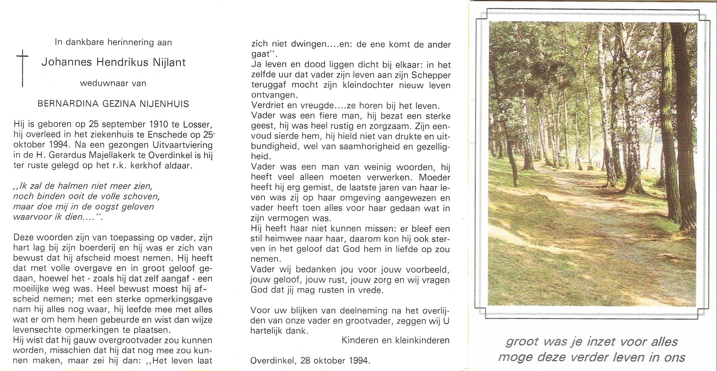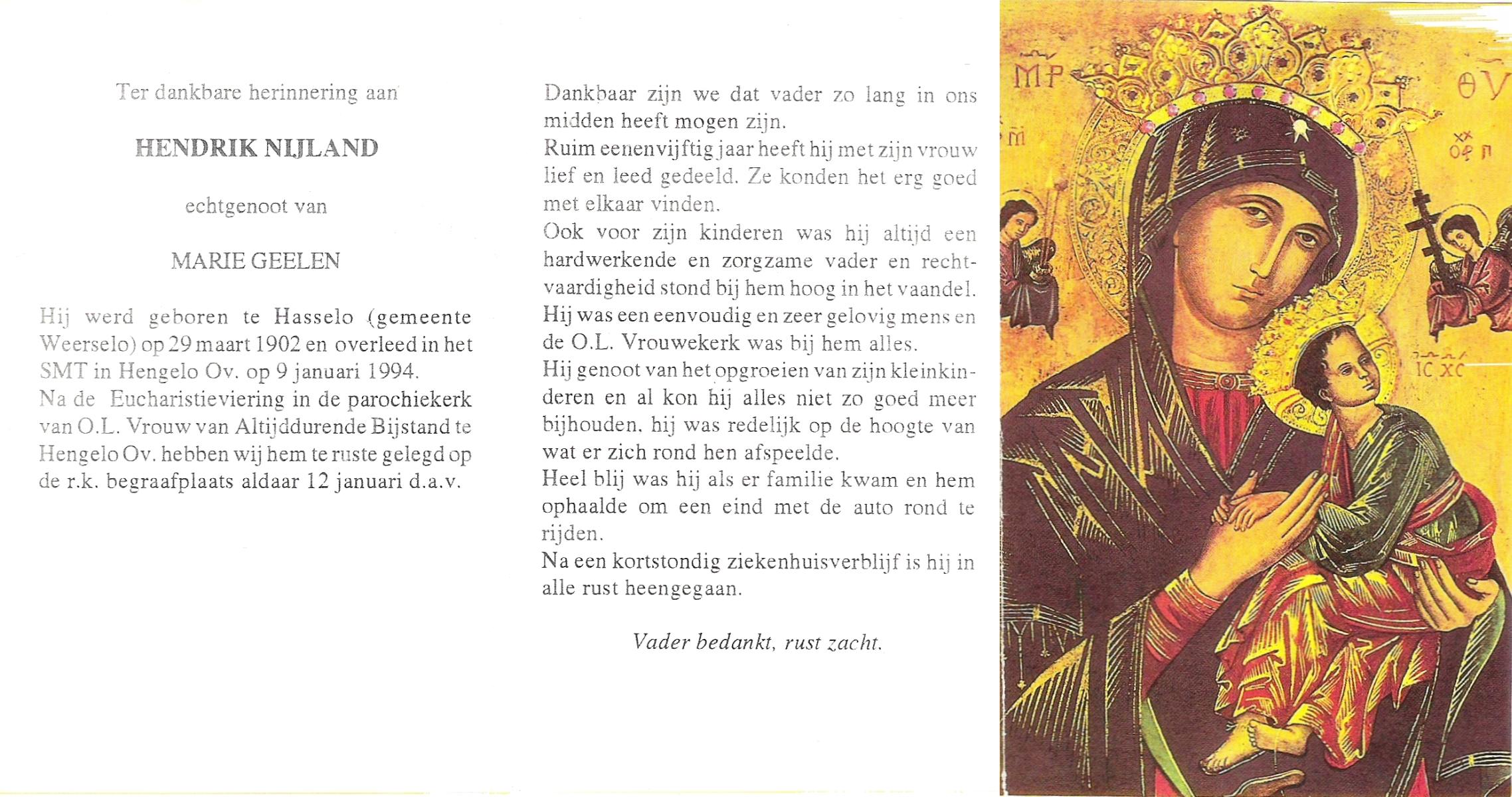 NIJLAND, Hendrik, geboren op 29-3-1902 te Hasselo, overleden op 9-1-1994 te Hengelo (Ov.) op 91-jarige leeftijd, begraven op 12-1-1994 te Hengelo (Ov.).