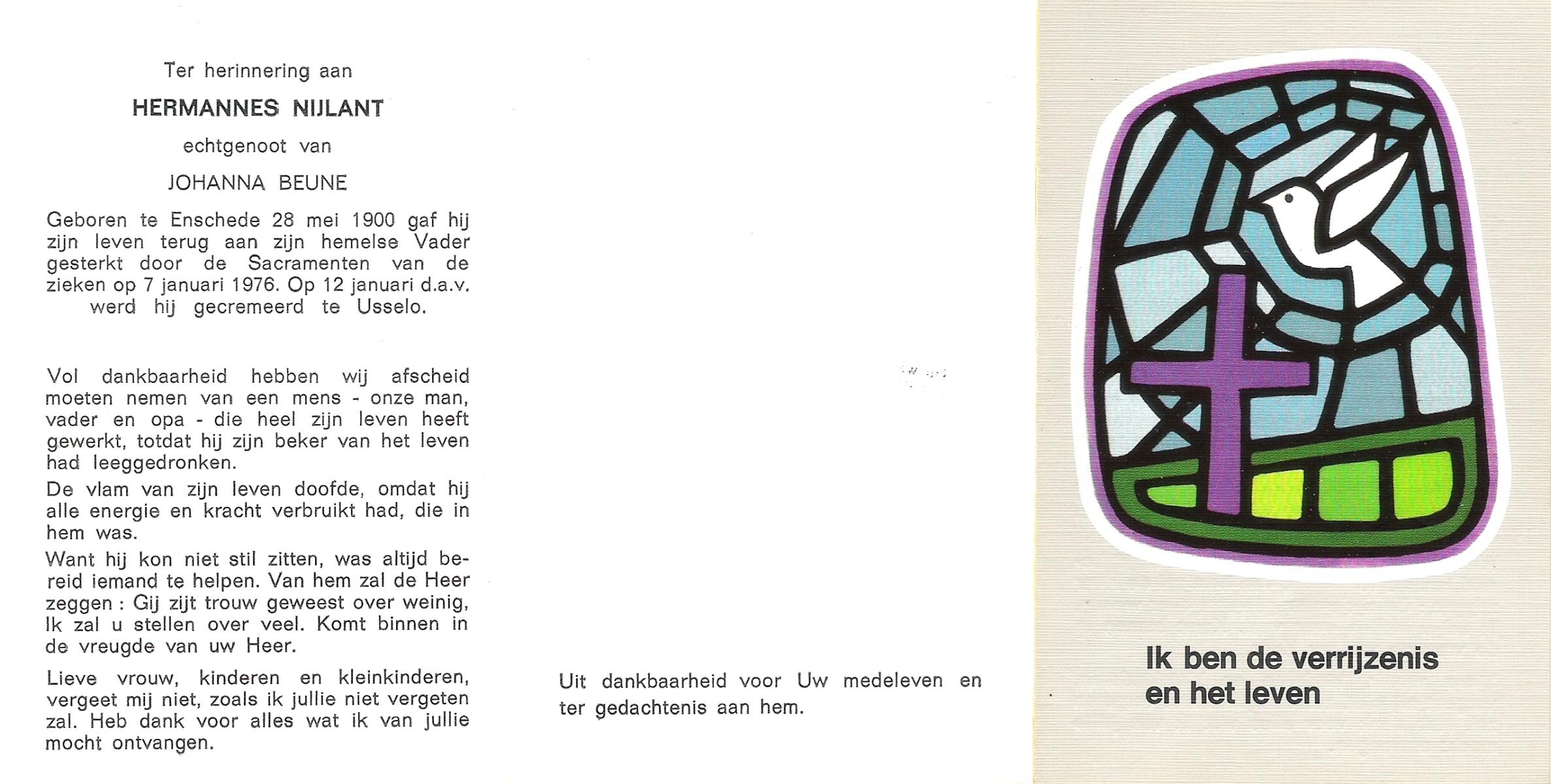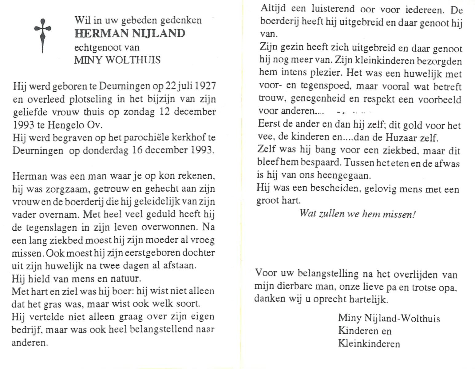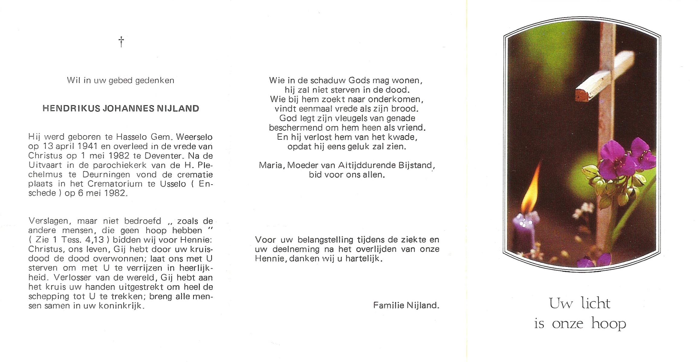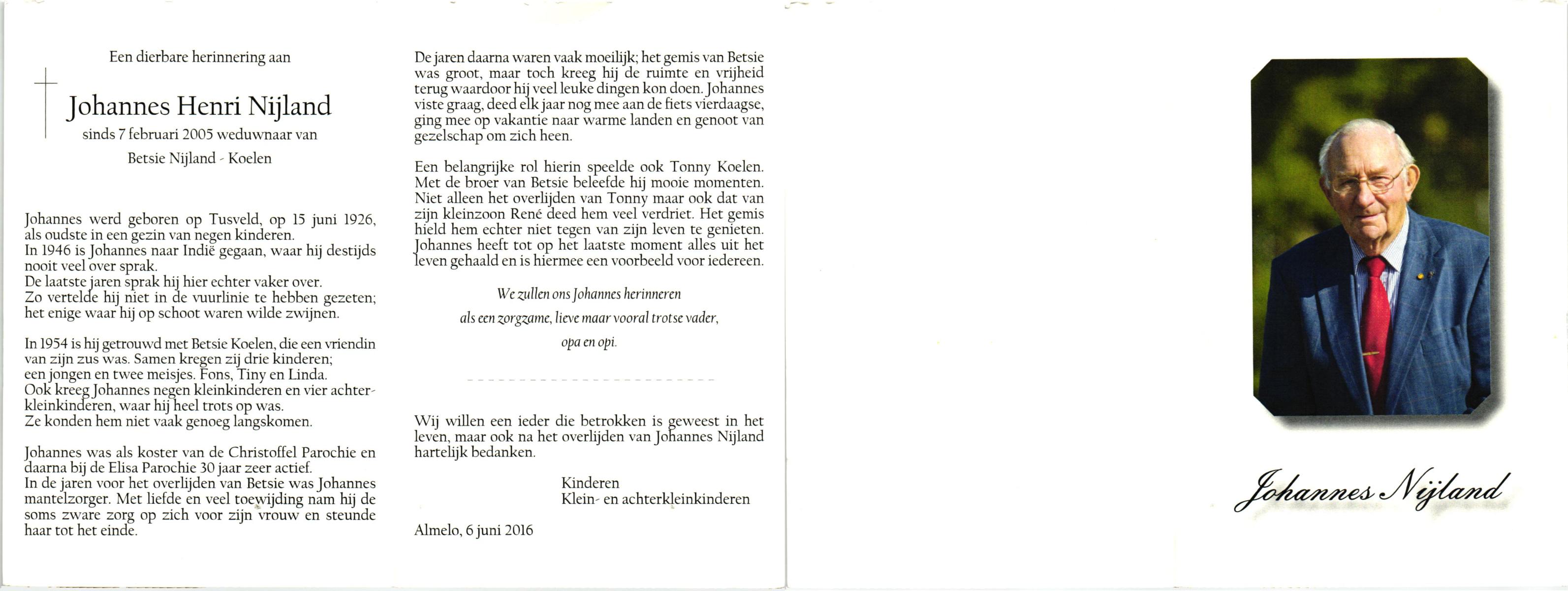 NIJLAND, Hendrik, geboren op 29-3-1902 te Hasselo, overleden op 9-1-1994 te Hengelo (Ov.) op 91-jarige leeftijd, begraven op 12-1-1994 te Hengelo (Ov.).