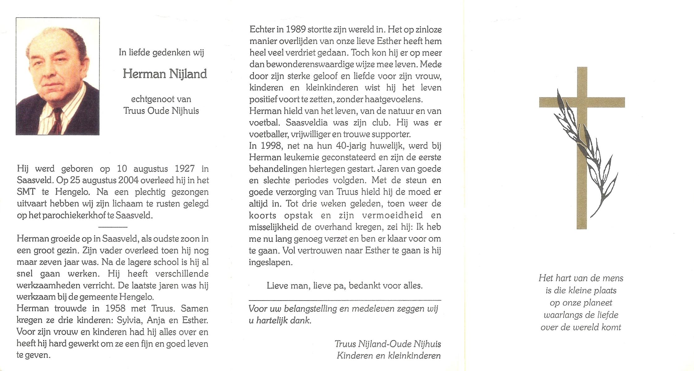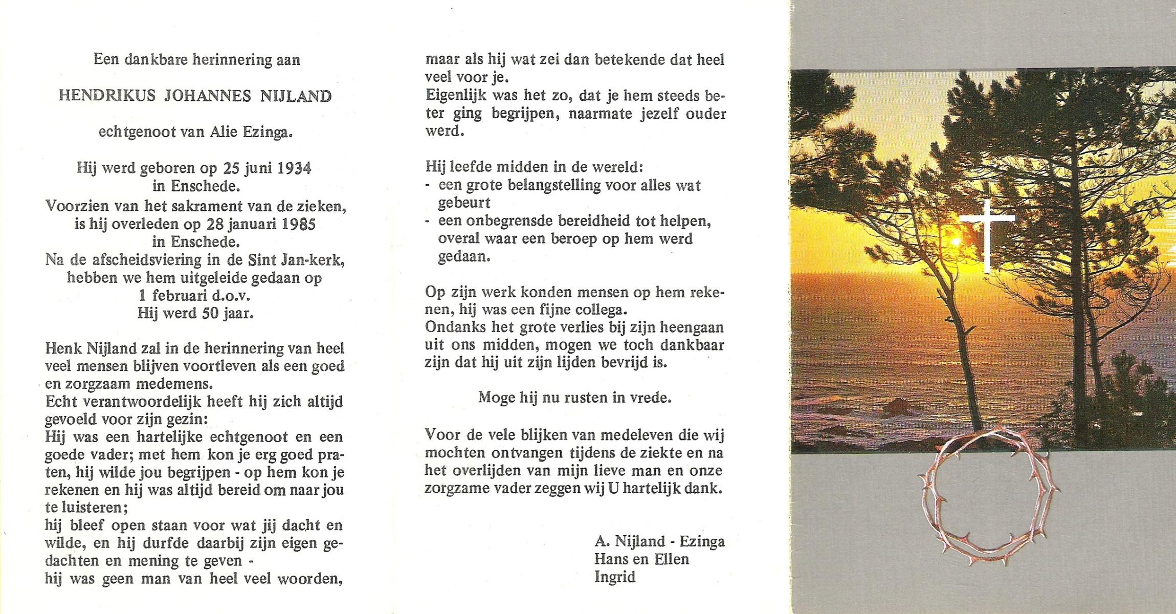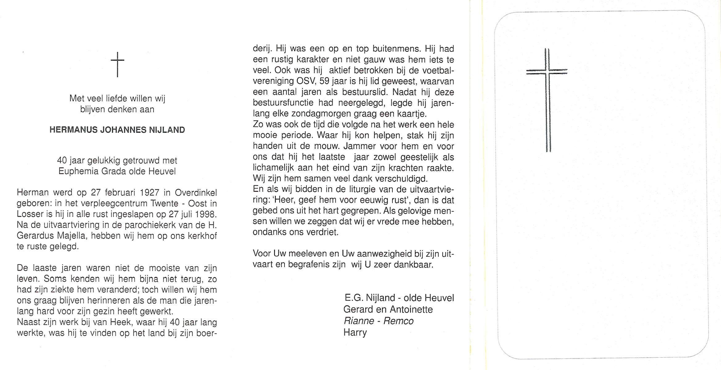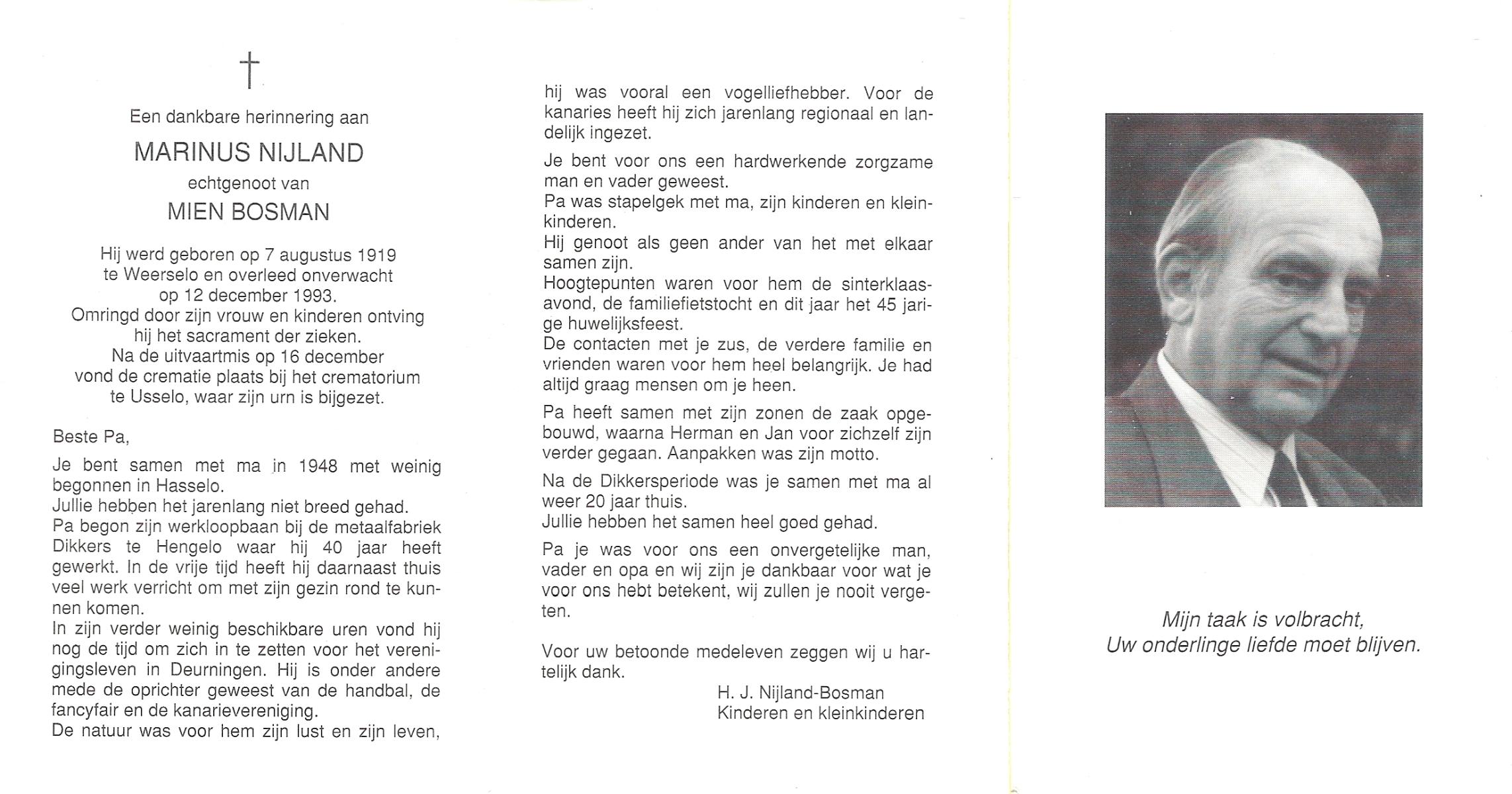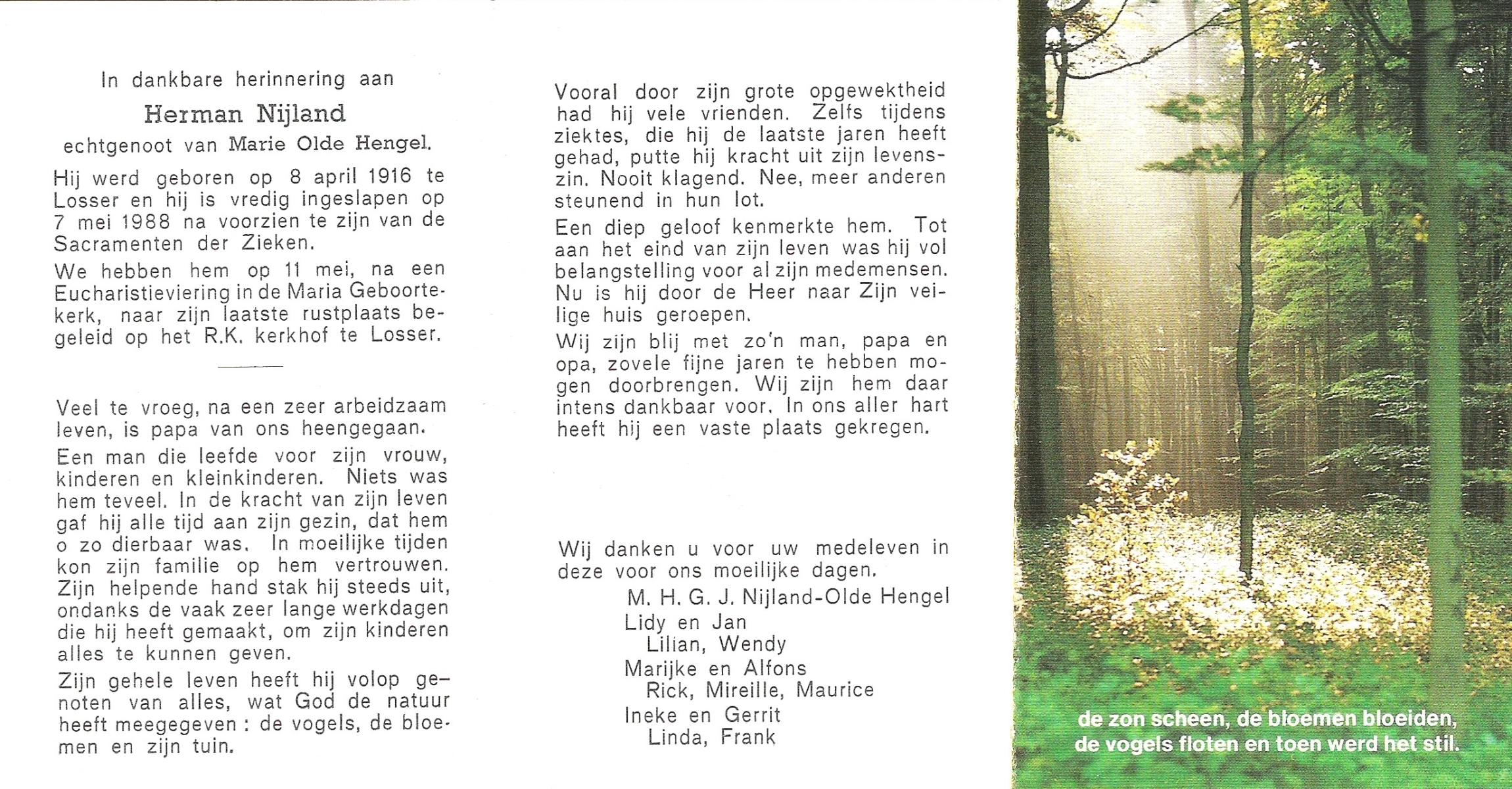 NIJLAND, Hendrik, geboren op 29-3-1902 te Hasselo, overleden op 9-1-1994 te Hengelo (Ov.) op 91-jarige leeftijd, begraven op 12-1-1994 te Hengelo (Ov.).
