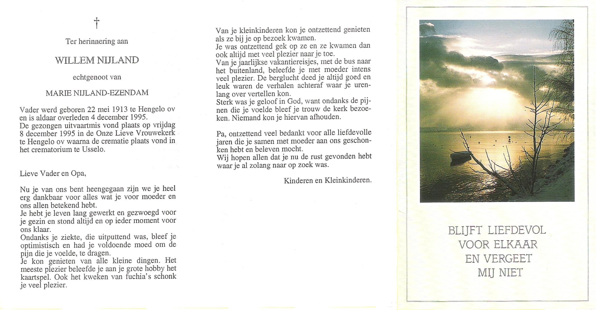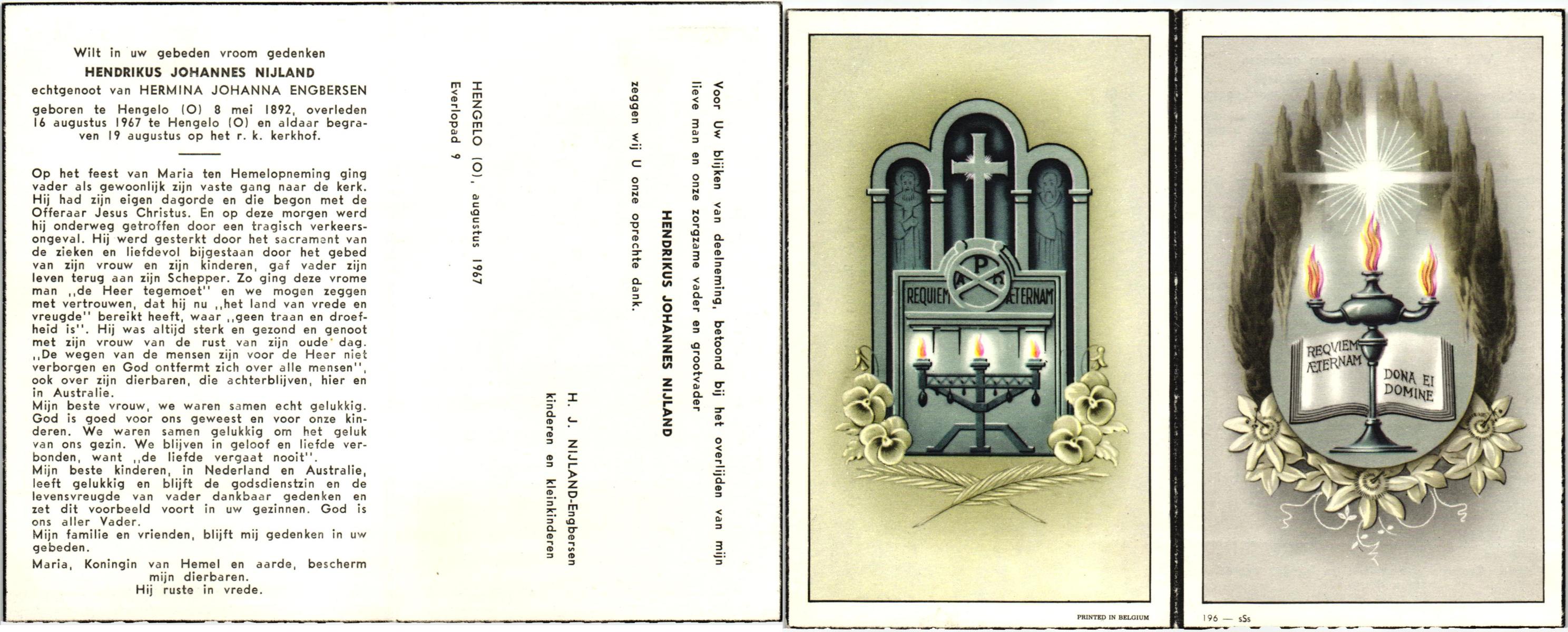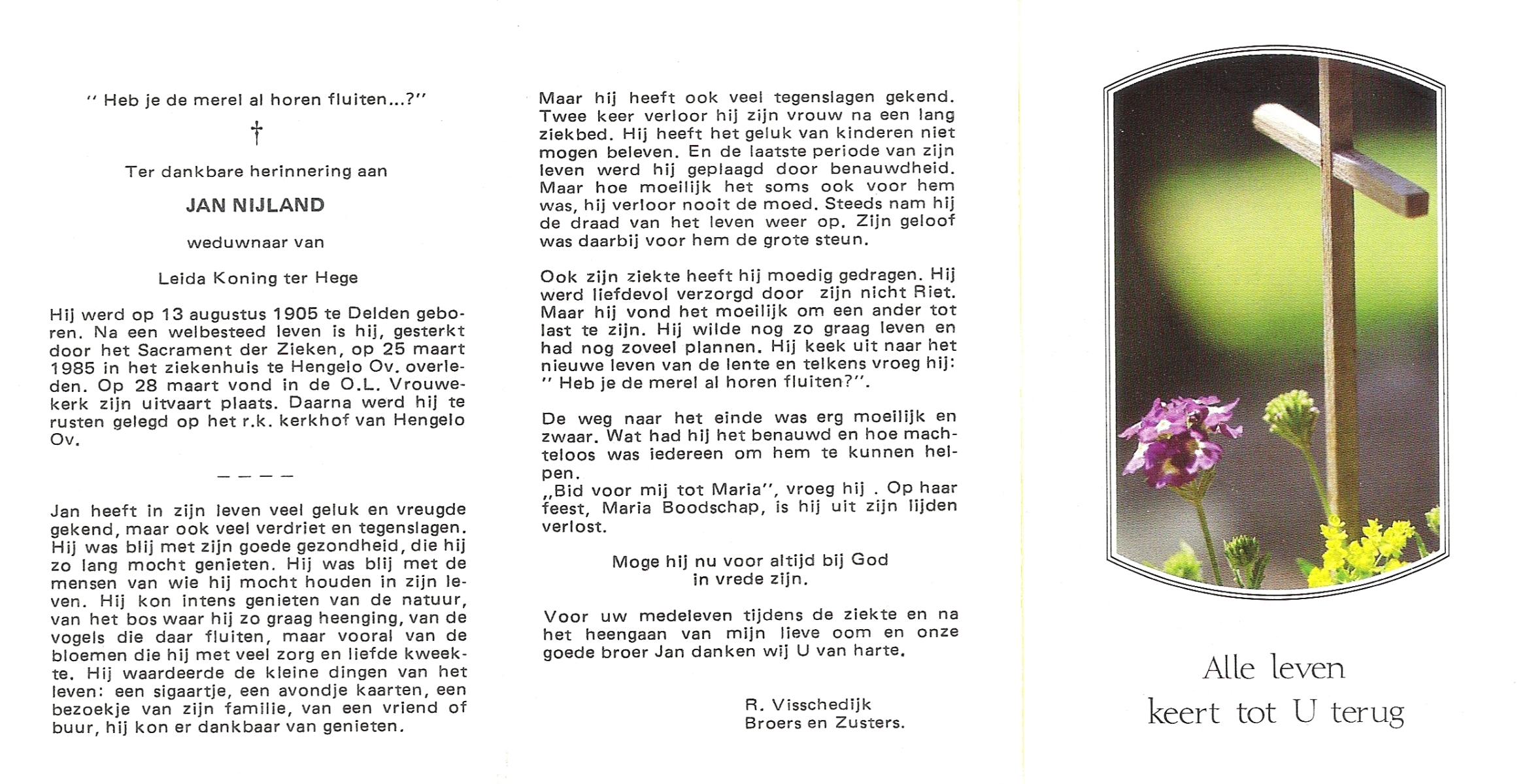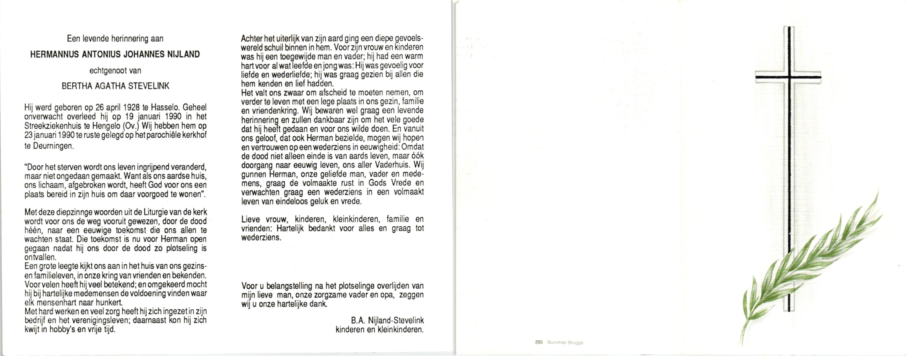 NIJLAND, Hendrik, geboren op 29-3-1902 te Hasselo, overleden op 9-1-1994 te Hengelo (Ov.) op 91-jarige leeftijd, begraven op 12-1-1994 te Hengelo (Ov.).