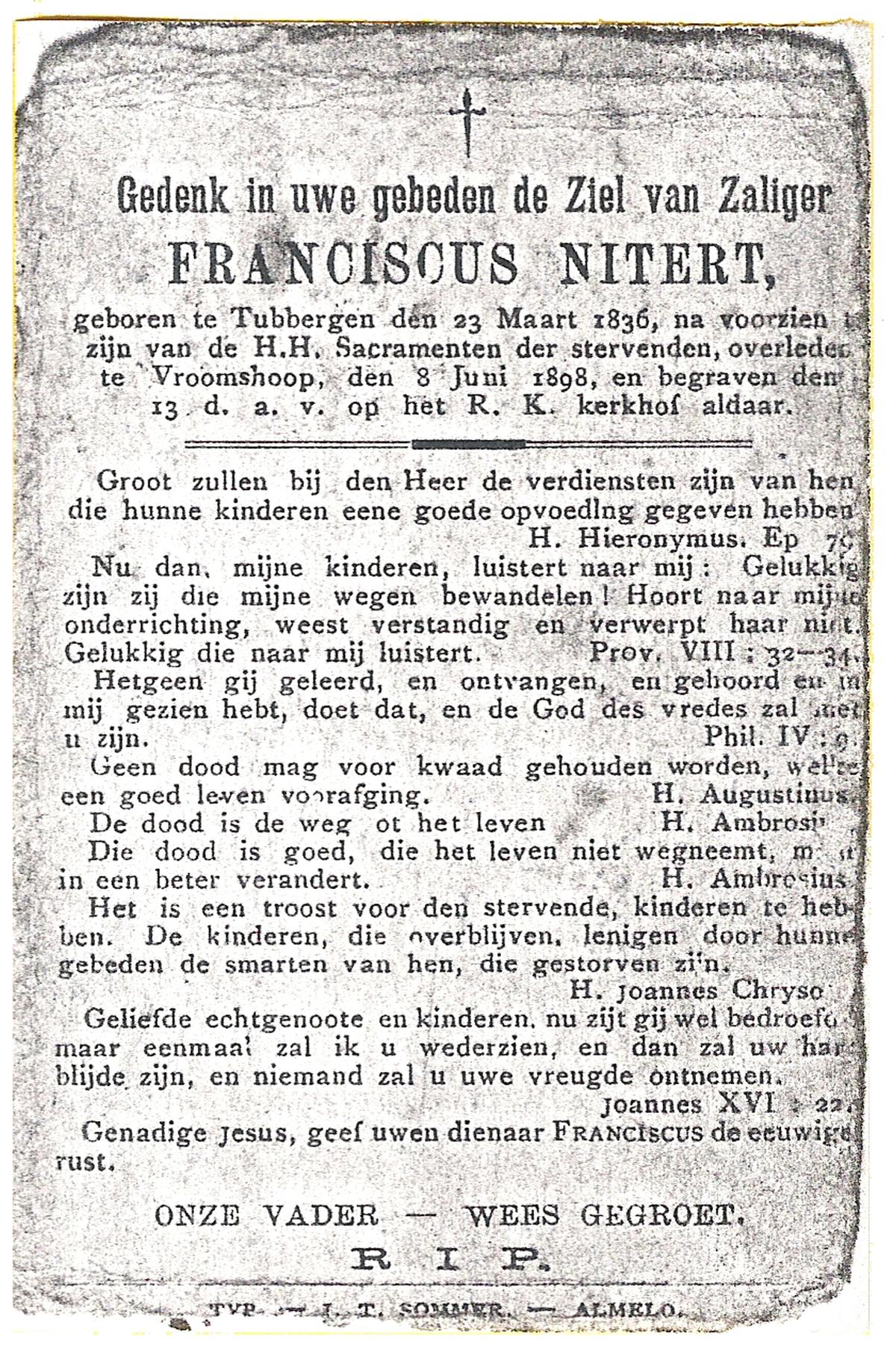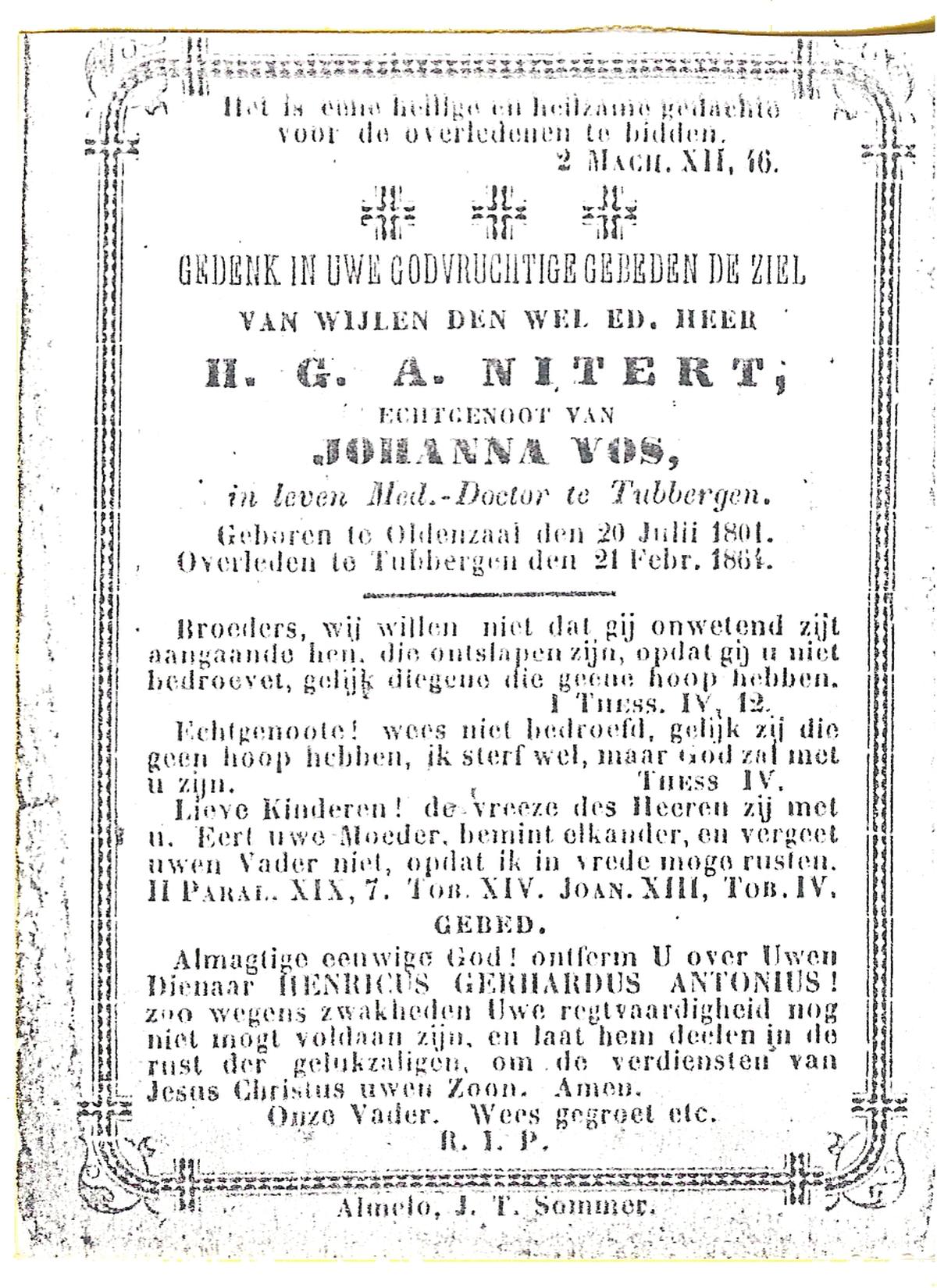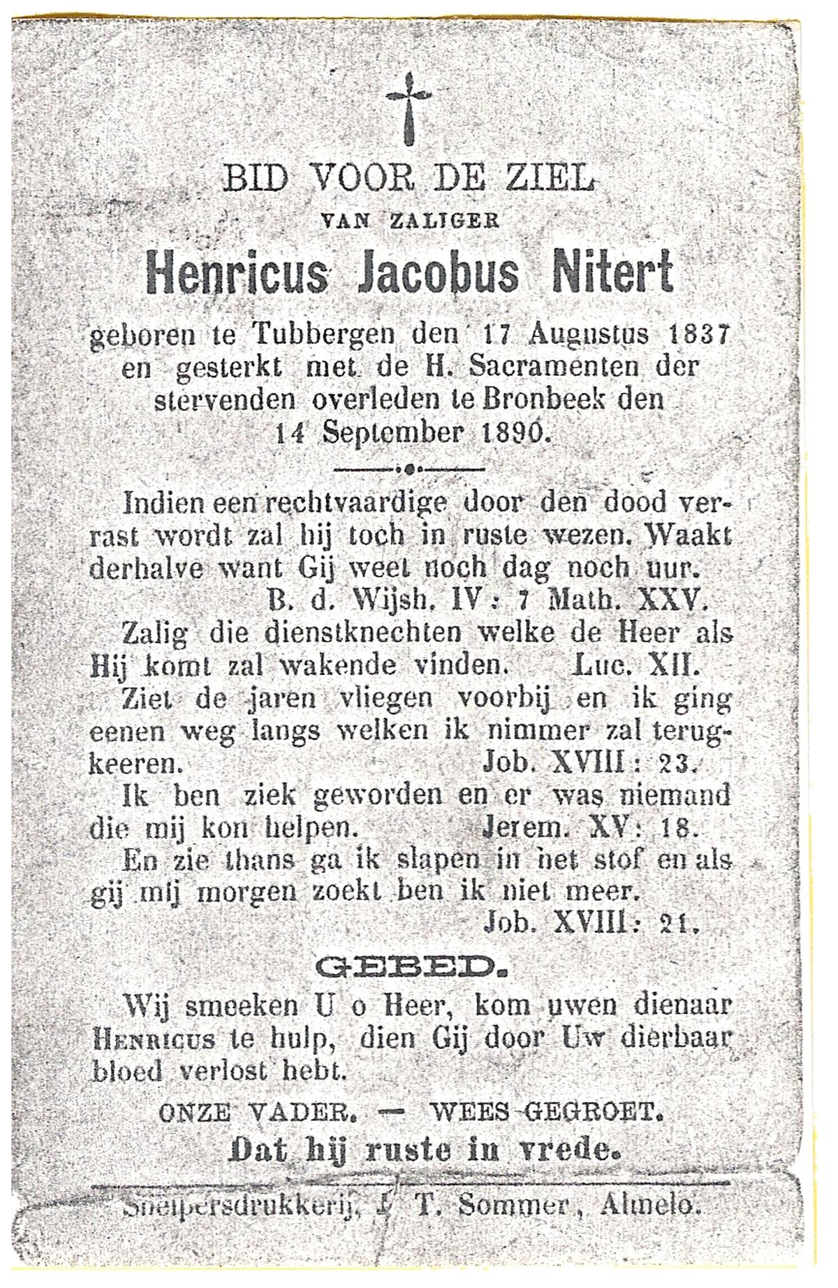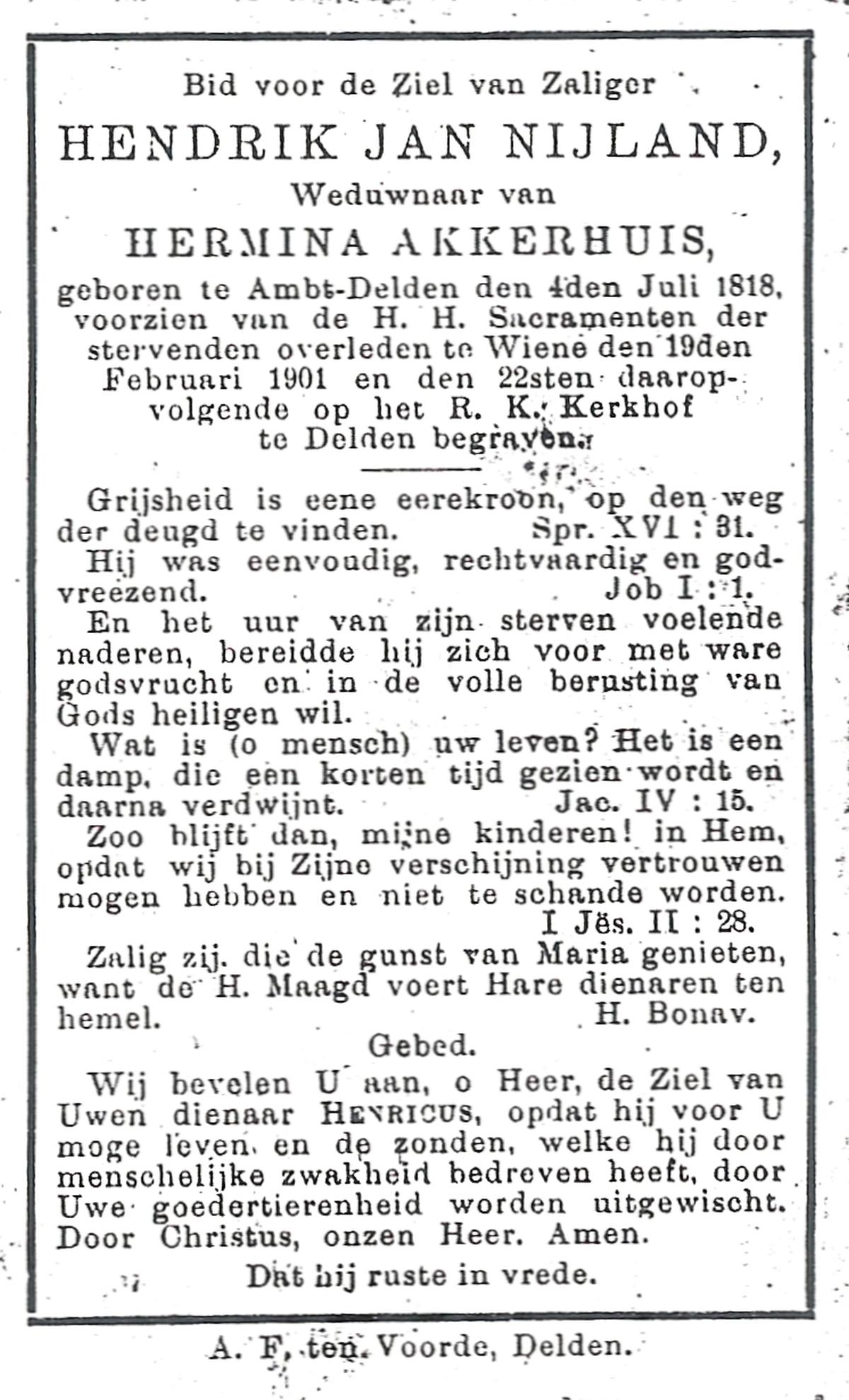 NIJLAND, Hendrik Jan, geboren op 04-07-1818 te Delden, Ambt, overleden op 19-2-1901 te Wiene op 82-jarige leeftijd, begraven op 22-2-1901 te Delden.