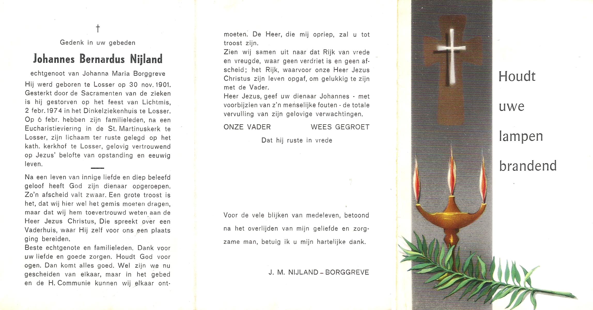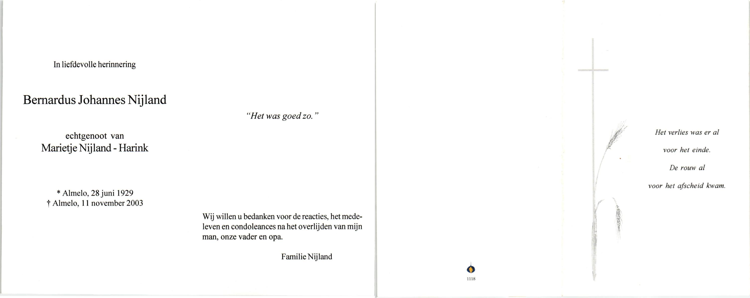 NIJLAND, Bernardus Johannes, geboren op 28-6-1929 te Almelo, overleden op 11-11-2003 te Almelo op 74-jarige leeftijd.