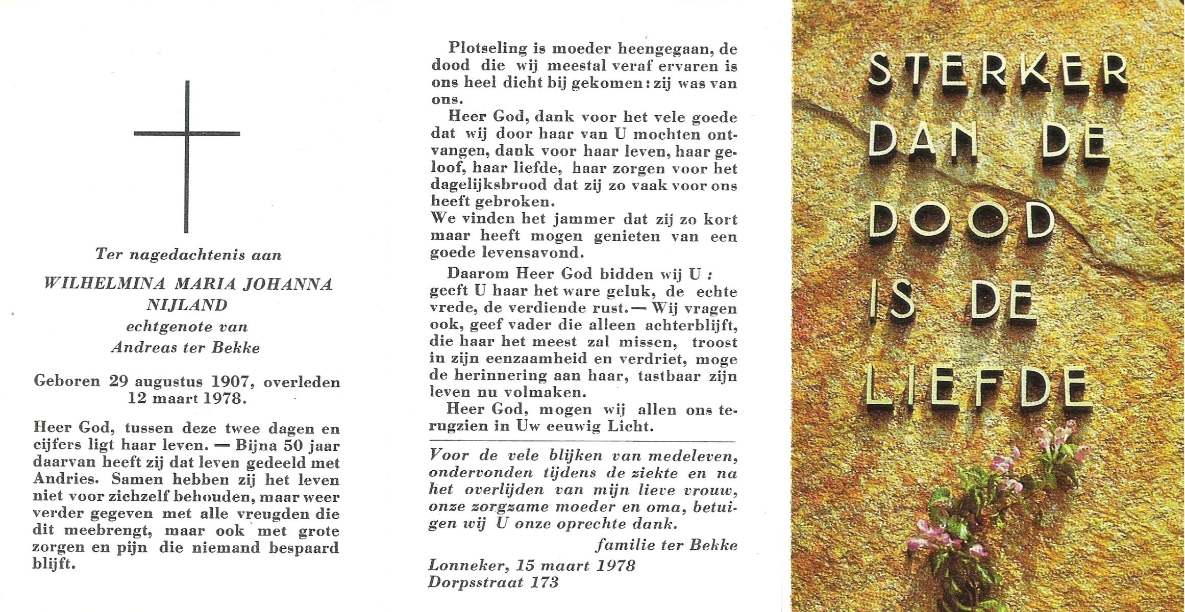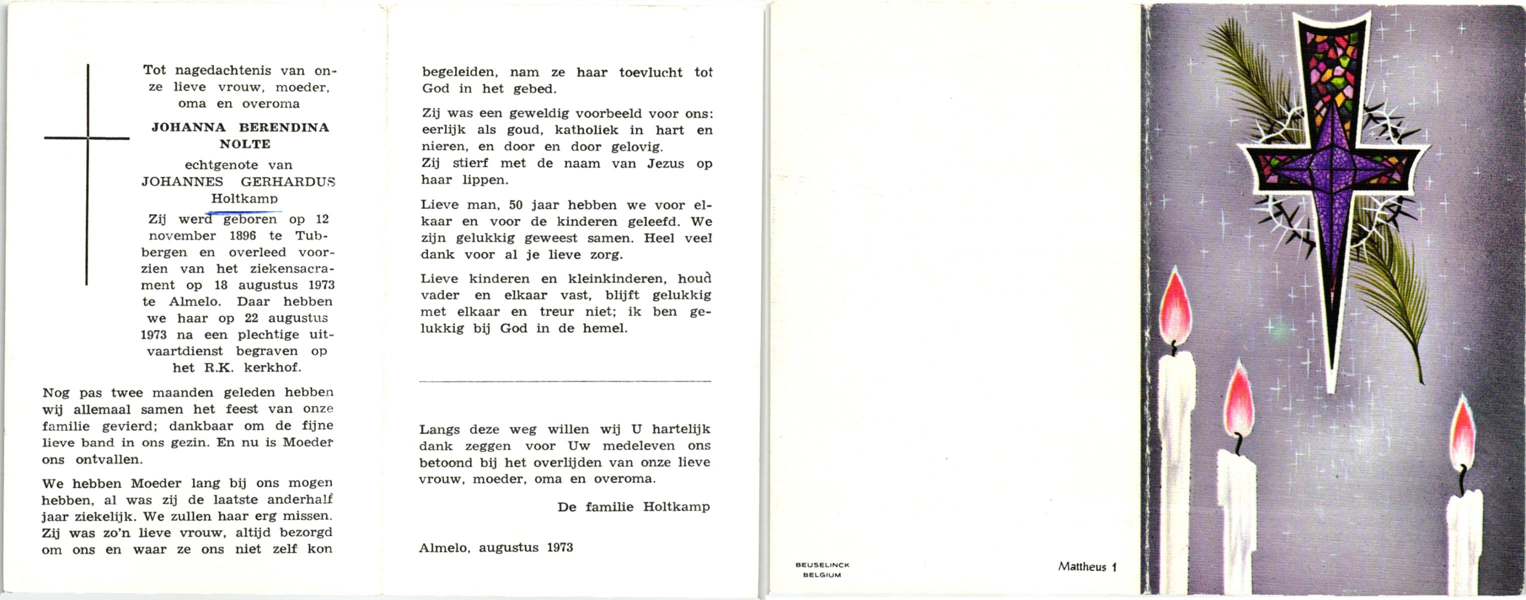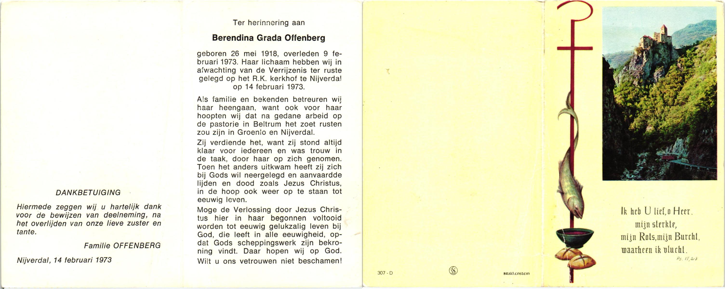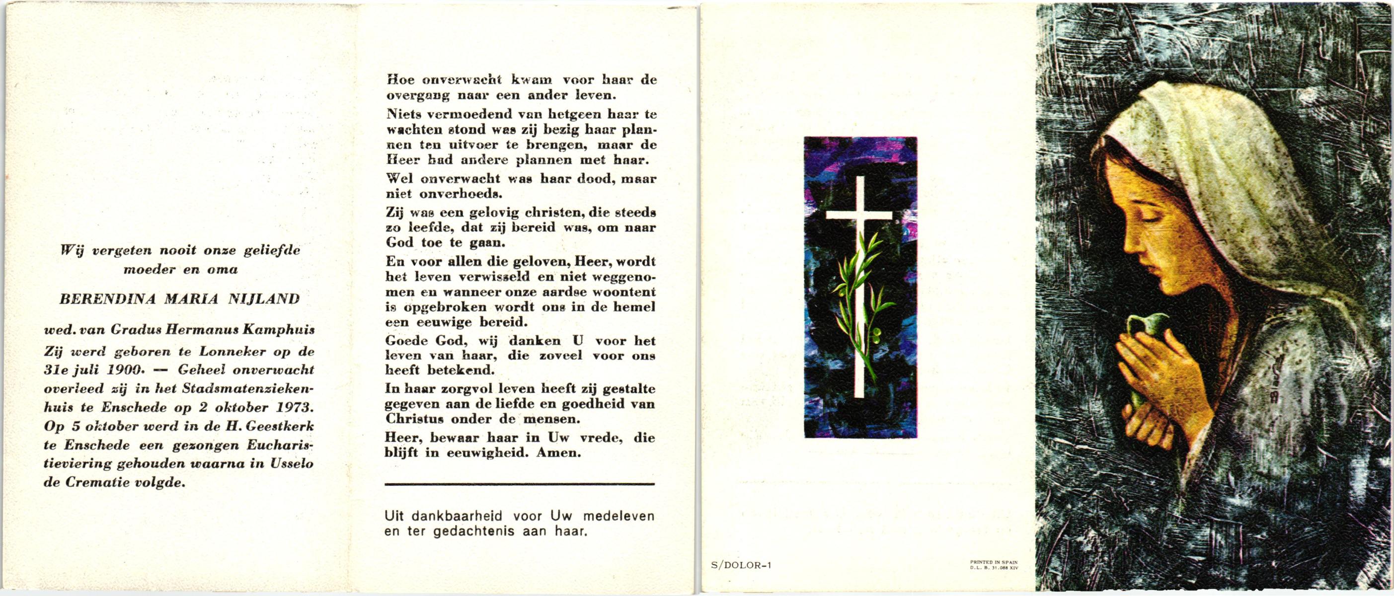 NIJLAND, Berendina Maria, geboren op 31-7-1900 te Lonneker, overleden op 2-10-1973 te Enschede, ziekenhuis op 73-jarige leeftijd, gecremeerd op 5-10-1973 te Usselo.
