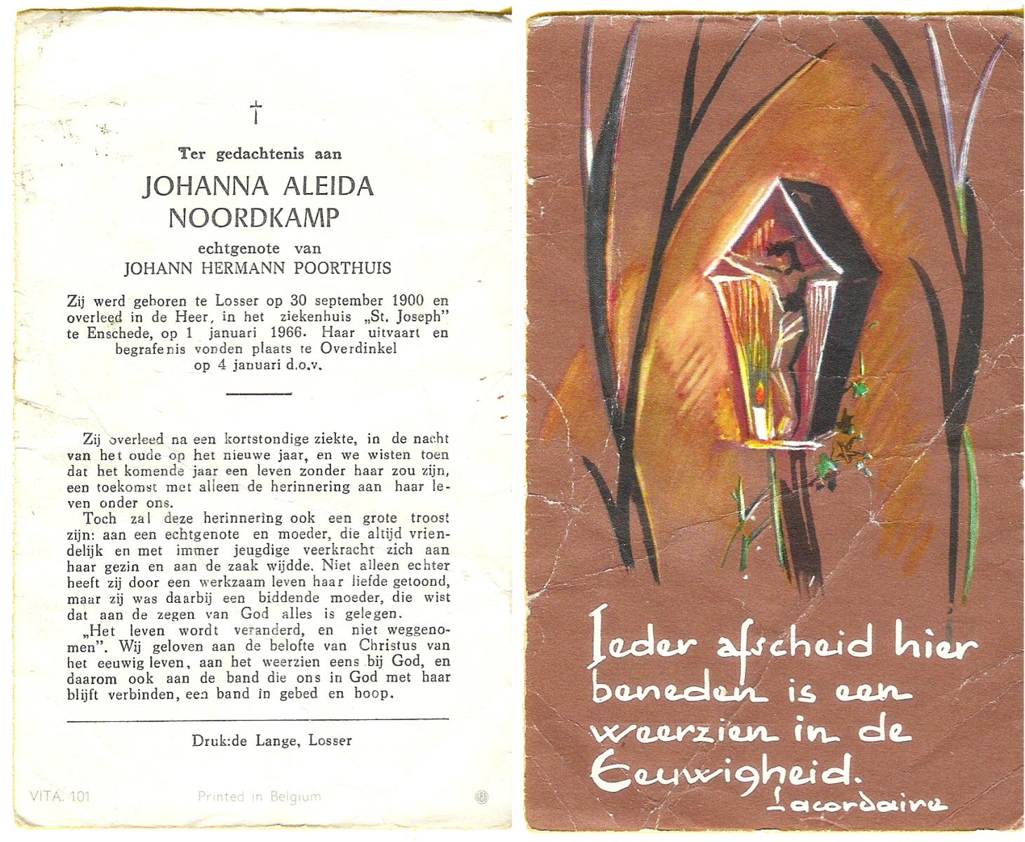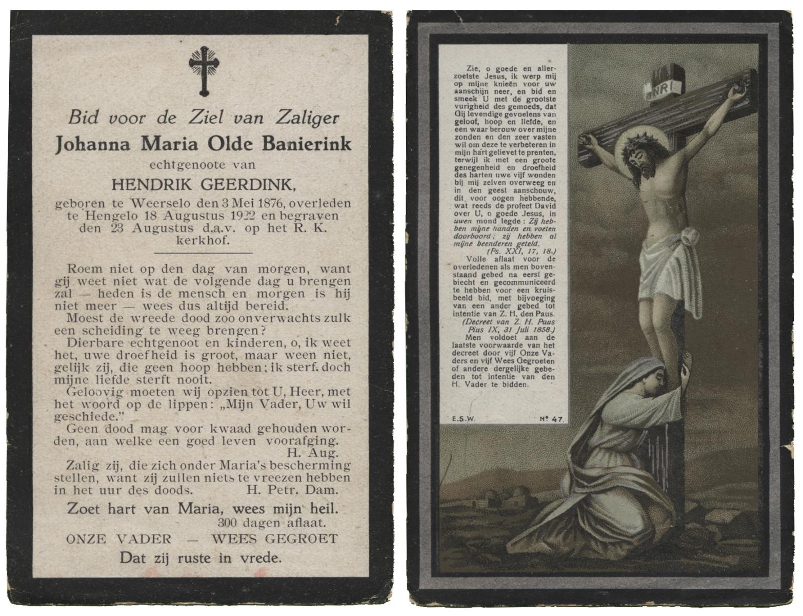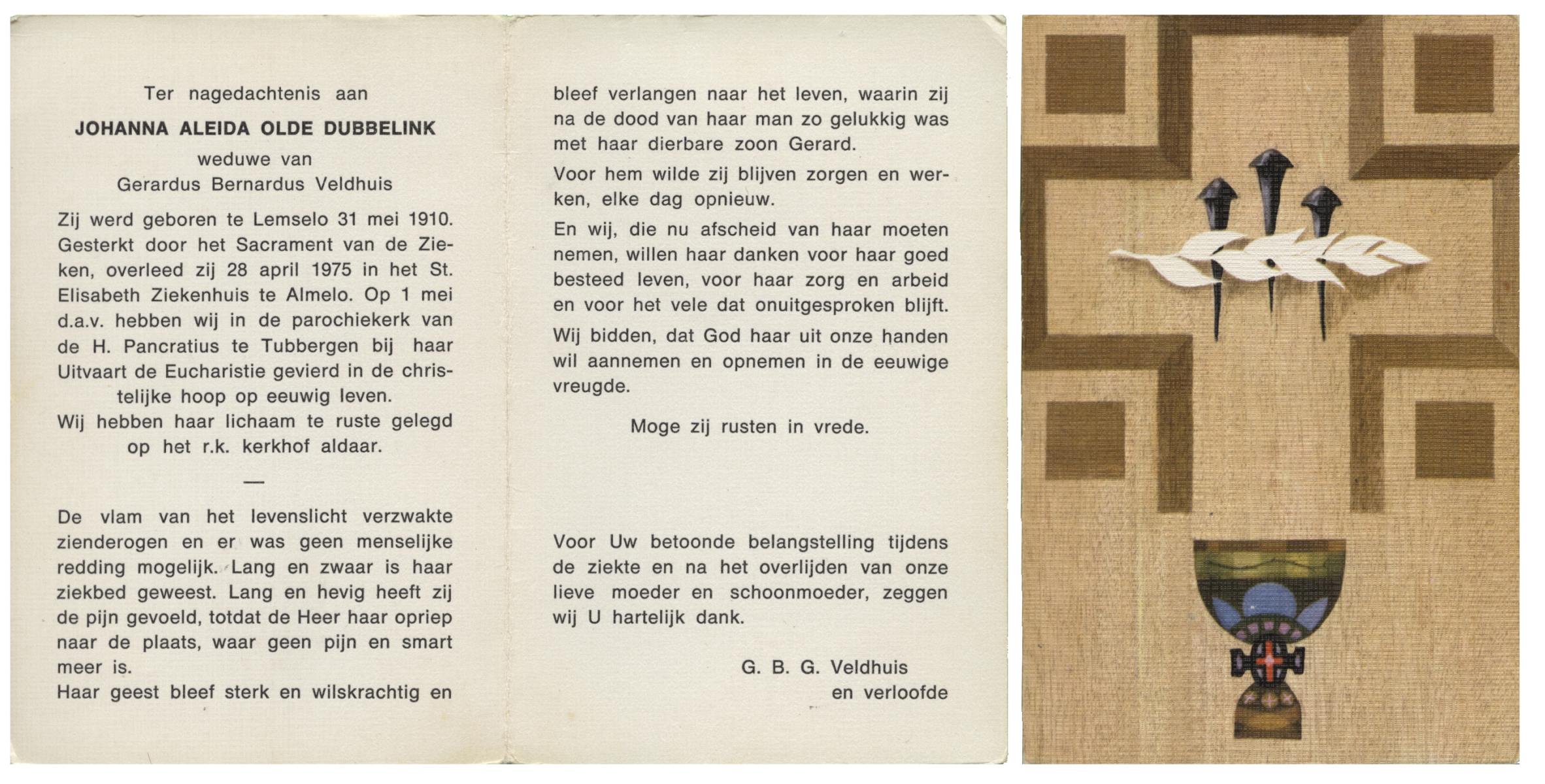 OLDE DUBBELINK, Johanna Aleida, geboren op 31-5-1910 te Lemselo, overleden op 28-4-1975 te Almelo op 64-jarige leeftijd, begraven op 1-5-1975 te Tubbergen.