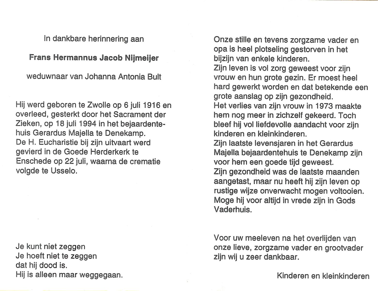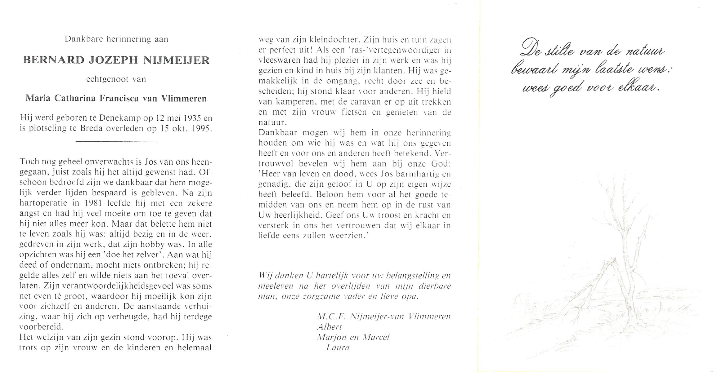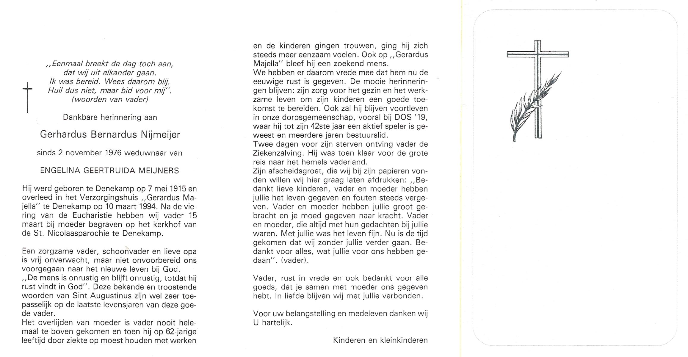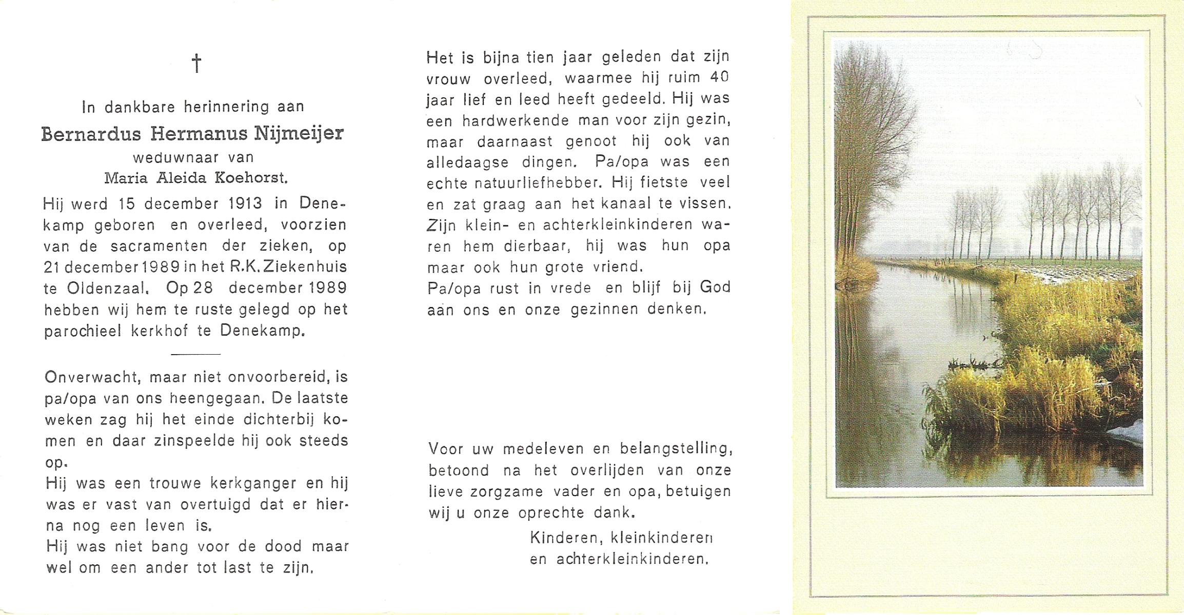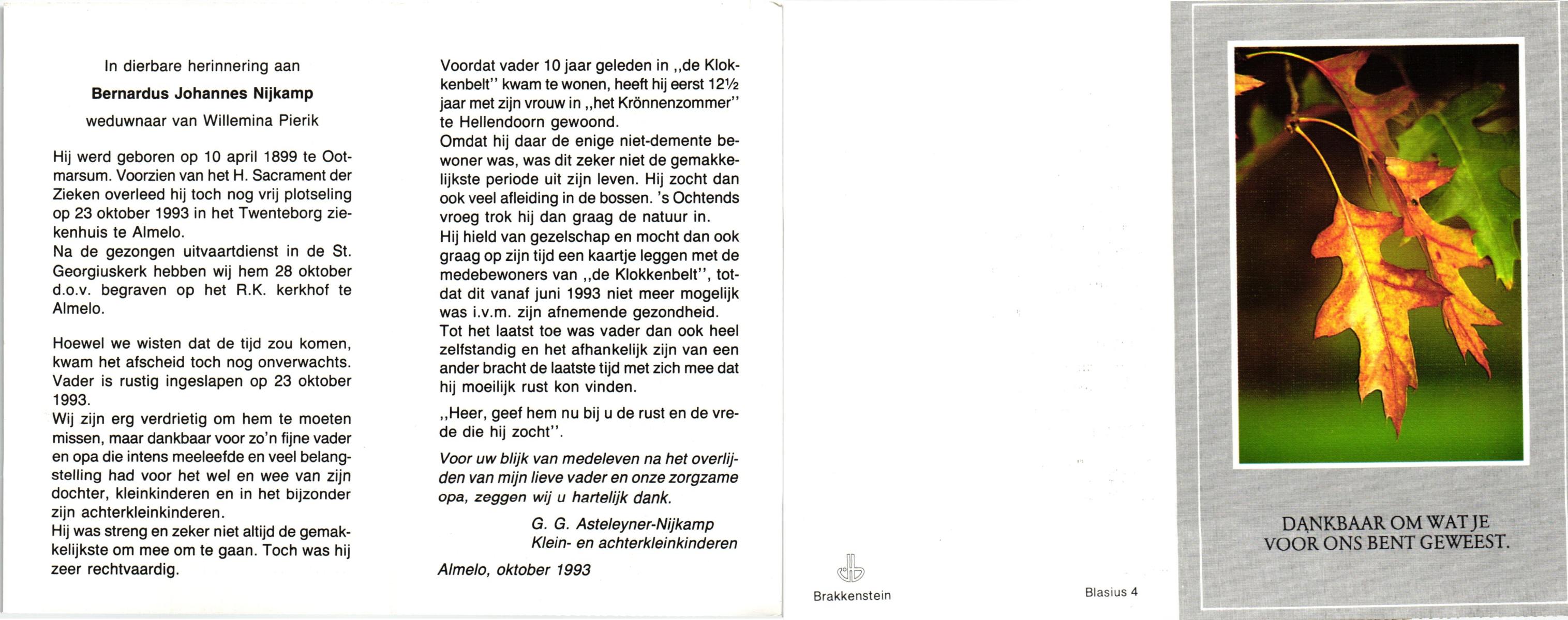 NIJKAMP, Bernardus Johannes, geboren op 10-04-1899 te Ootmarsum, overleden op 23-10-1993 te Almelo, ziekenhuis op 94-jarige leeftijd, begraven op 28-10-1993 te Almelo.