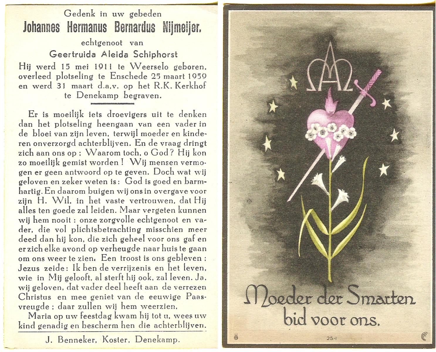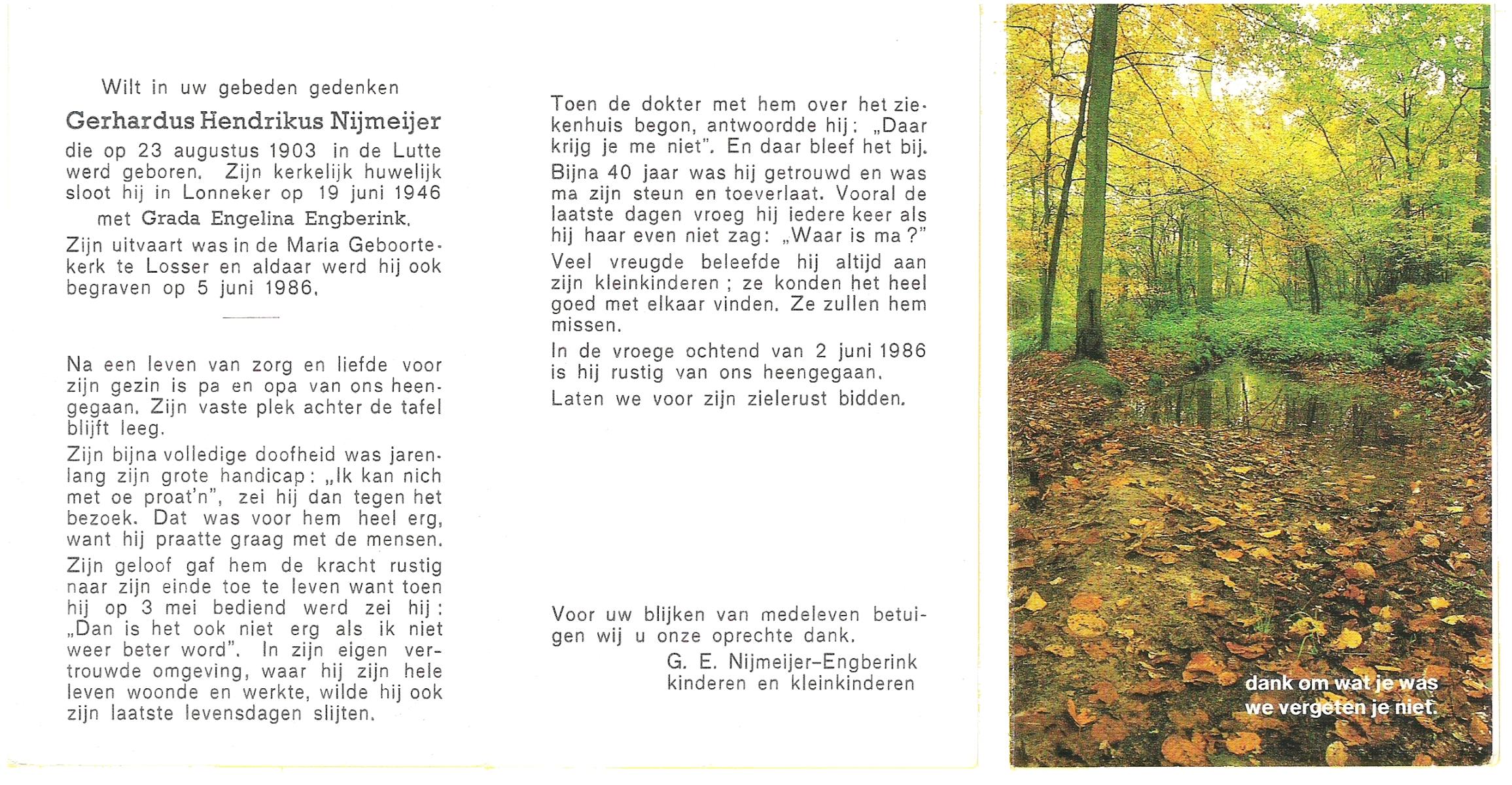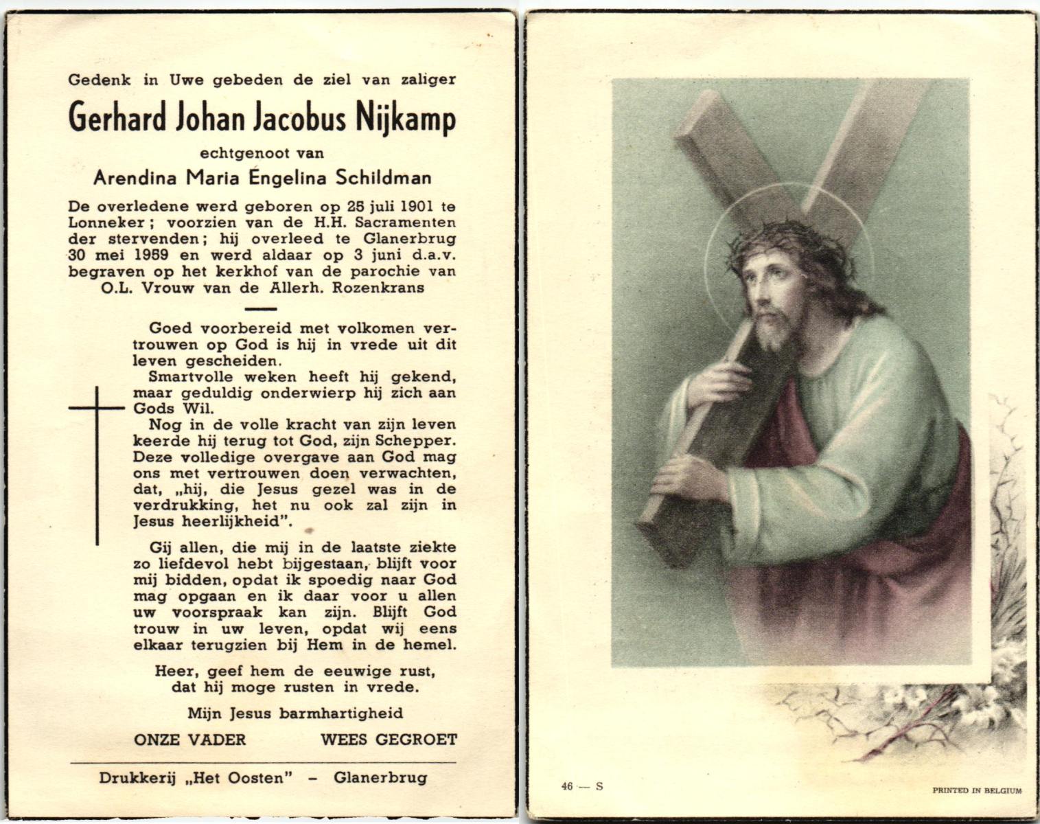 NIJKAMP, Gerhard Johan Jacobus, geboren op 25-7-1901 te Lonneker, overleden op 30-5-1959 te Glanerbrug op 57-jarige leeftijd, begraven op 3-6-1959 te Glanerbrug.