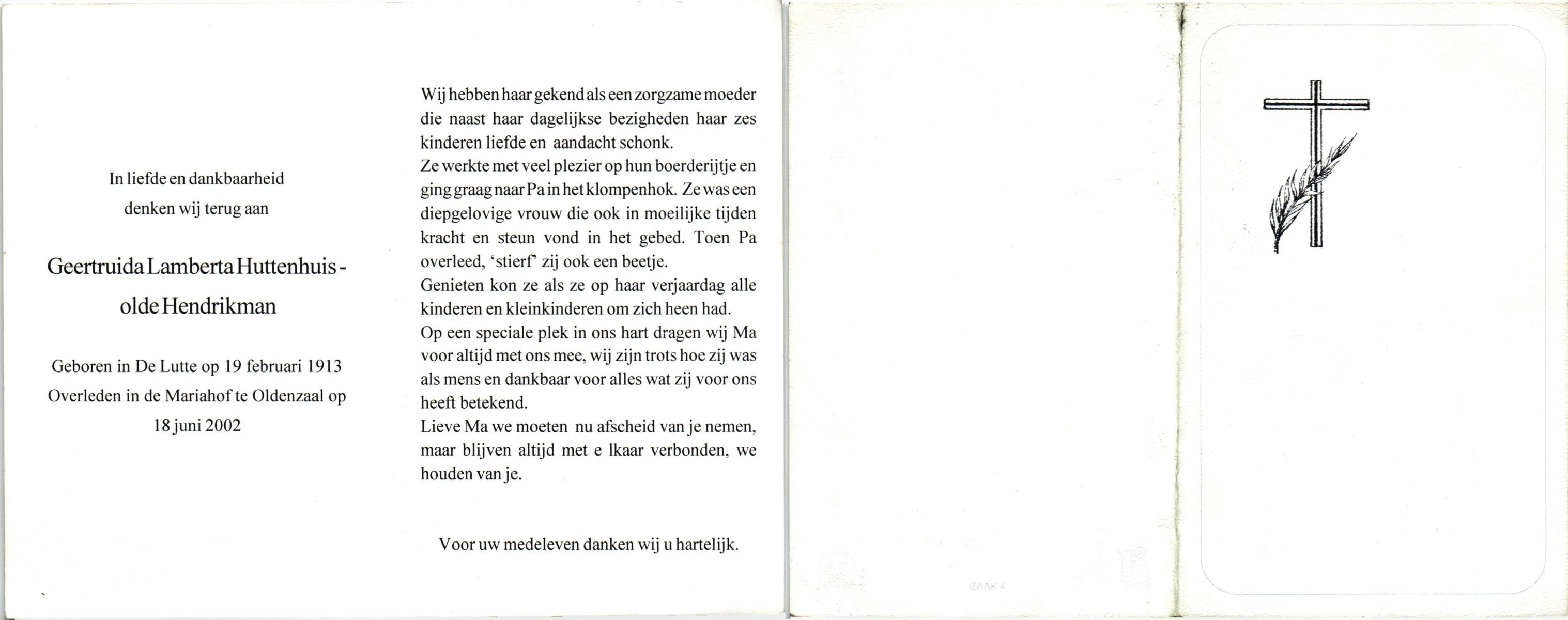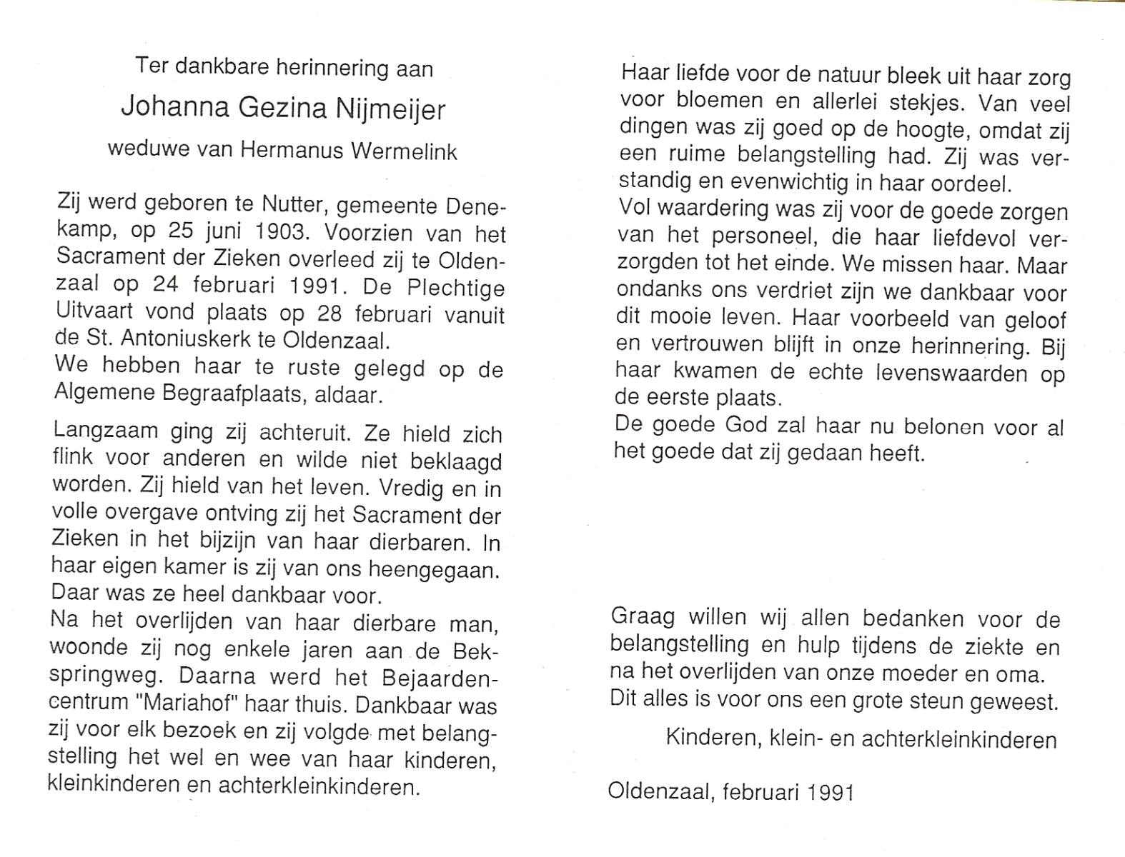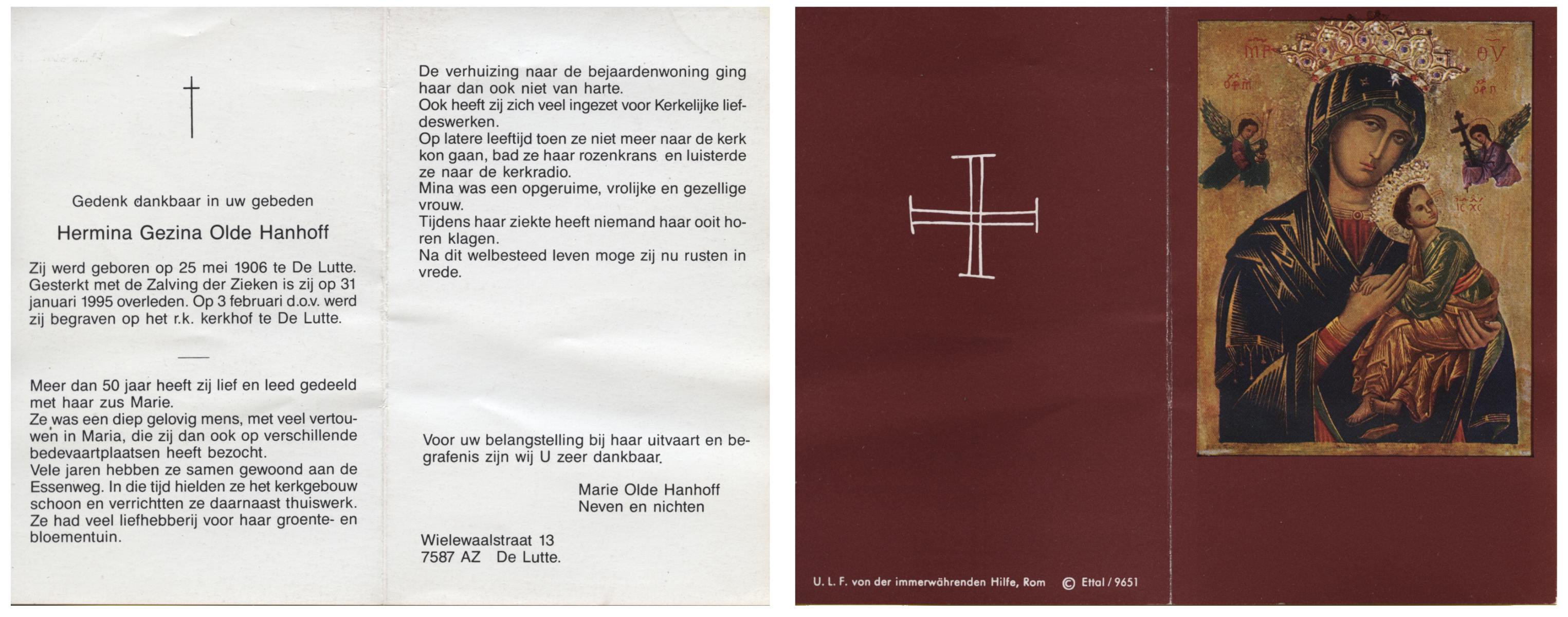 OLDE HANHOFF, Hermina Gezina, geboren op 25-5-1906 te De Lutte, overleden op 31-1-1995 op 88-jarige leeftijd, begraven op 3-2-1995 te De Lutte.