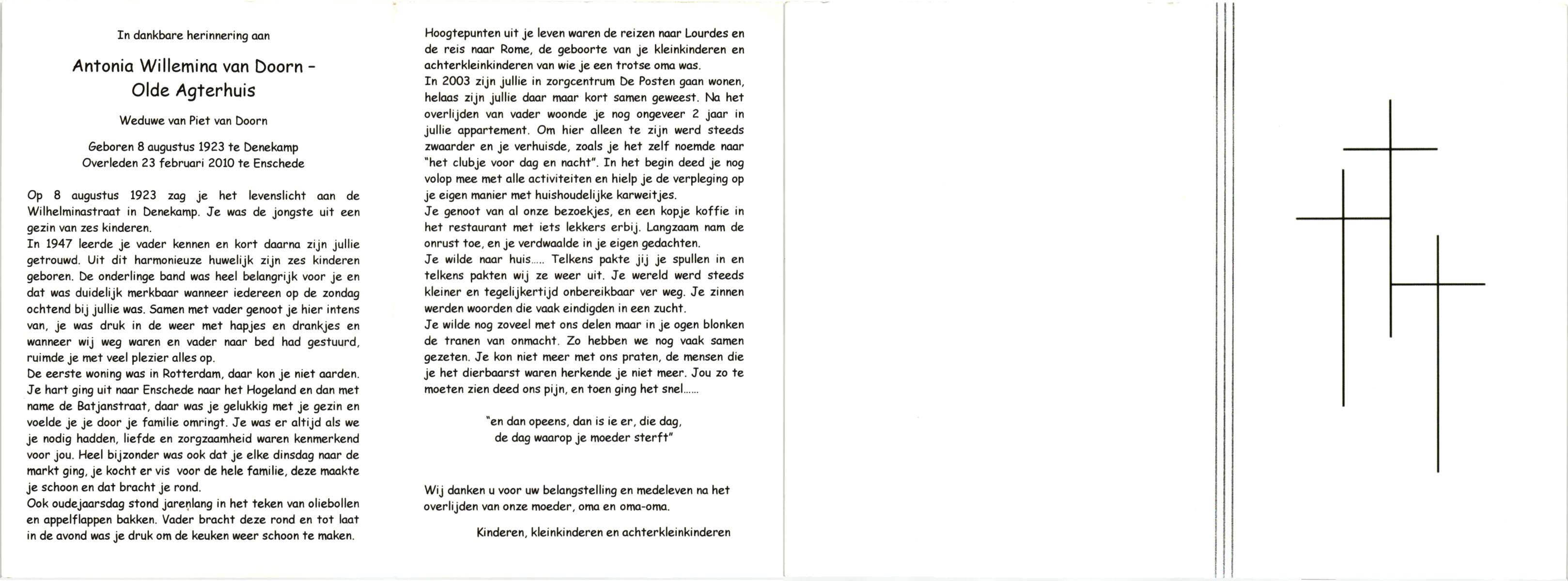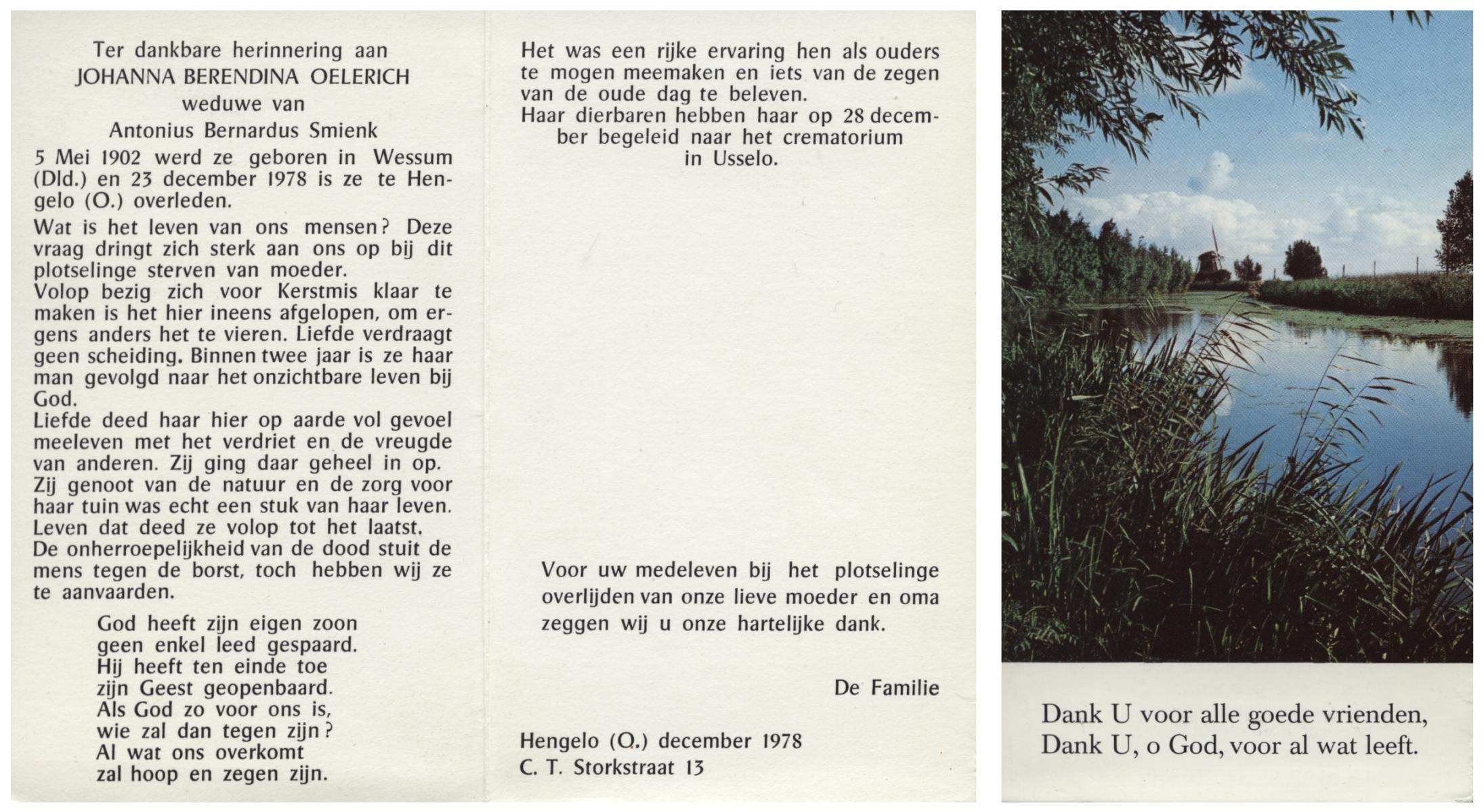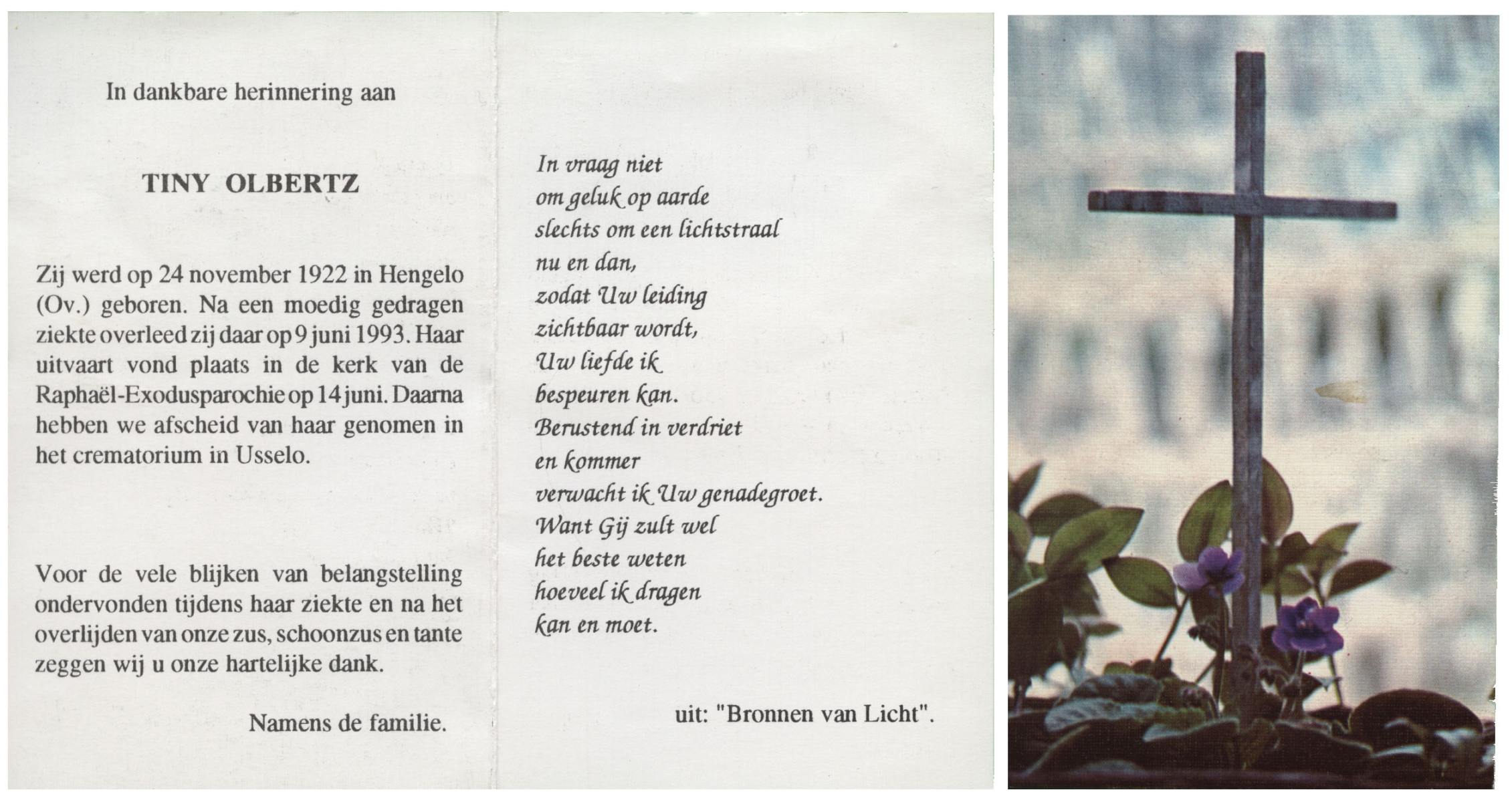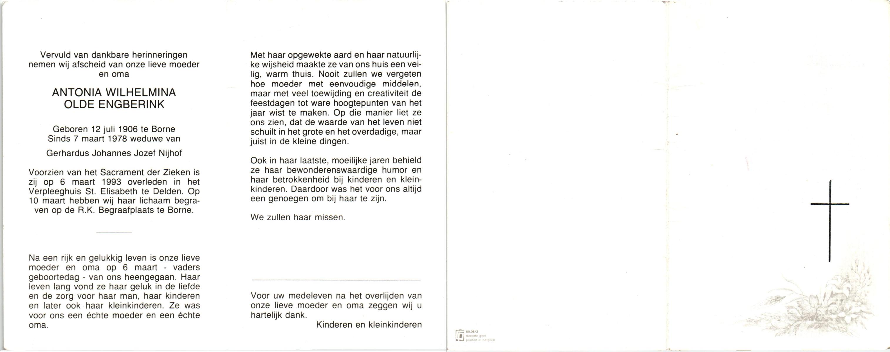 OLDE ENGBERINK, Antonia Wilhelmina, geboren op 12-7-1906 te Borne, overleden op 6-3-1993 te Delden op 86-jarige leeftijd, begraven op 10-3-1993 te Borne.