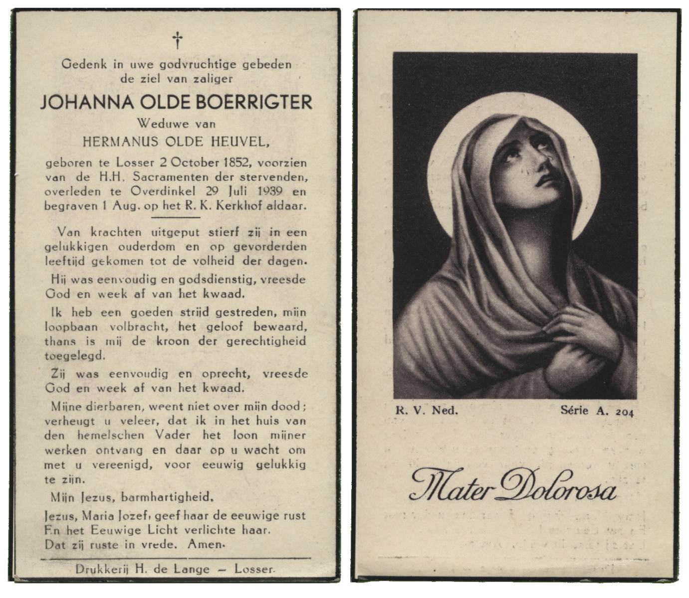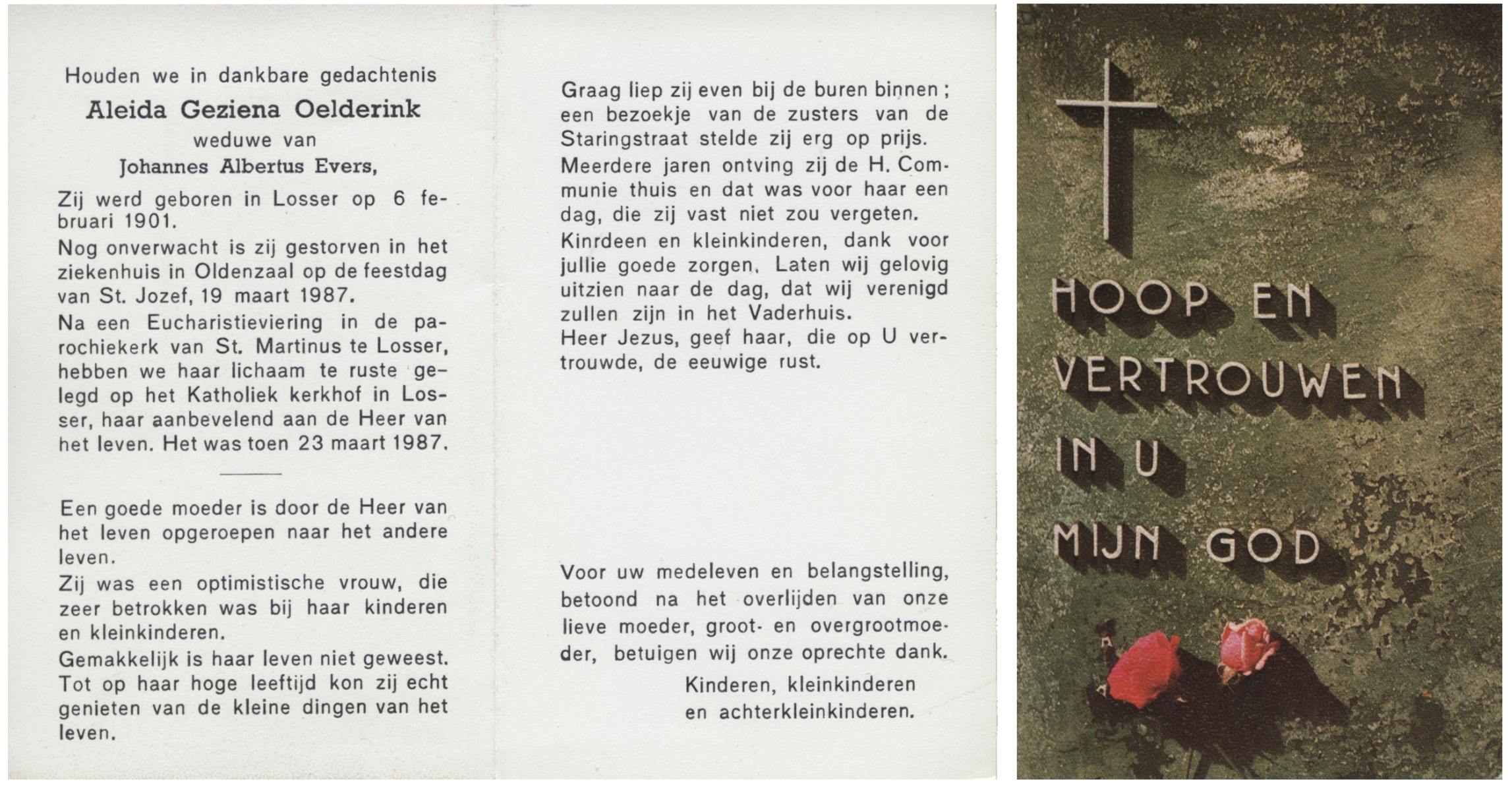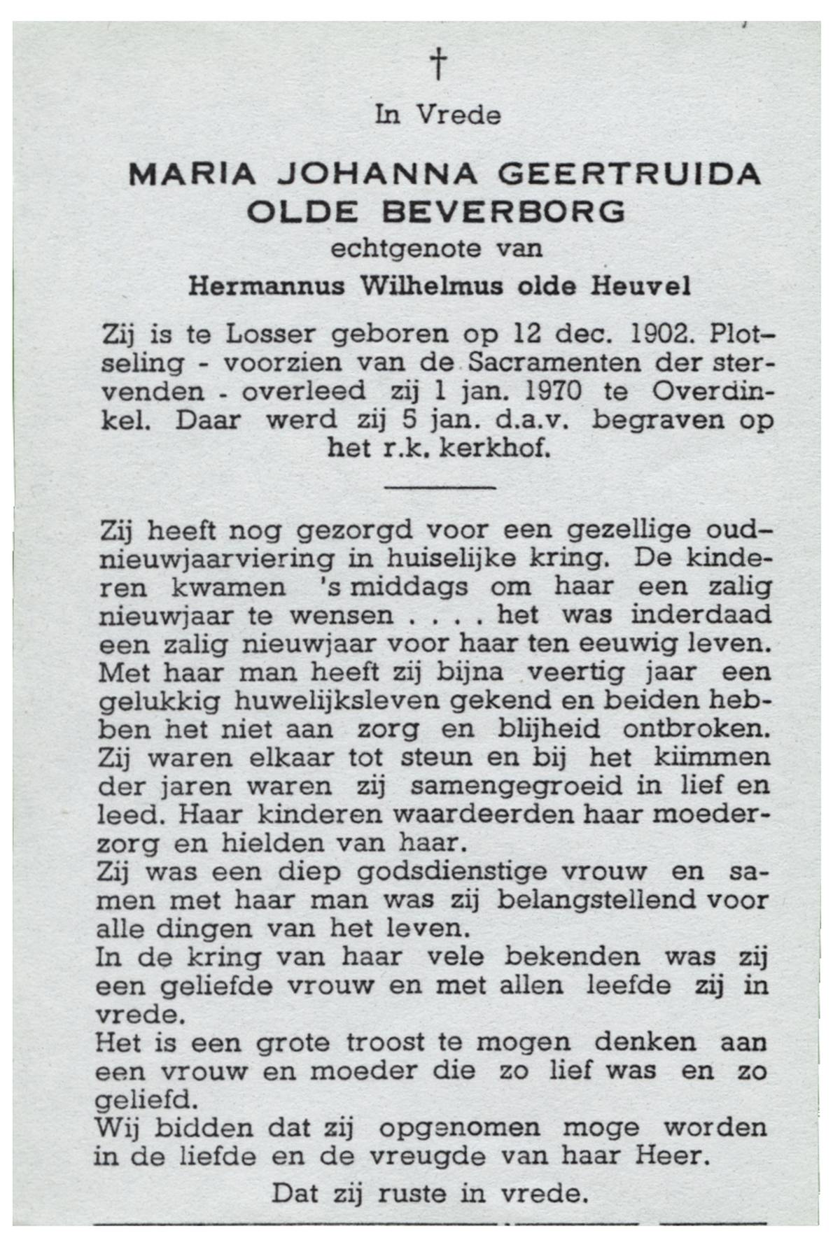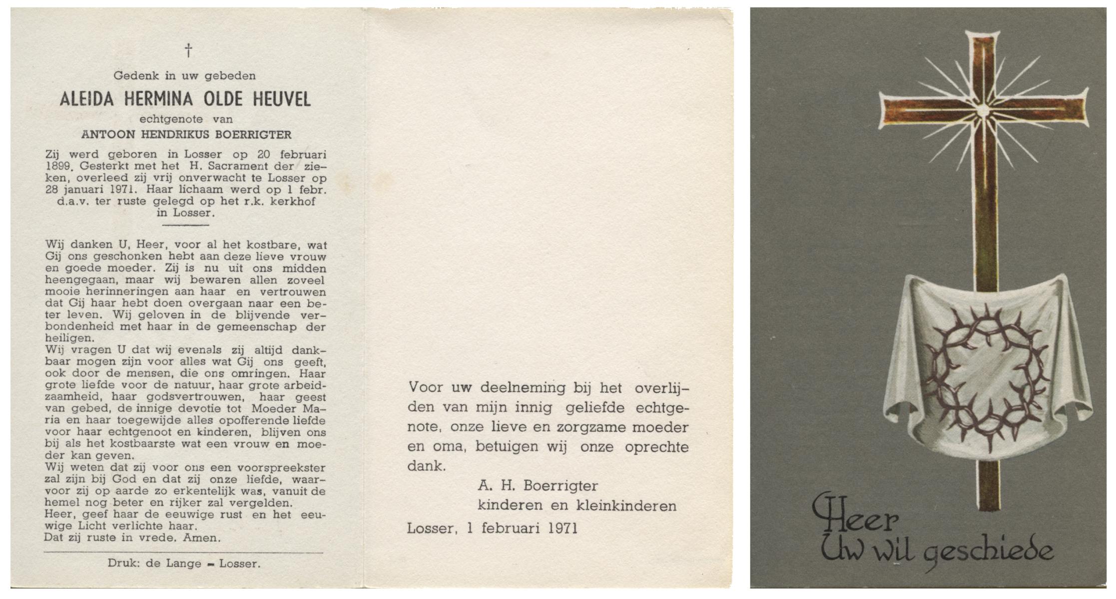 OLDE HEUVEL, Aleida Hermina, geboren op 20-02-1899 te Losser, overleden op 28-1-1971 te Losser op 71-jarige leeftijd, begraven op 1-2-1971 te Losser.