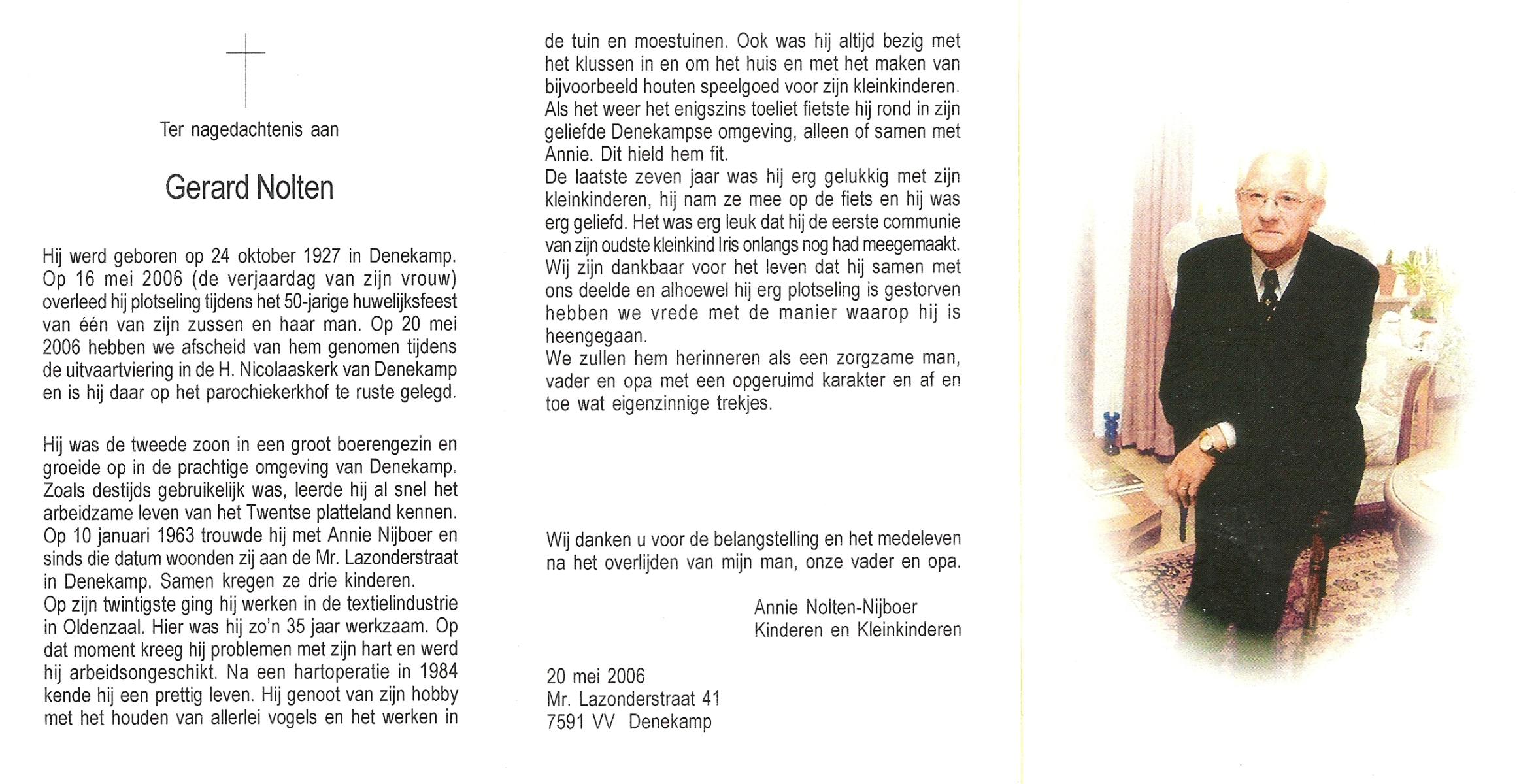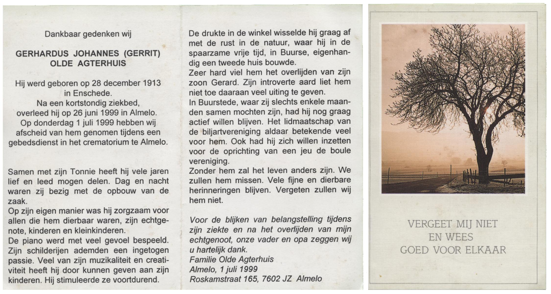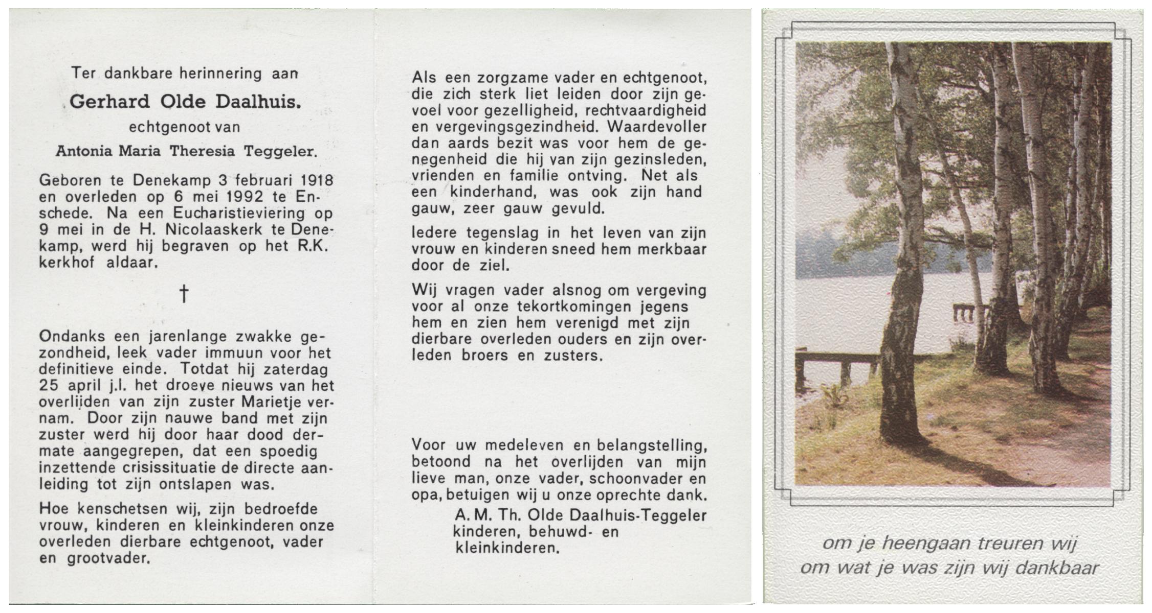 OLDE DAALHUIS, Gerhard, geboren op 3-2-1918 te Denekamp, overleden op 6-5-1992 te Enschede op 74-jarige leeftijd, begraven op 9-5-1992 te Denekamp.