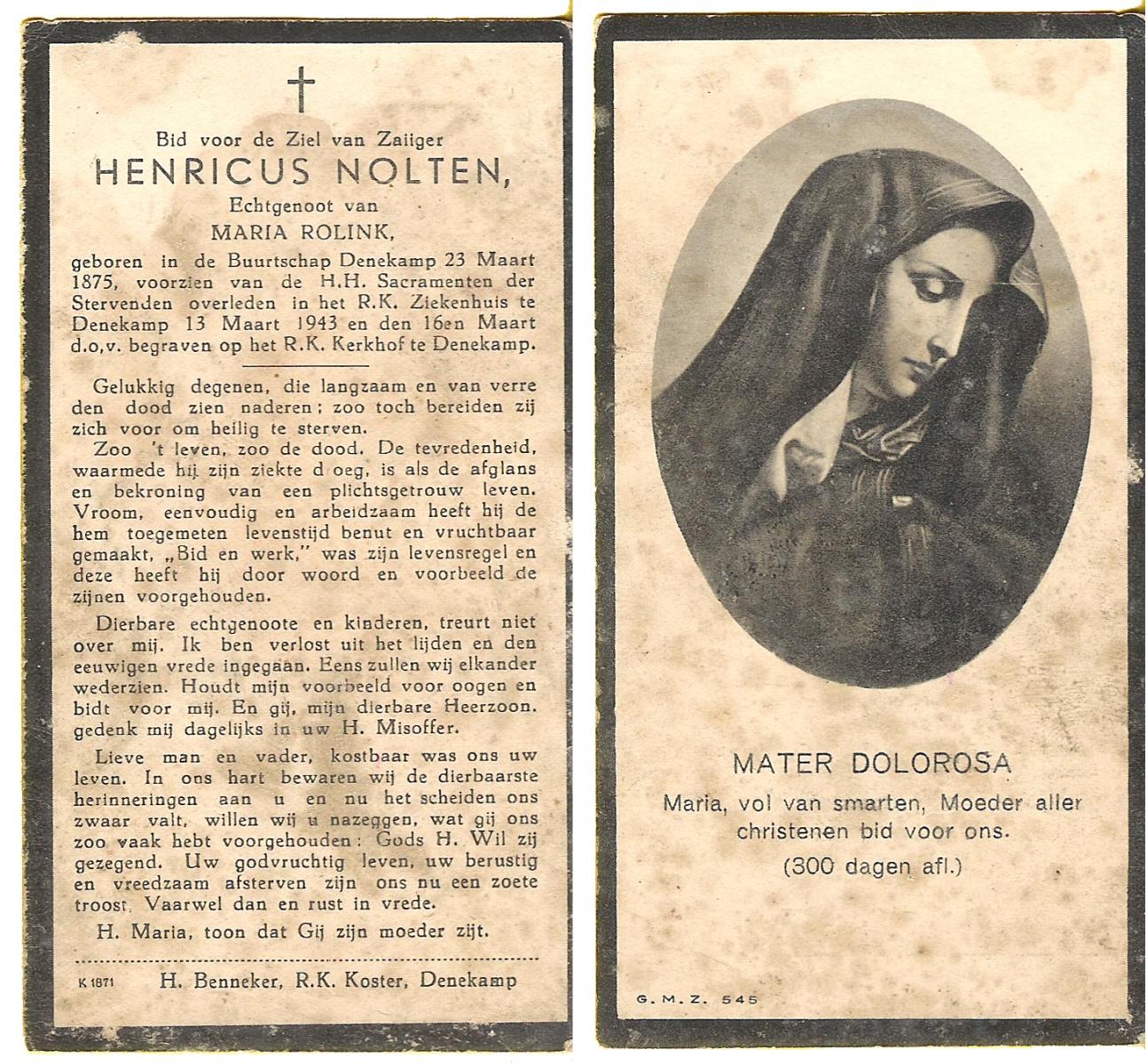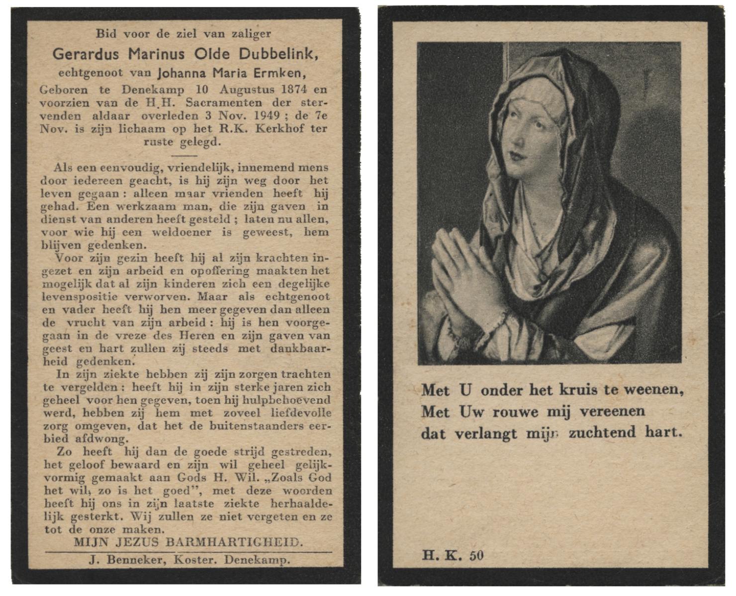OLDE DUBBELINK, Gerardus Marinus, geboren op 10-08-1874 te Denekamp, overleden op 3-11-1949 te Denekamp op 75-jarige leeftijd, begraven op 7-11-1949 te Denekamp.