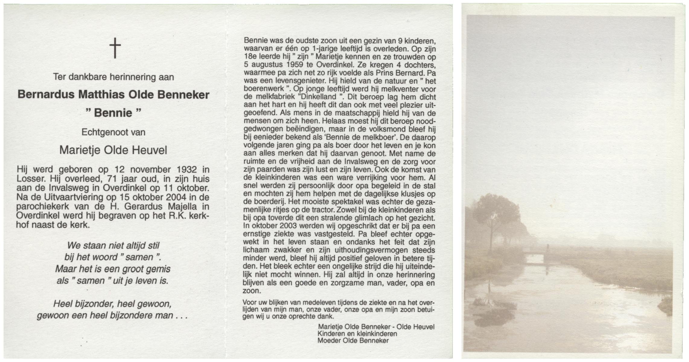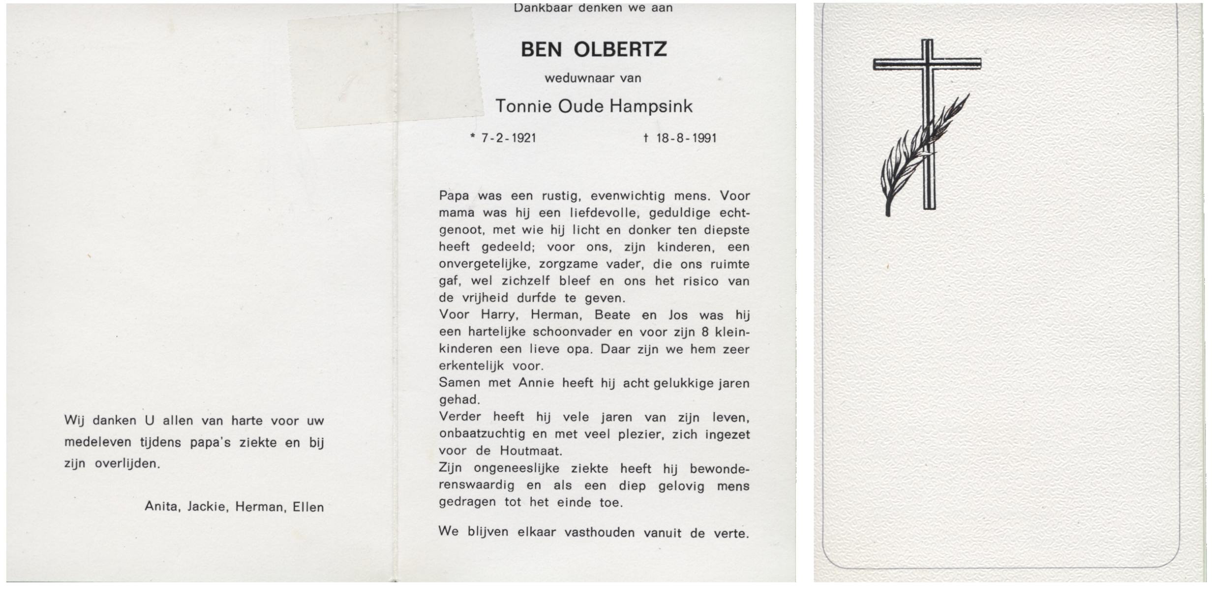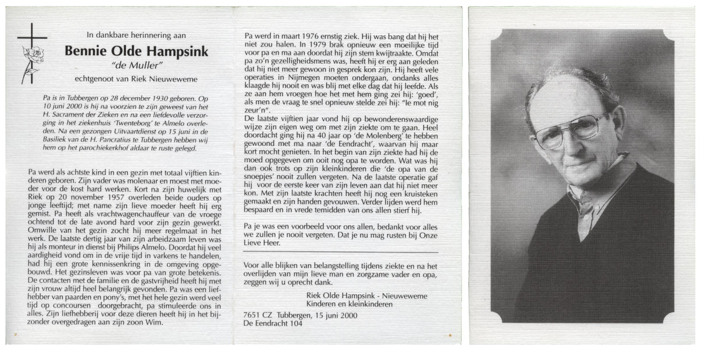 OLDE HAMPSINK, Bennie, geboren op 28-12-1930 te Tubbergen, overleden op 10-6-2000 te Almelo op 69-jarige leeftijd, begraven op 15-6-2000 te Tubbergen.