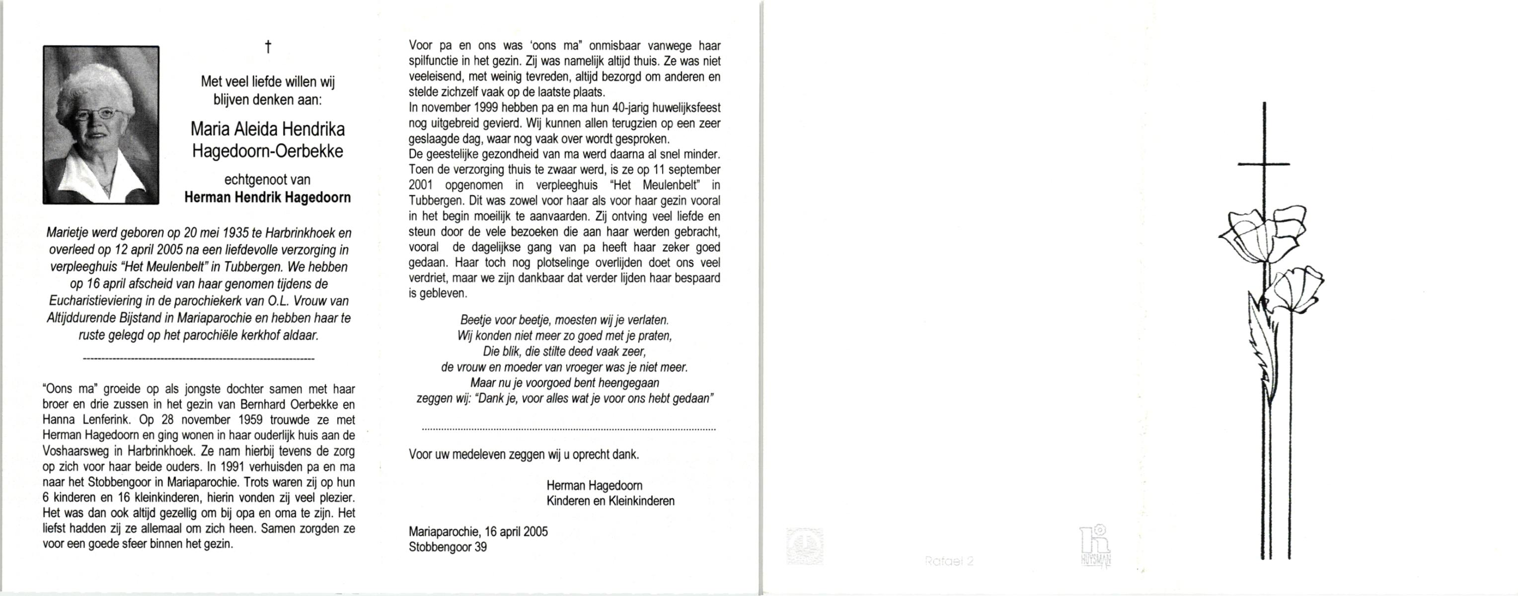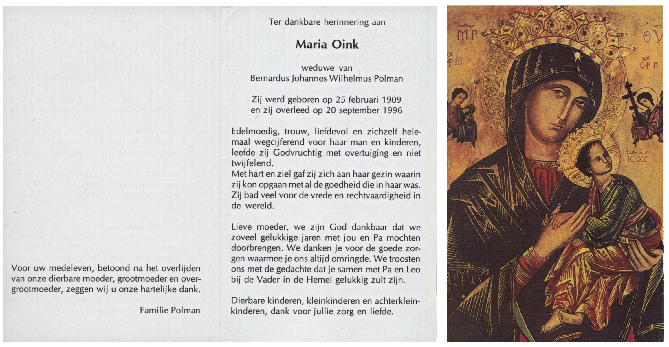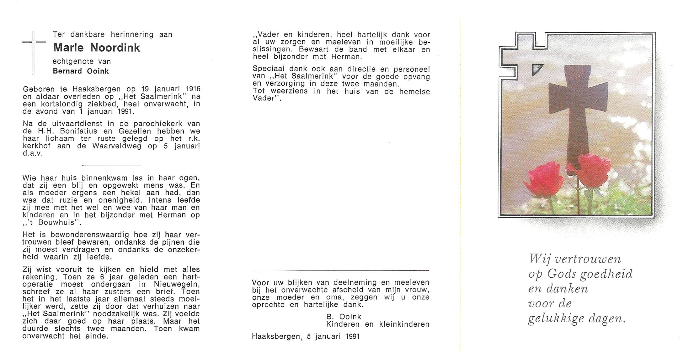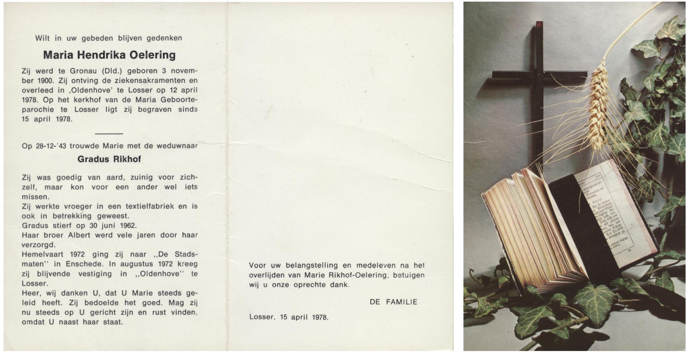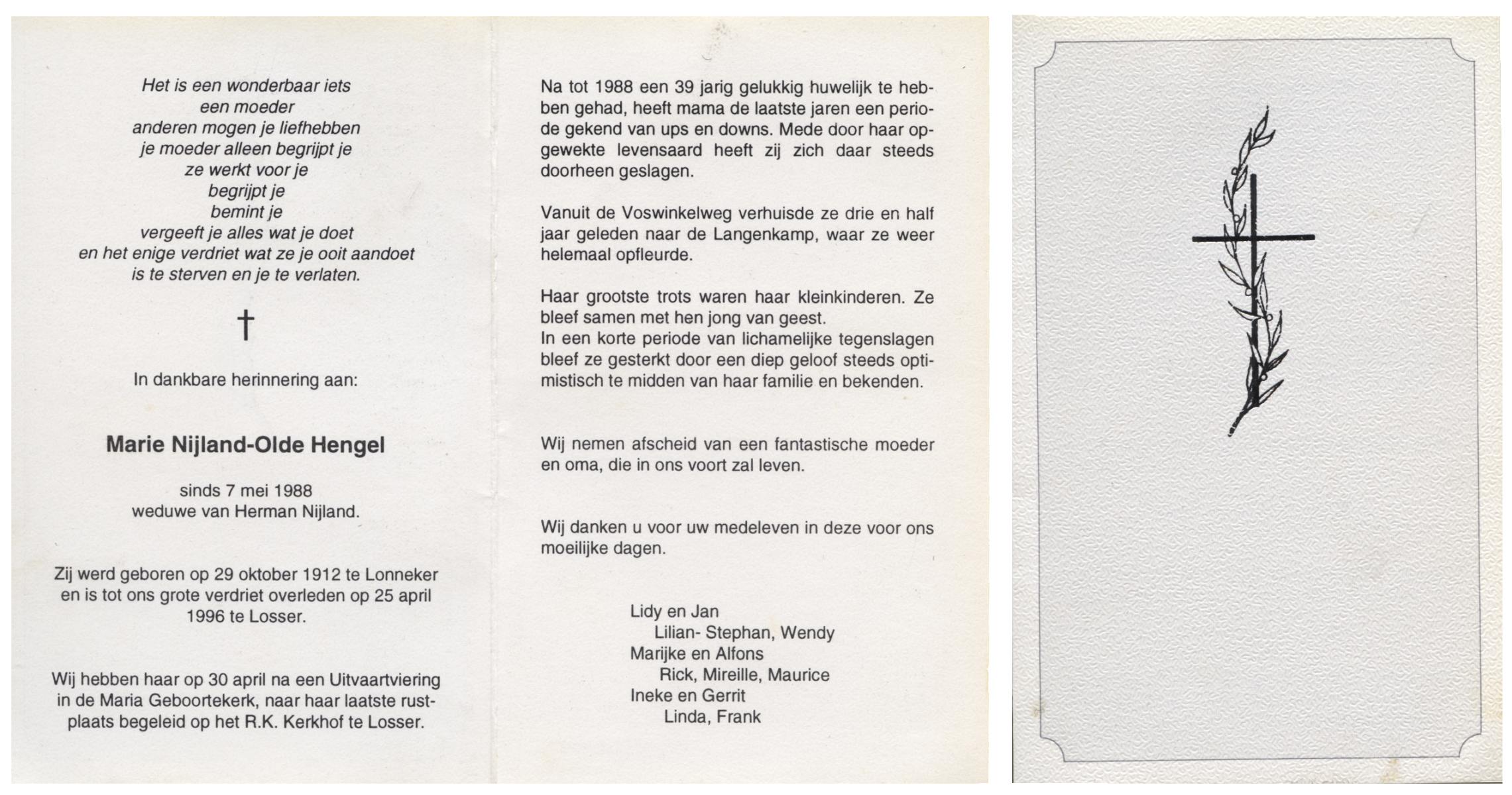 OLDE HENGEL, Marie, geboren op 29-10-1912 te Lonneker, overleden op 25-4-1996 te Losser op 83-jarige leeftijd, begraven op 30-4-1996 te Losser.