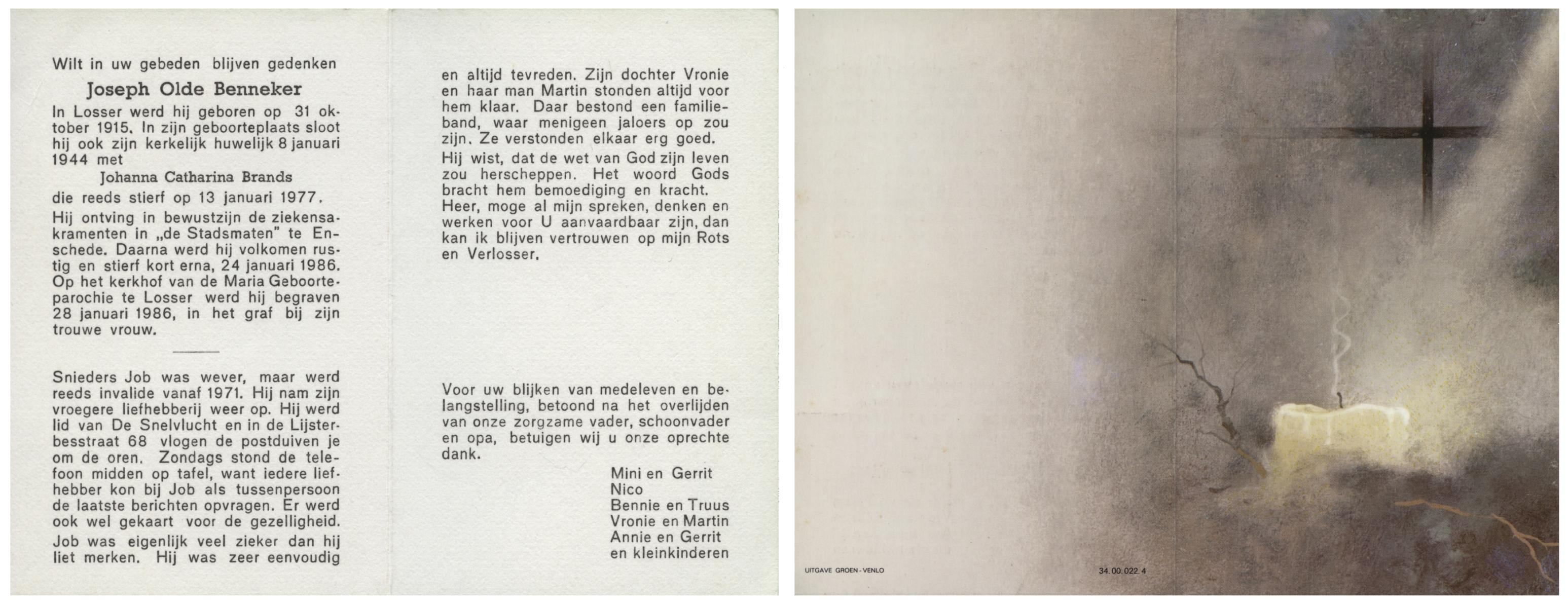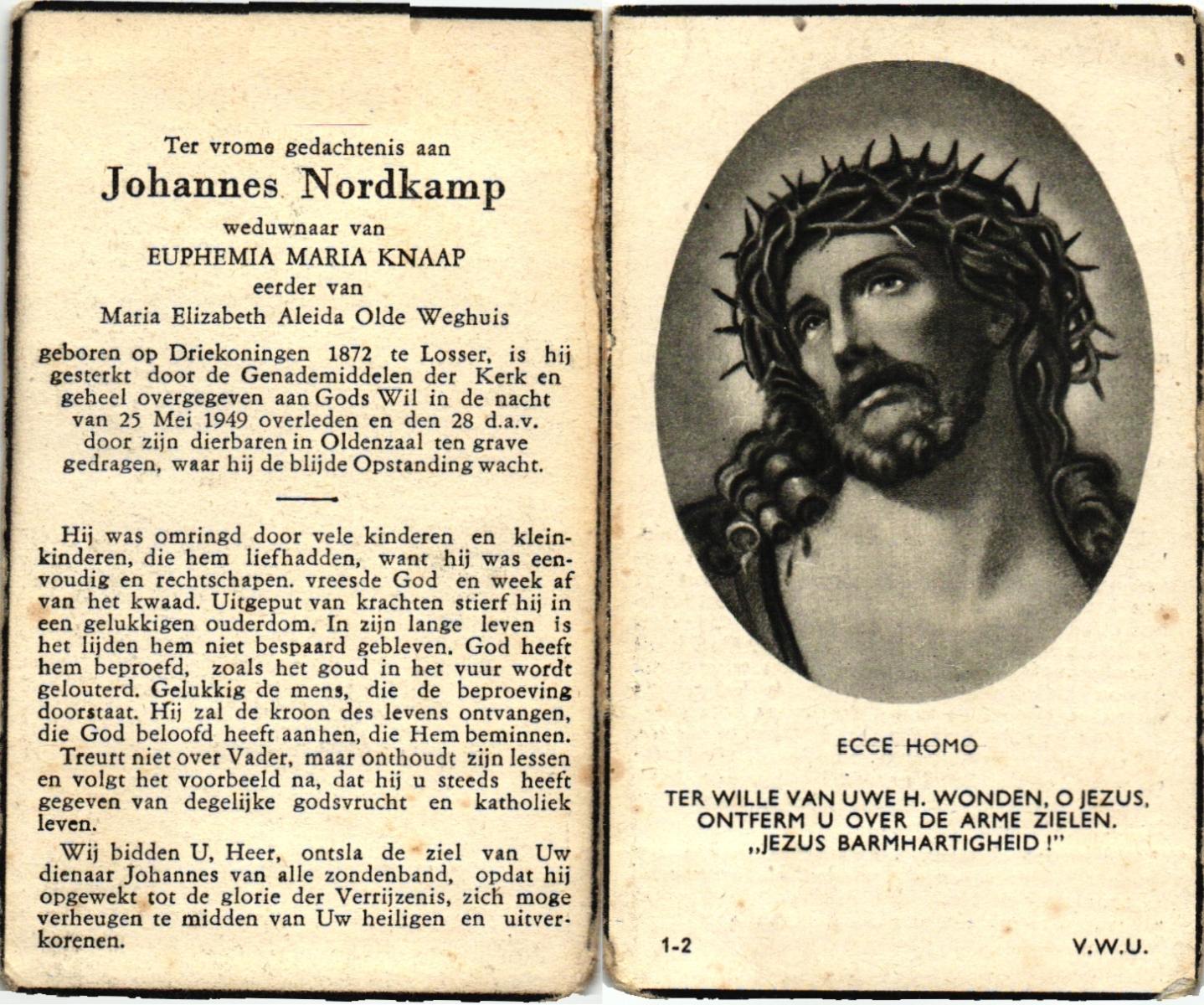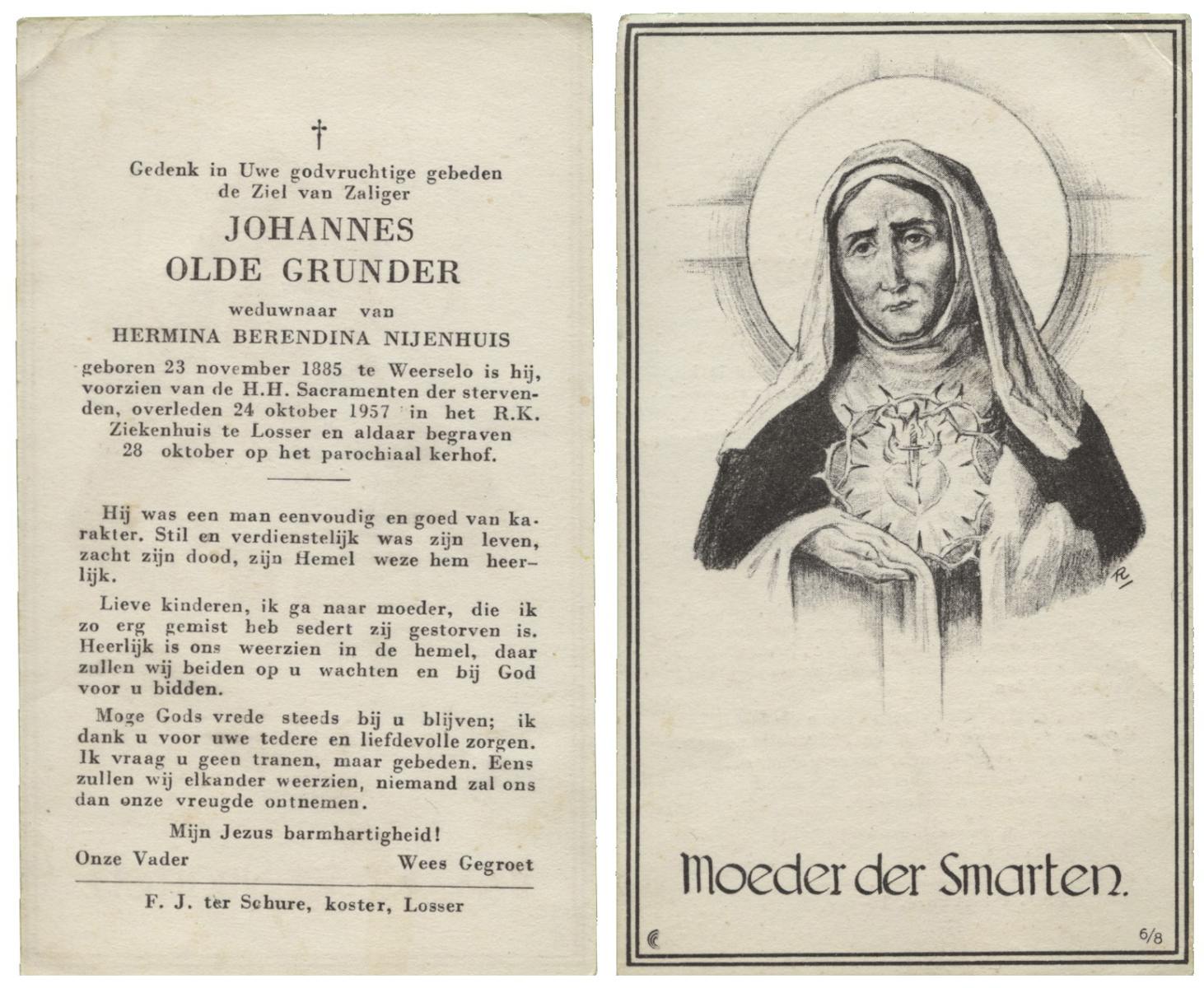 OLDE GRUNDER, Johannes, geboren op 23-11-1885 te Weerselo, overleden op 24-10-1957 te Losser op 71-jarige leeftijd, begraven op 28-10-1957 te Losser.