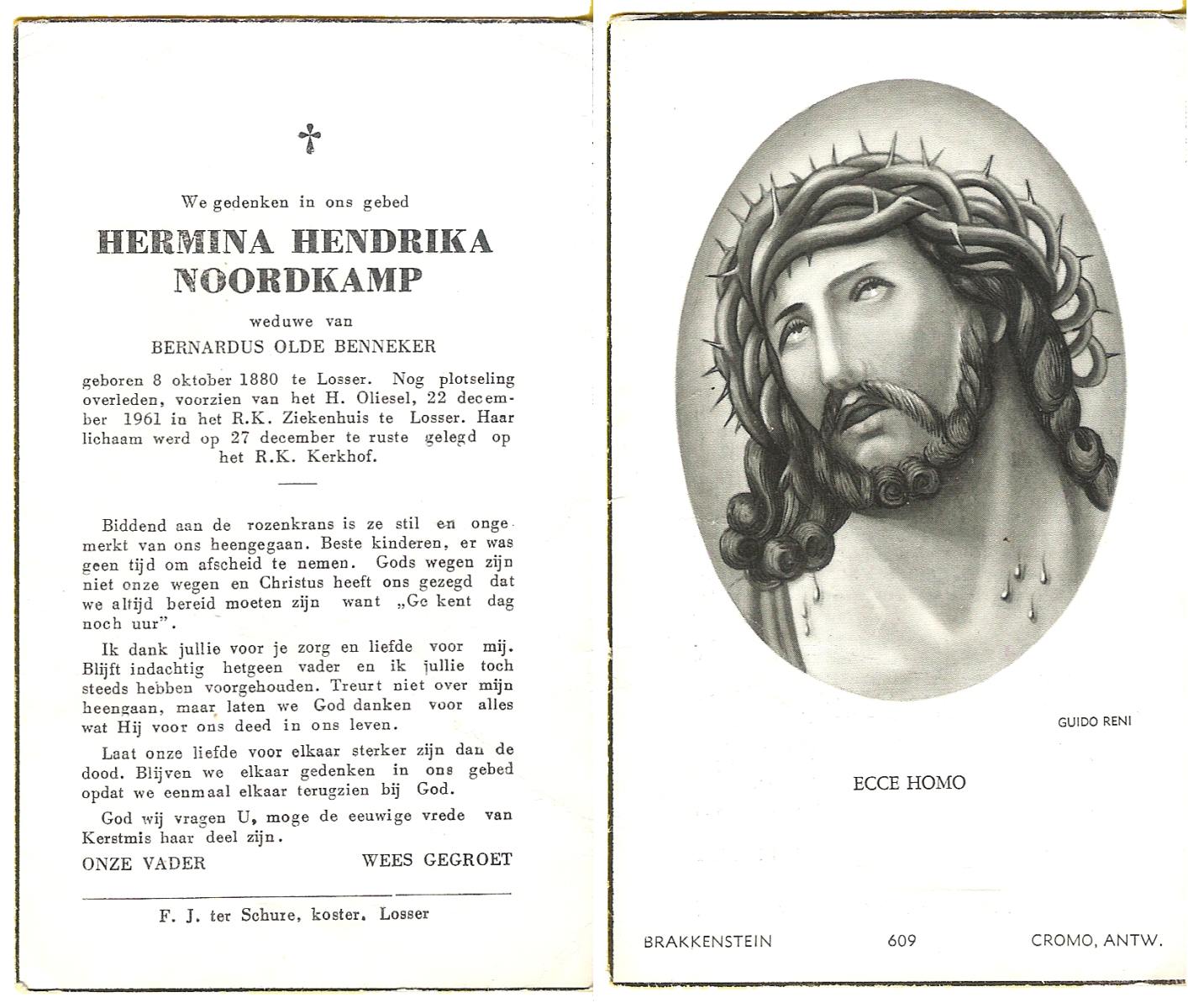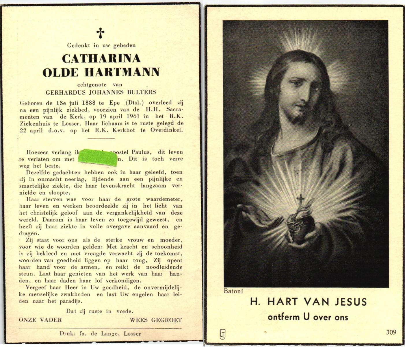OLDE HARTMANN, Catharina, geboren op 13-07-1888 te Epe, Dld, overleden op 19-4-1961 te Losser op 72-jarige leeftijd, begraven op 22-4-1961 te Overdinkel.