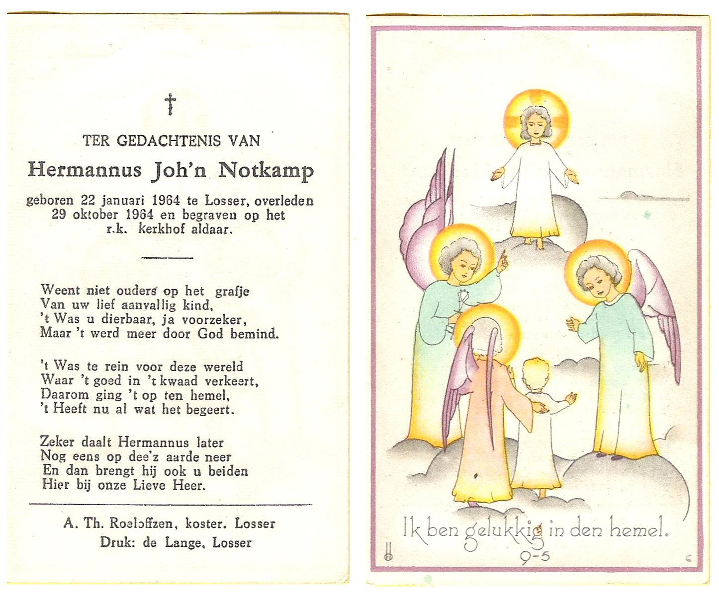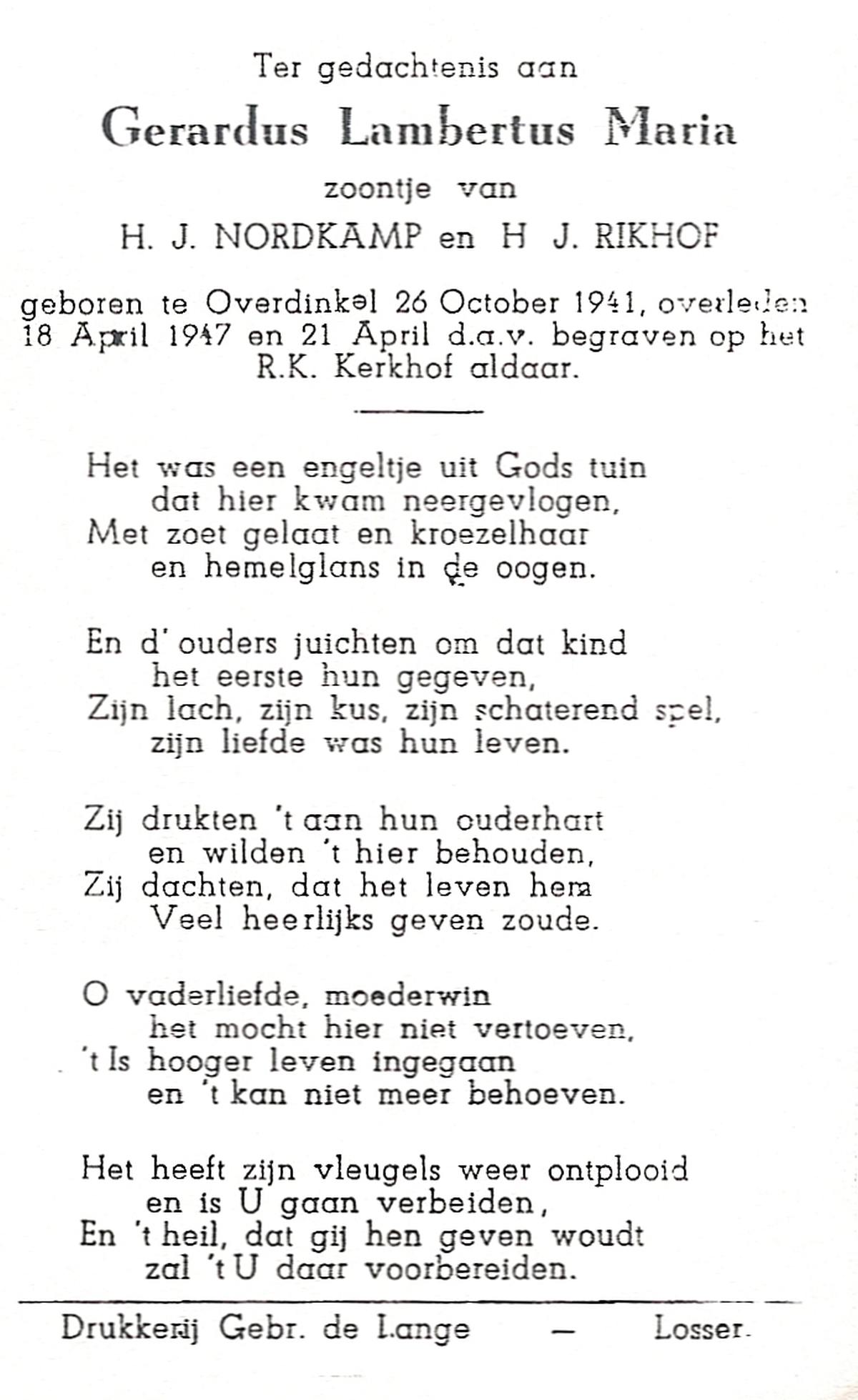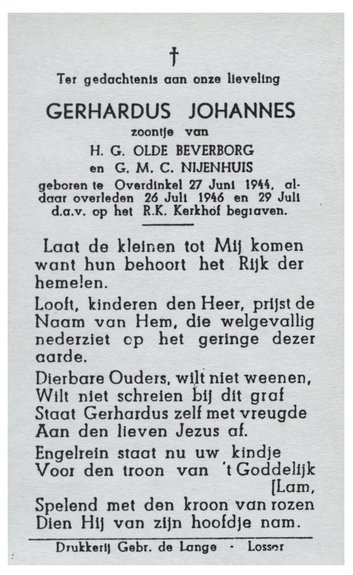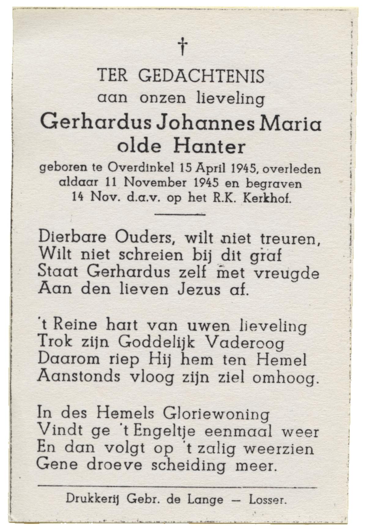 OLDE HANTER, Gerhardus Johannes Maria, geboren op 15-4-1945 te Overdinkel, overleden op 11-11-1945 te Overdinkel op 0-jarige leeftijd, begraven op 14-11-1945 te Overdinkel.