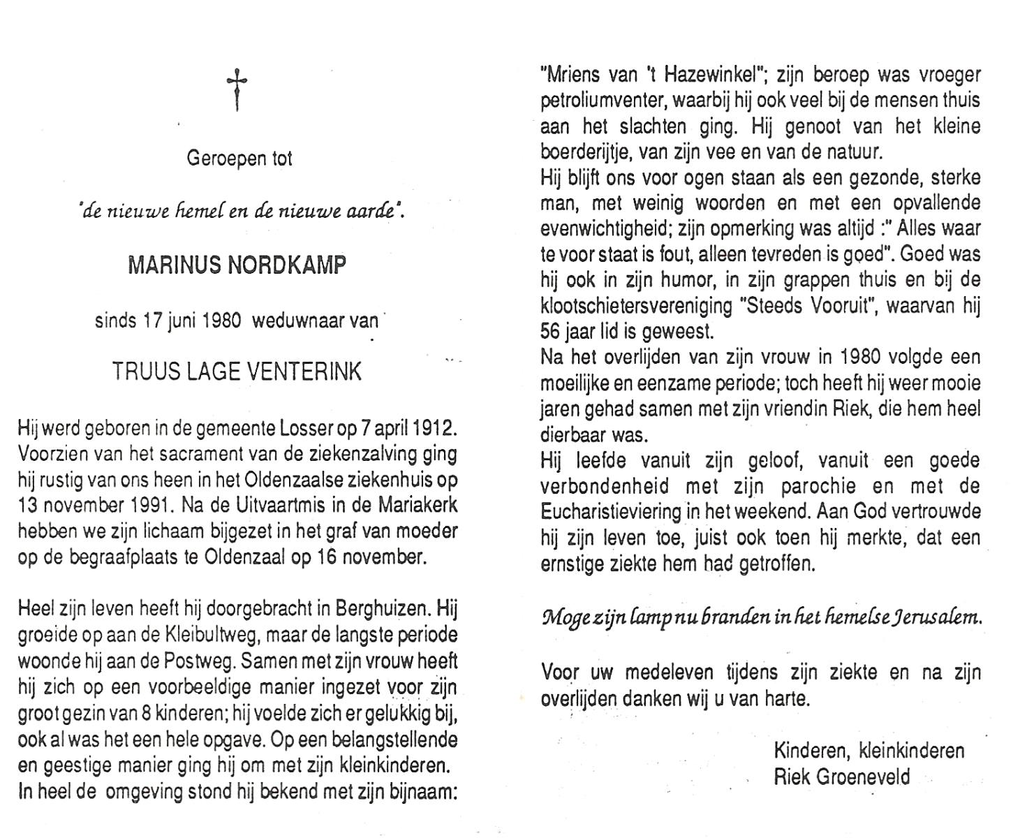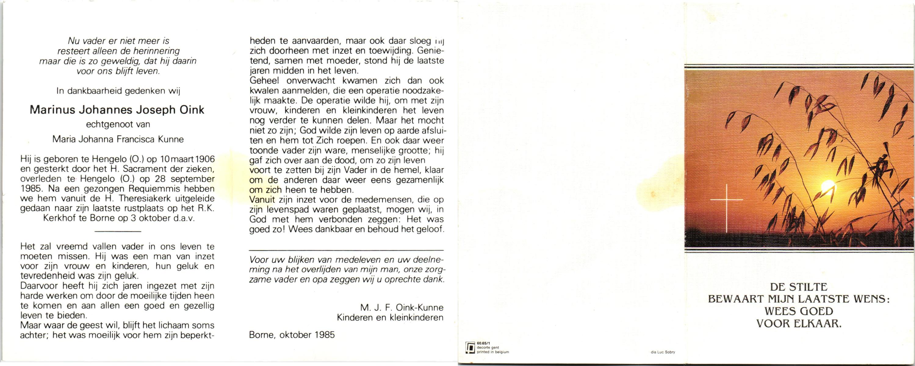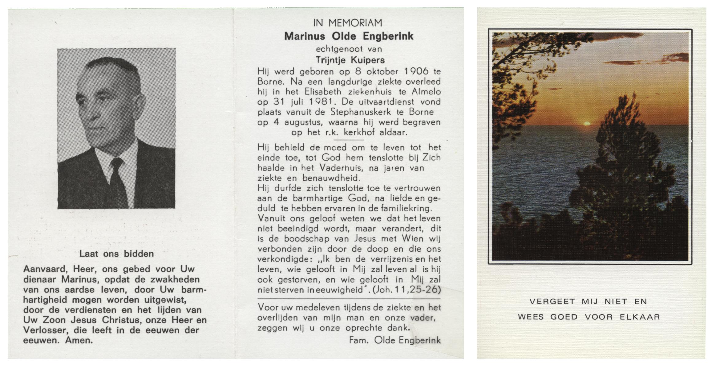 OLDE ENGBERINK, Marinus, geboren op 8-10-1906 te Borne, overleden op 31-7-1981 te Almelo op 74-jarige leeftijd, begraven op 4-8-1981 te Borne.