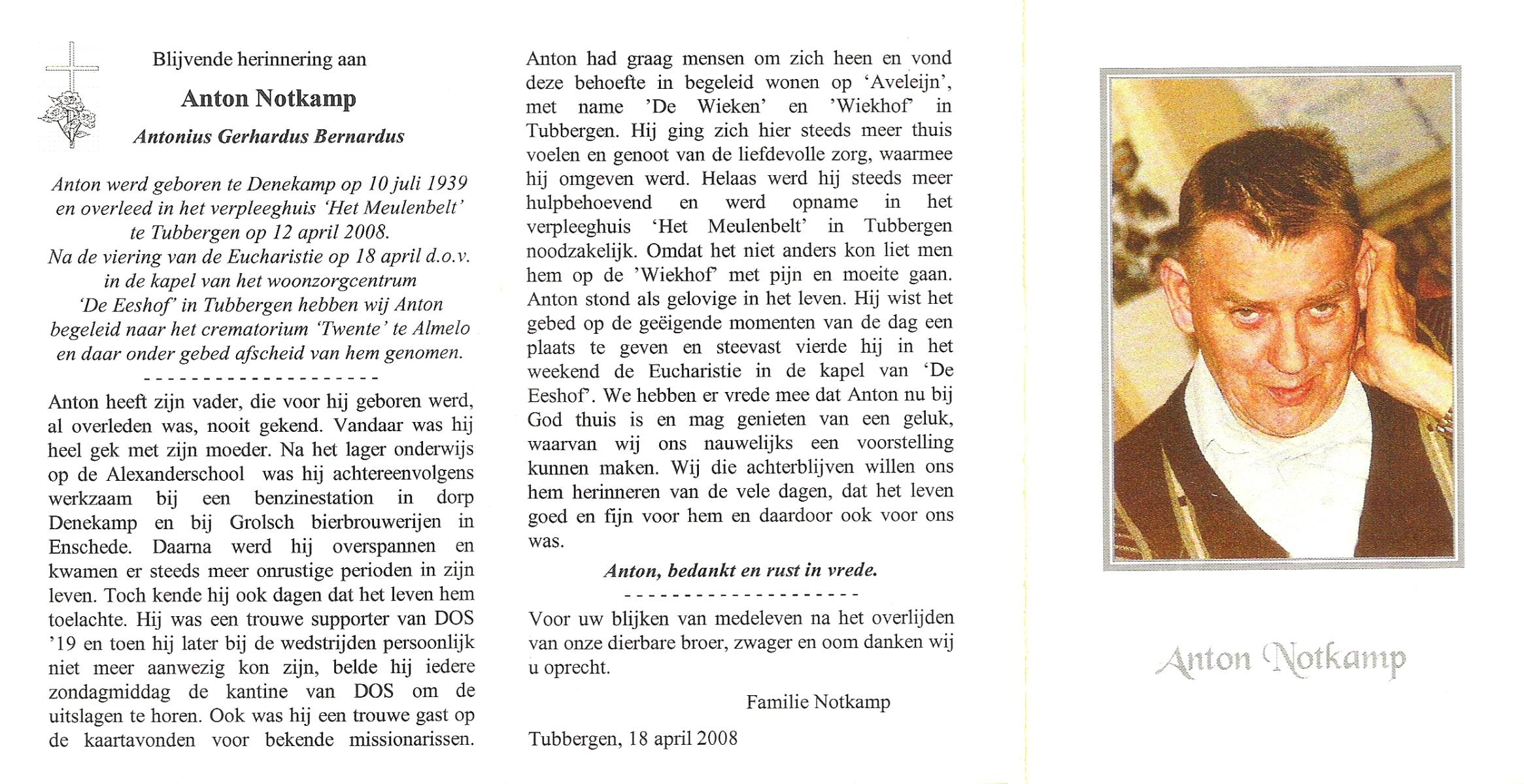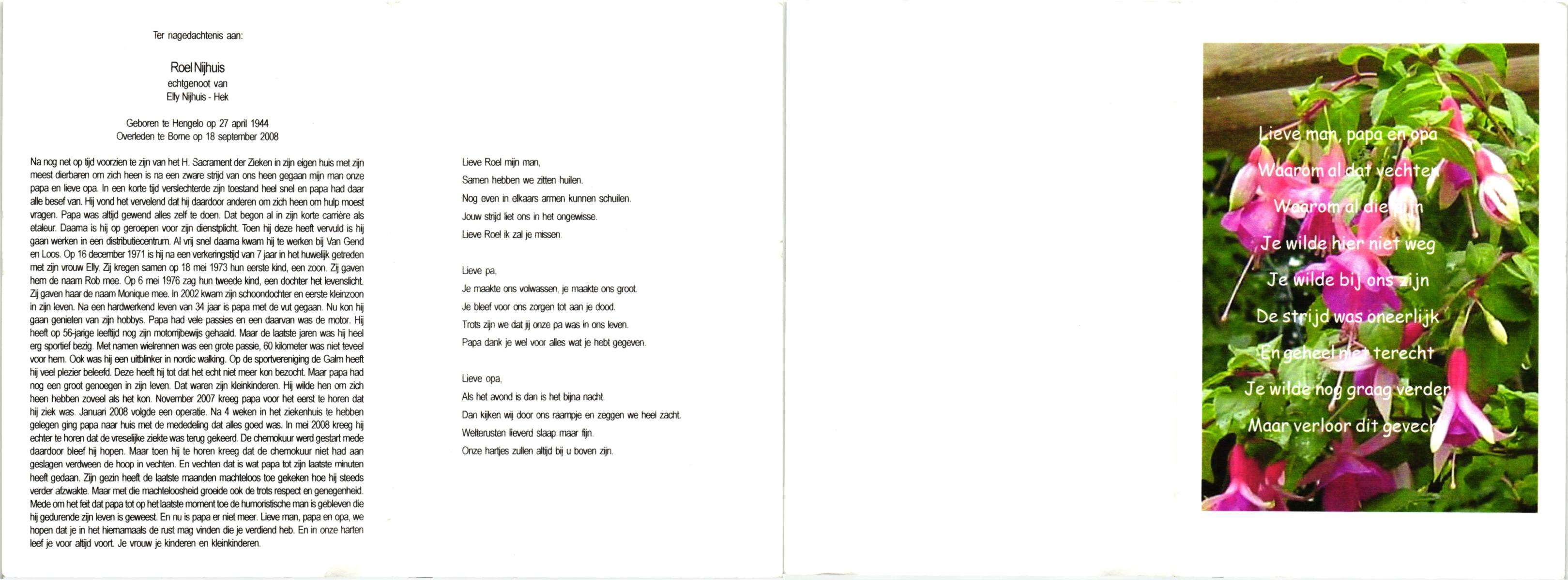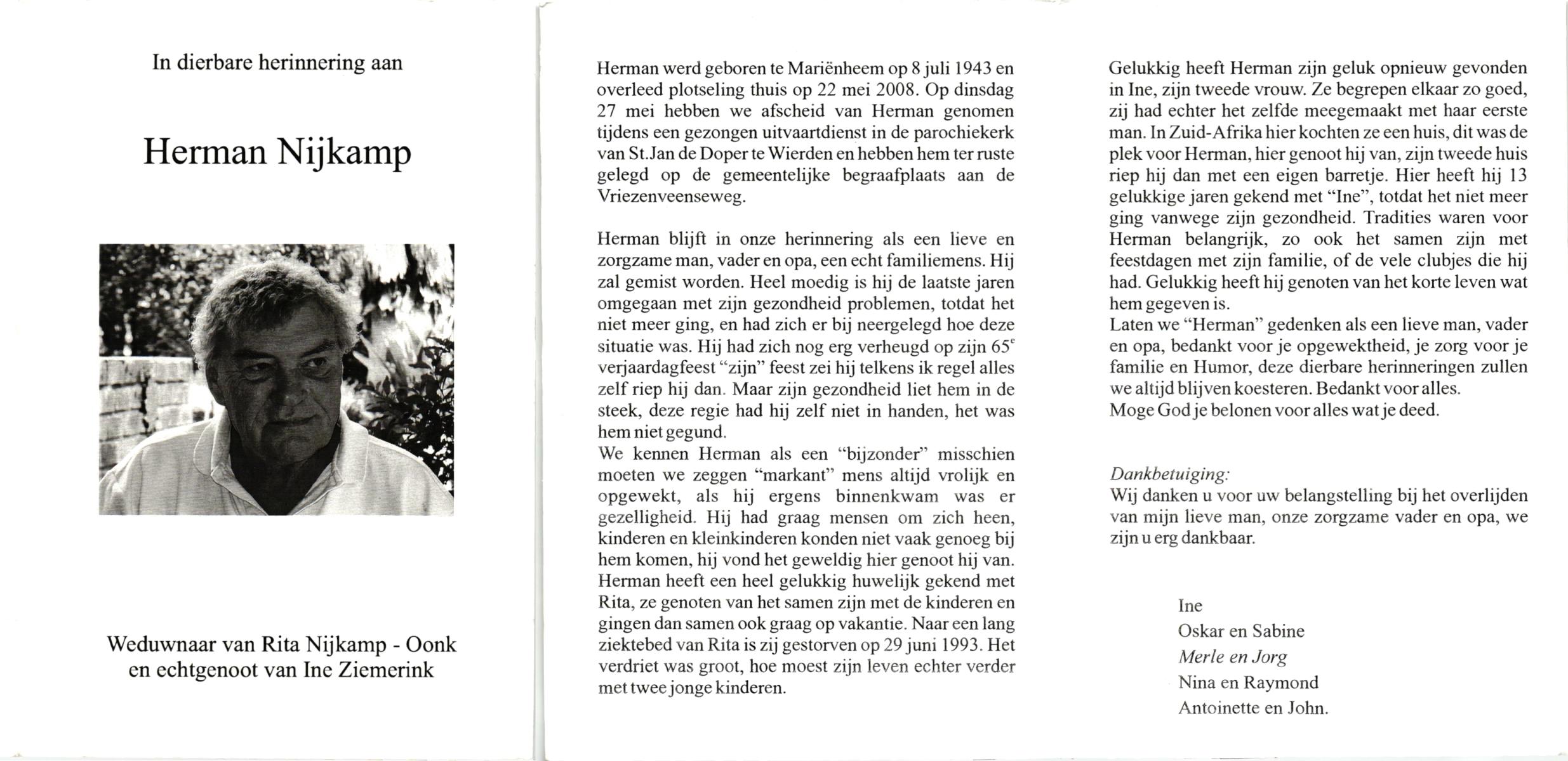 NIJKAMP, , Herman, geboren op 8-7-1943 te Marienheem, overleden op 22-5-2008 te Wierden op 64-jarige leeftijd, begraven op 27-5-2008 te Wierden.
