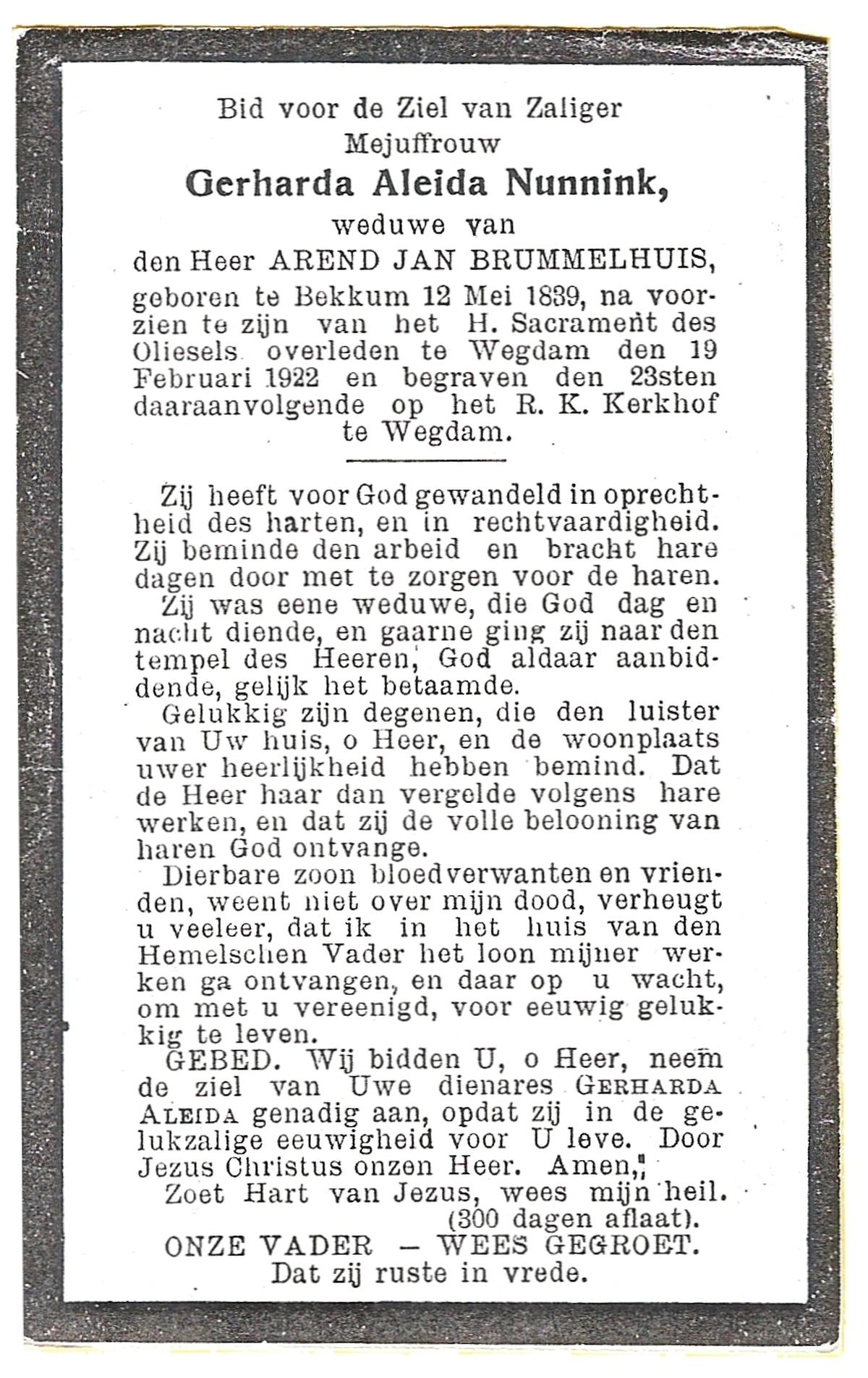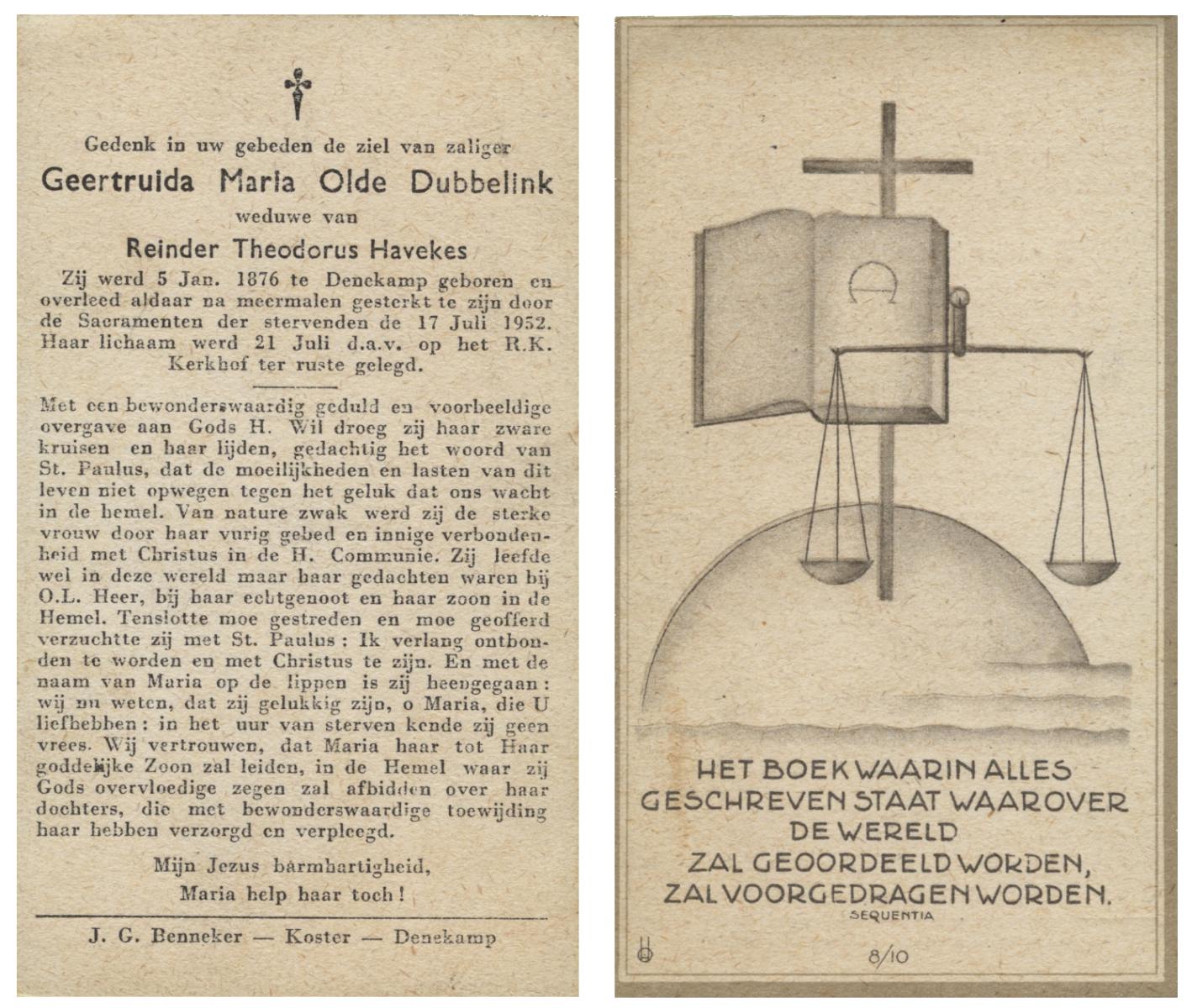 OLDE DUBBELINK, Geertruida Maria, geboren op 05-01-1876 te Denekamp, overleden op 17-7-1952 te Denekamp op 76-jarige leeftijd, begraven op 21-7-1952 te Denekamp.