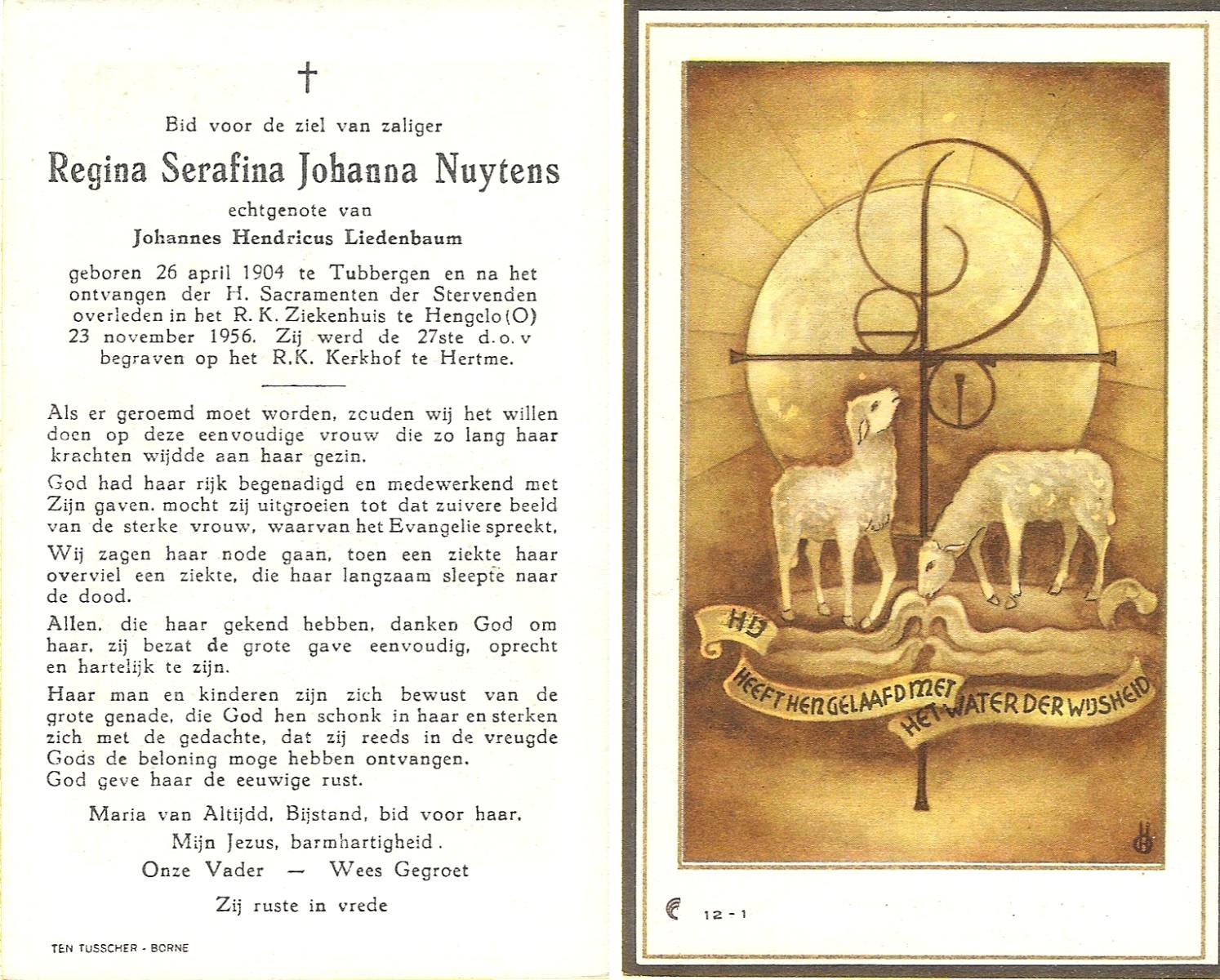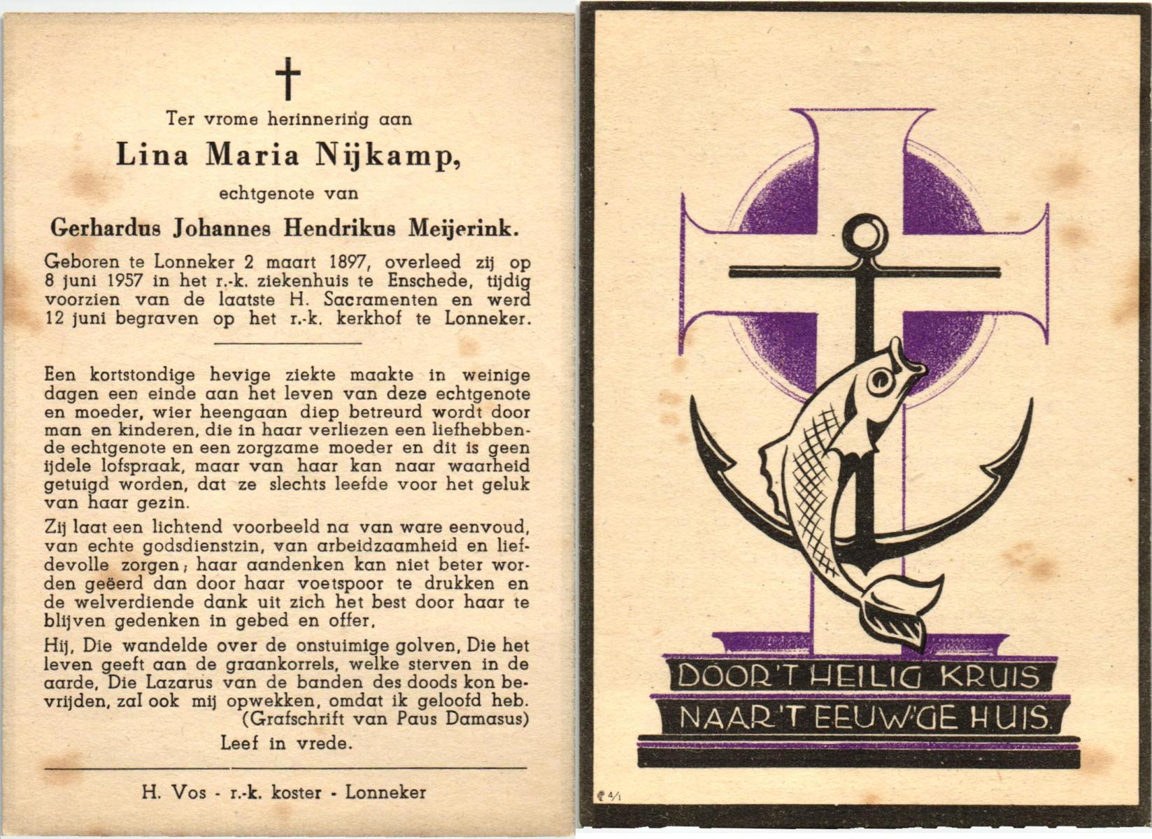 NIJKAMP, Lina Maria, geboren op 02-03-1897 te Lonneker, overleden op 8-6-1957 te Enschede, ziekenhuis op 60-jarige leeftijd, begraven op 12-6-1957 te Lonneker.