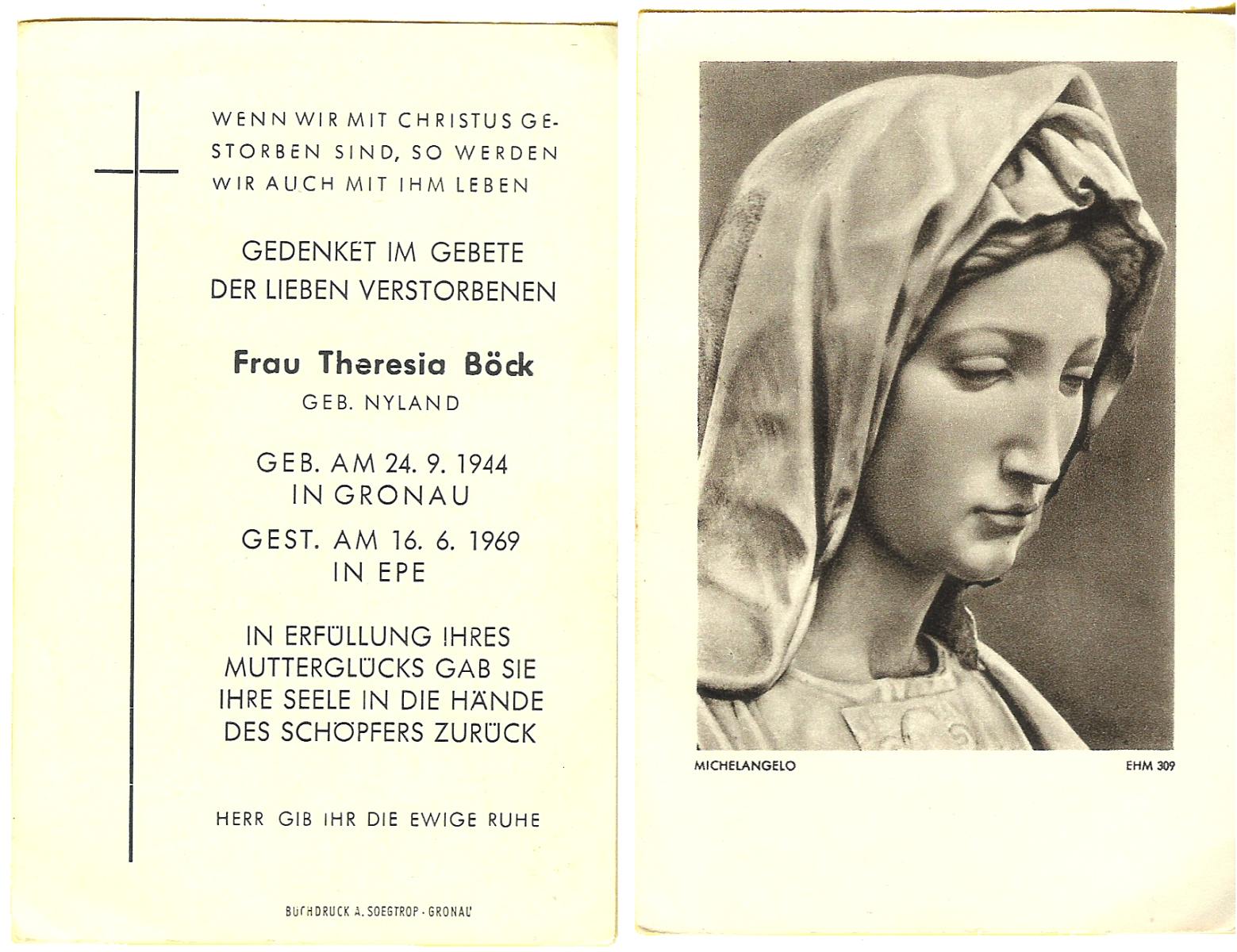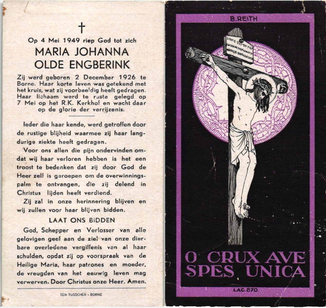 OLDE ENGBERINK, , Maria Johanna, geboren op 2-12-1926 te Borne, overleden op 4-5-1949 te Borne op 22-jarige leeftijd, begraven op 7-5-1949 te Borne.