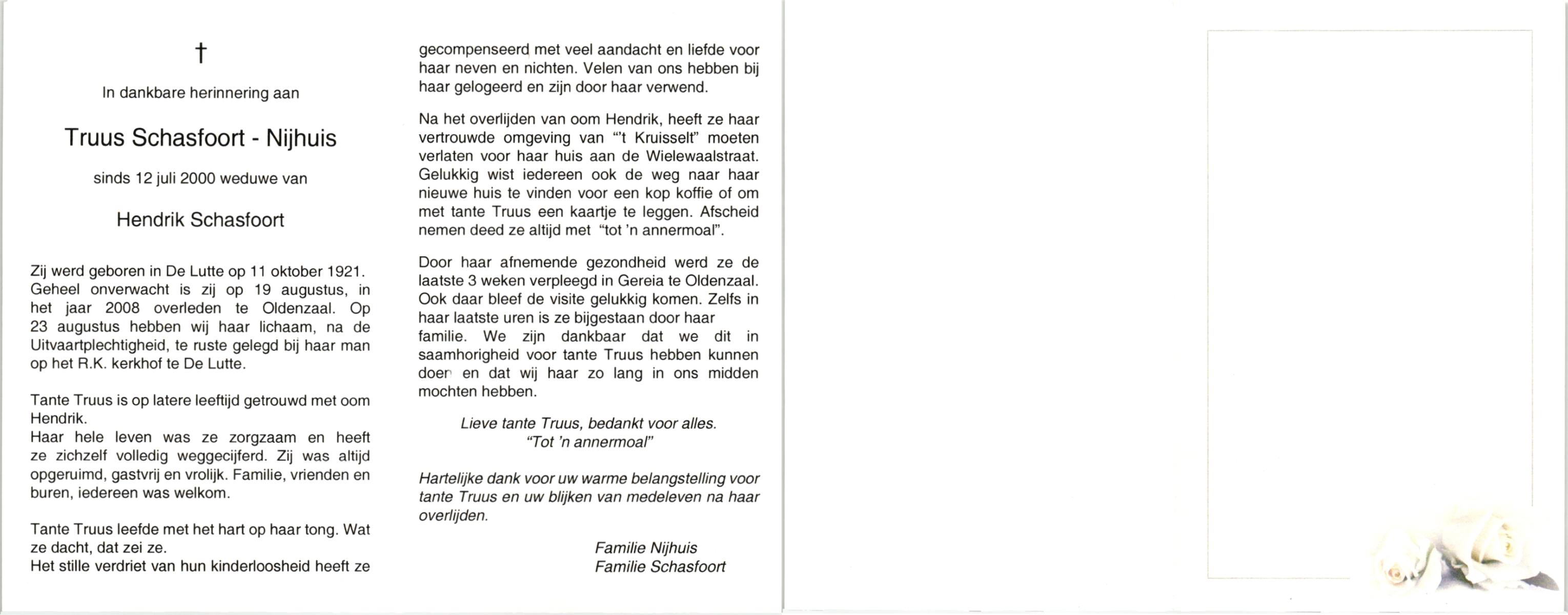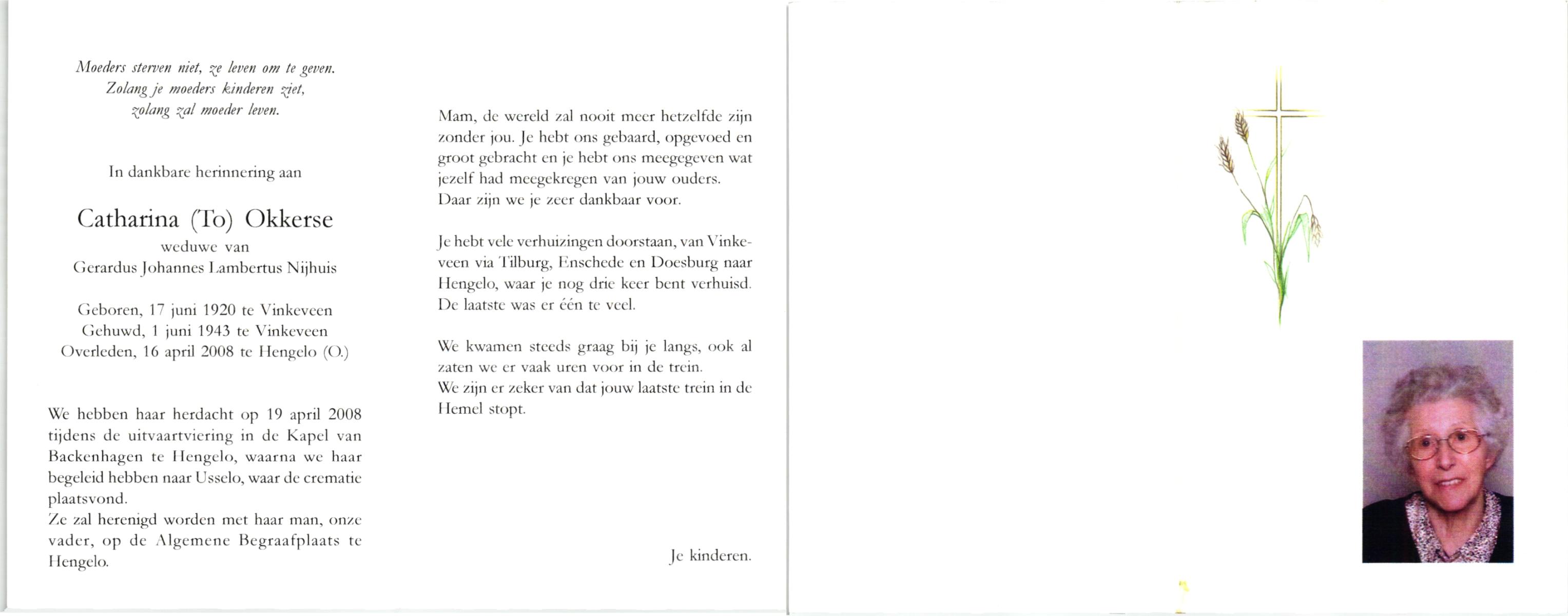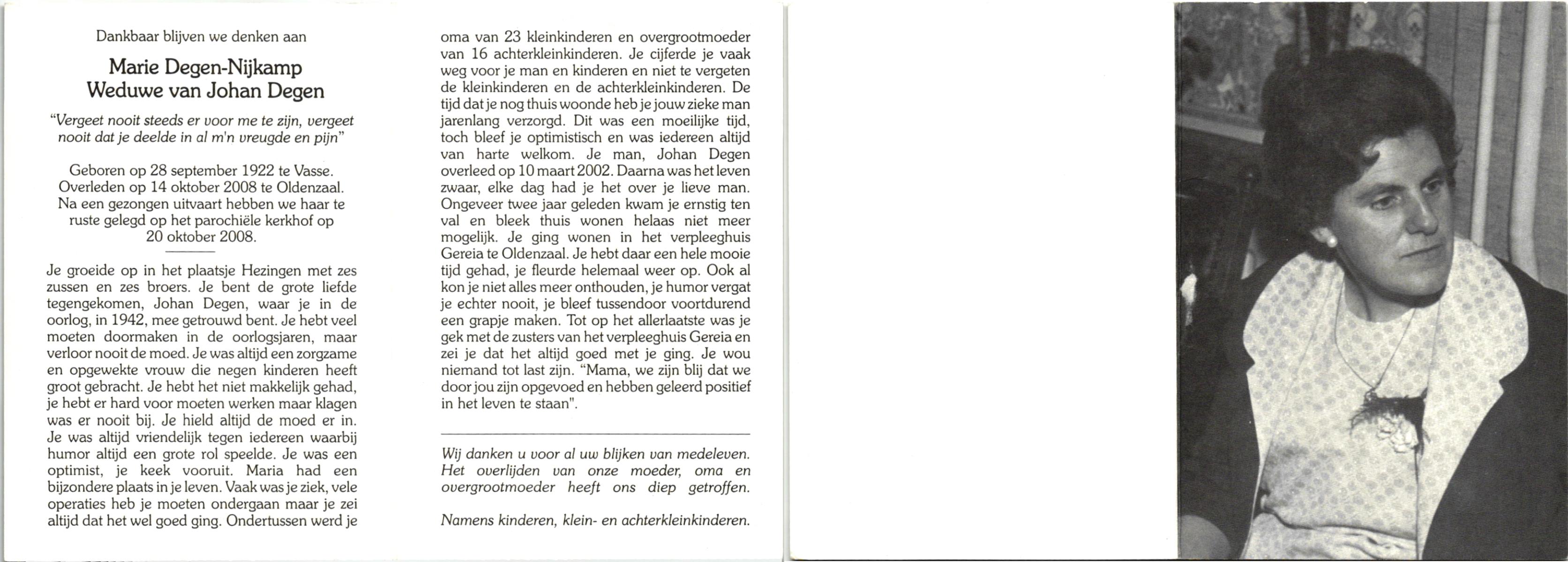 NIJKAMP, , Marie, geboren op 28-9-1922 te Vasse, overleden op 14-10-2008 te Oldenzaal op 86-jarige leeftijd, begraven op 20-10-2008 te Oldenzaal.