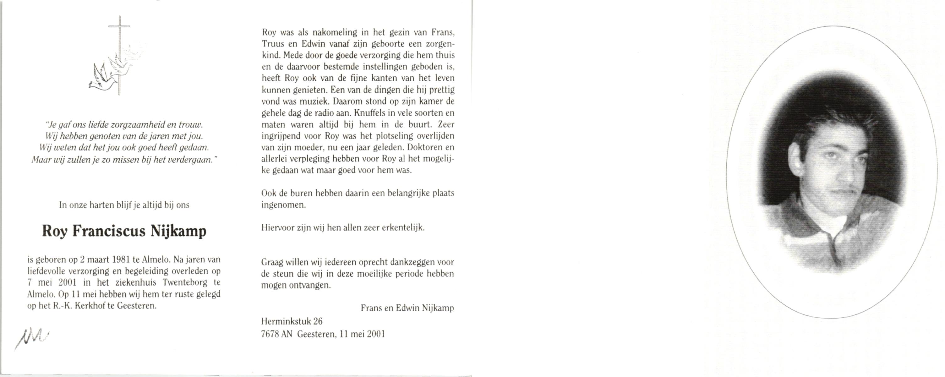 NIJKAMP, , Roy Franciscus, geboren op 2-3-1981 te Almelo, overleden op 7-5-2001 te Almelo op 20-jarige leeftijd, begraven op 11-5-2001 te Geesteren.