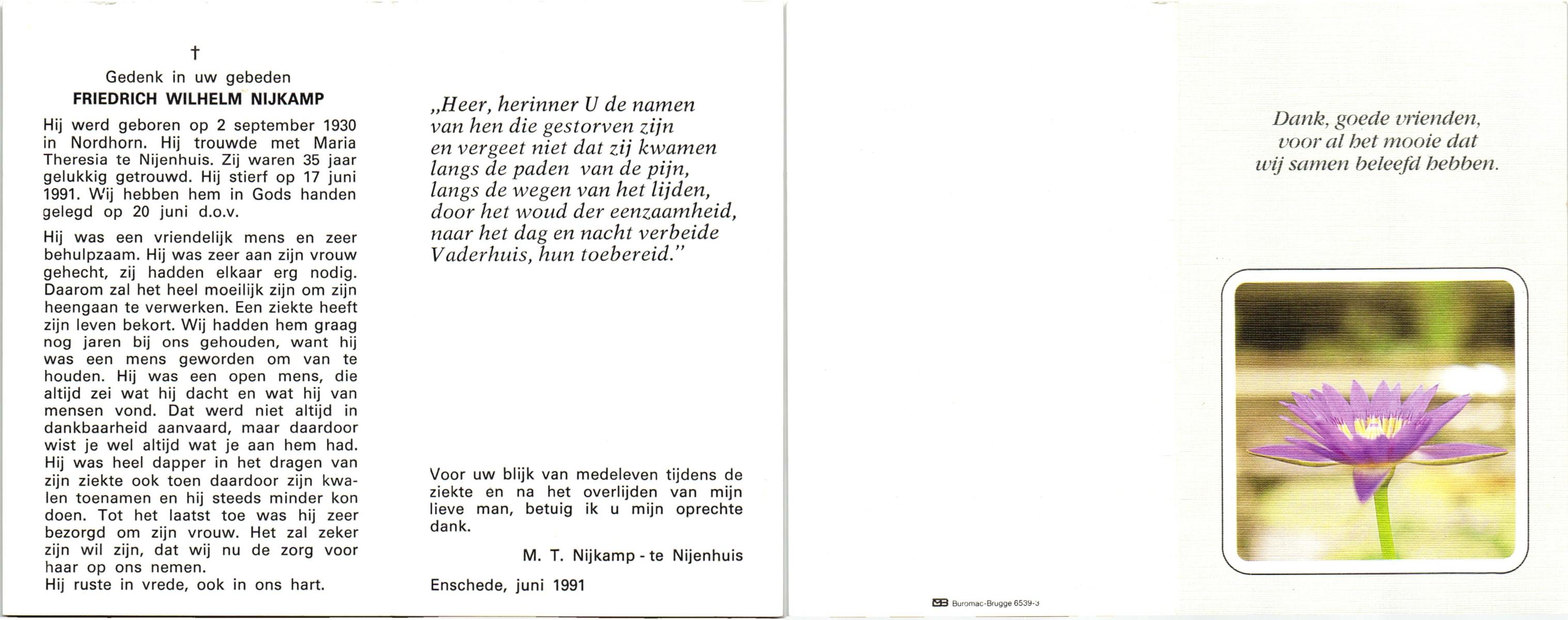 NIJKAMP, Friedrich Wilhelm, geboren op 2-9-1930 te Nordhorn, Dld, overleden op 17-6-1991 te Enschede op 60-jarige leeftijd, begraven op 20-6-1991 te Enschede.