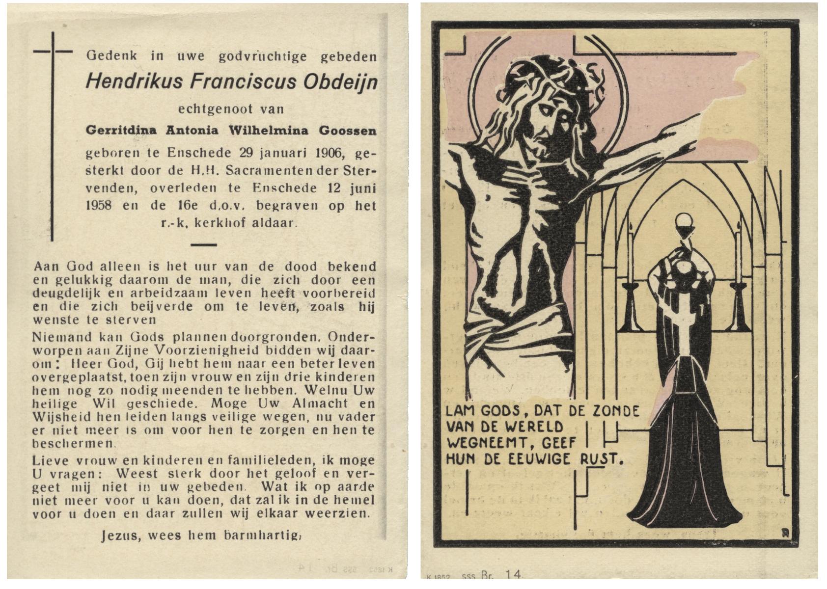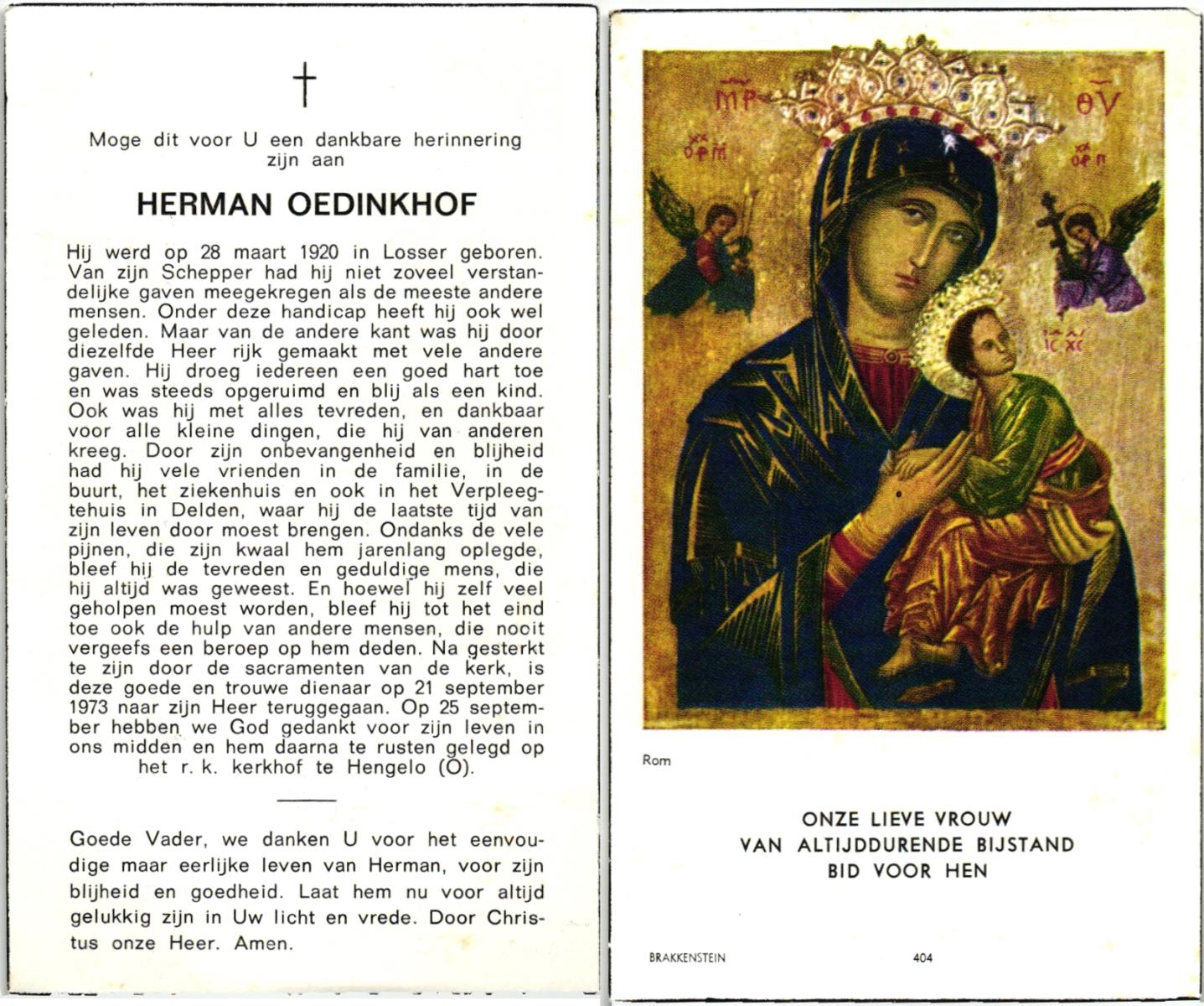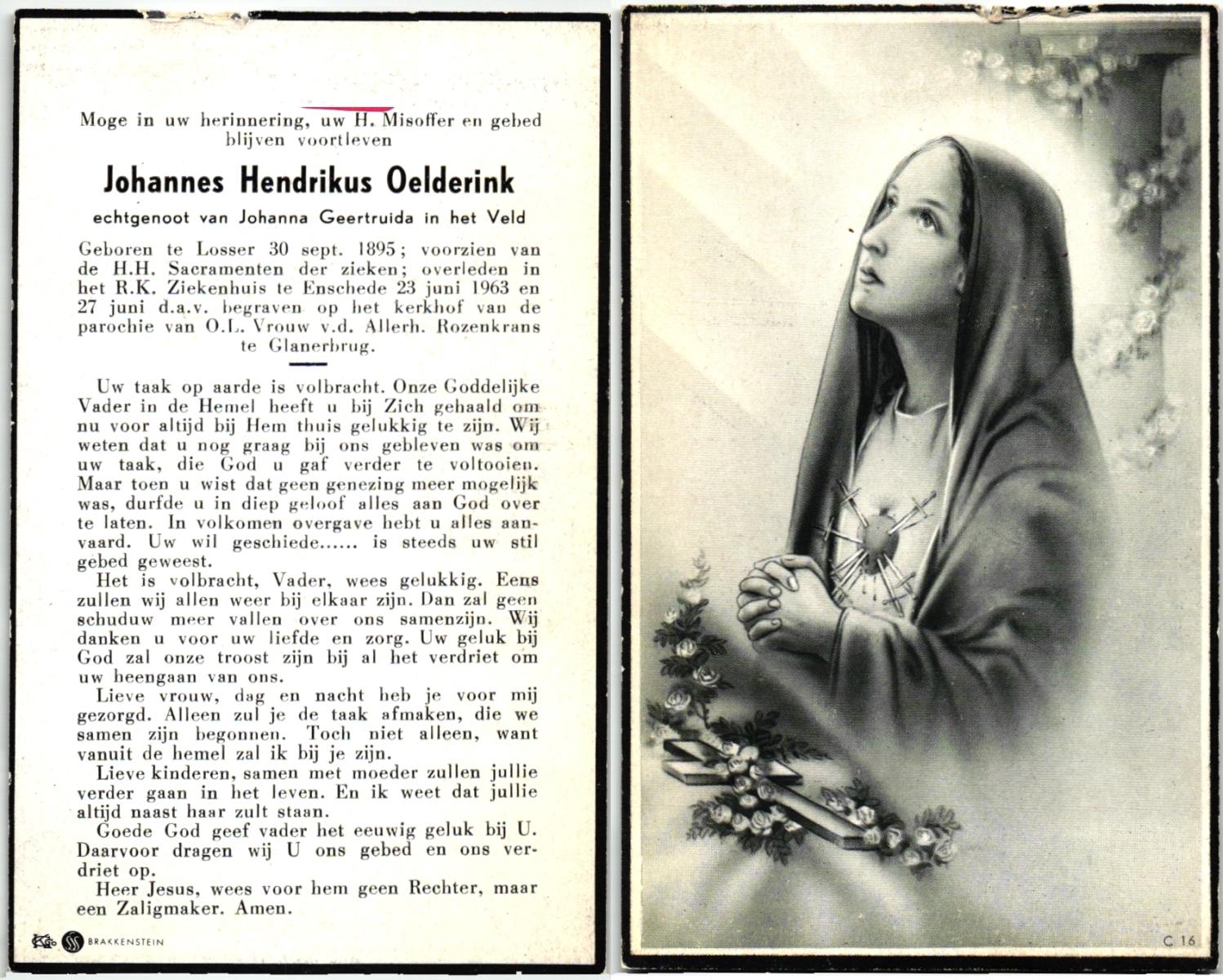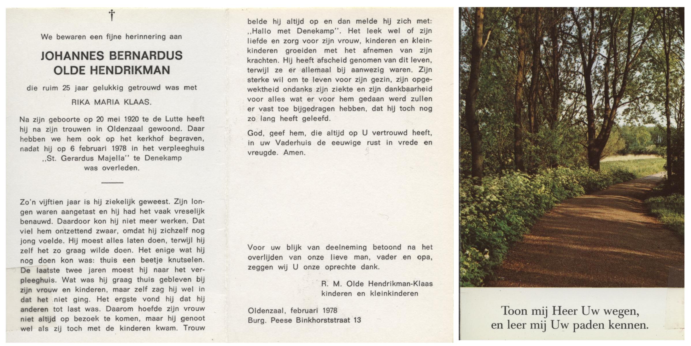 OLDE HENDRIKMAN, Johannes Bernardus, geboren op 20-5-1920 te De Lutte, overleden op 6-2-1978 te Denekamp op 67-jarige leeftijd, begraven te Oldenzaal.