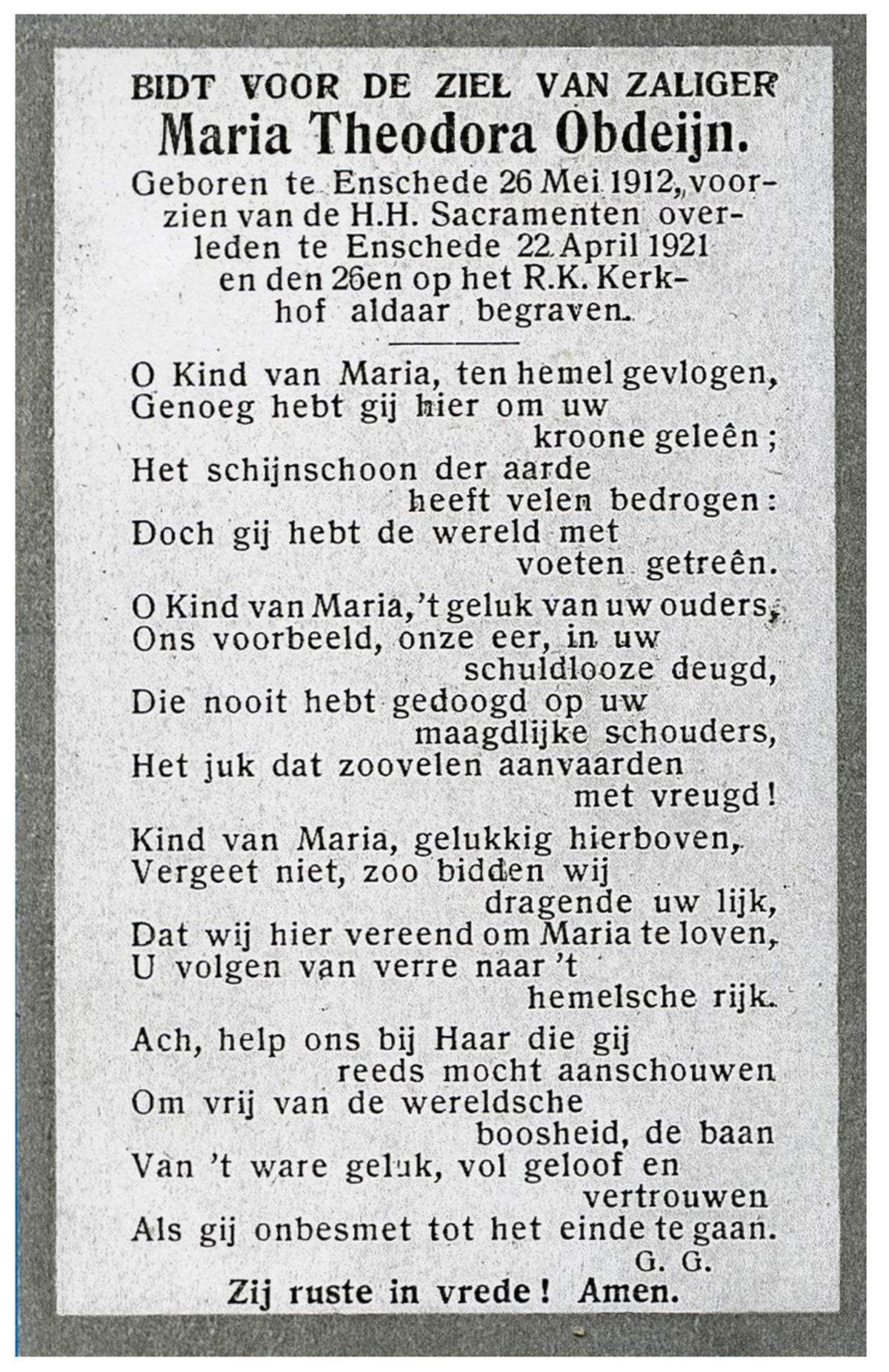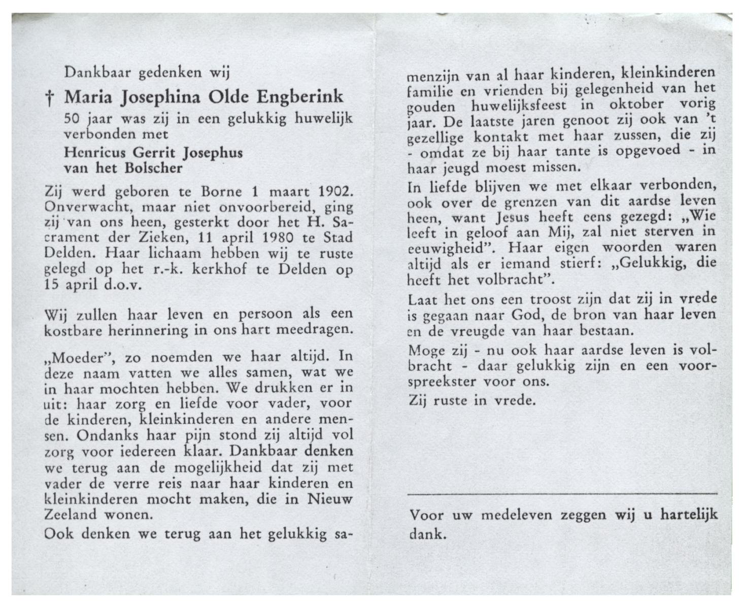 OLDE ENGBERINK, Maria Josephina, geboren op 1-3-1902 te Borne, overleden op 11-4-1980 te Delden, Stad op 78-jarige leeftijd, begraven op 15-4-1980 te Delden.
