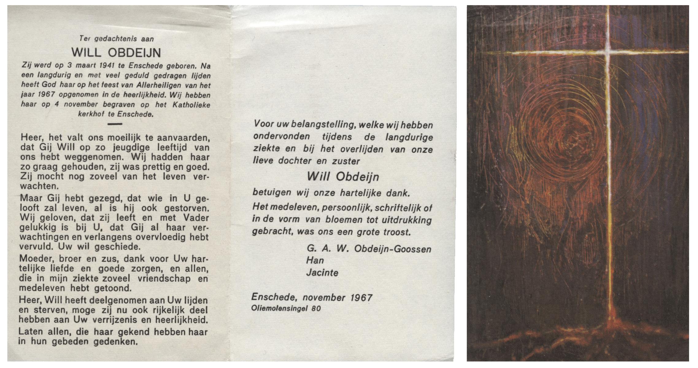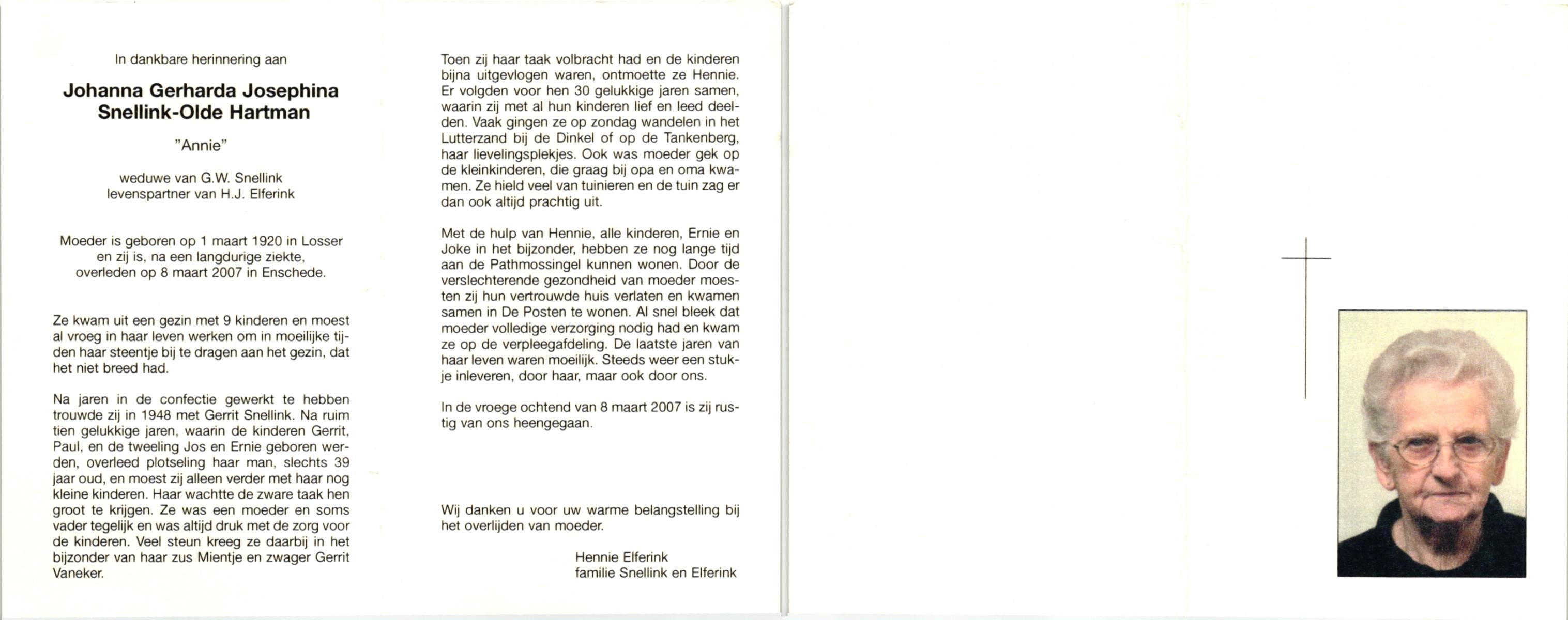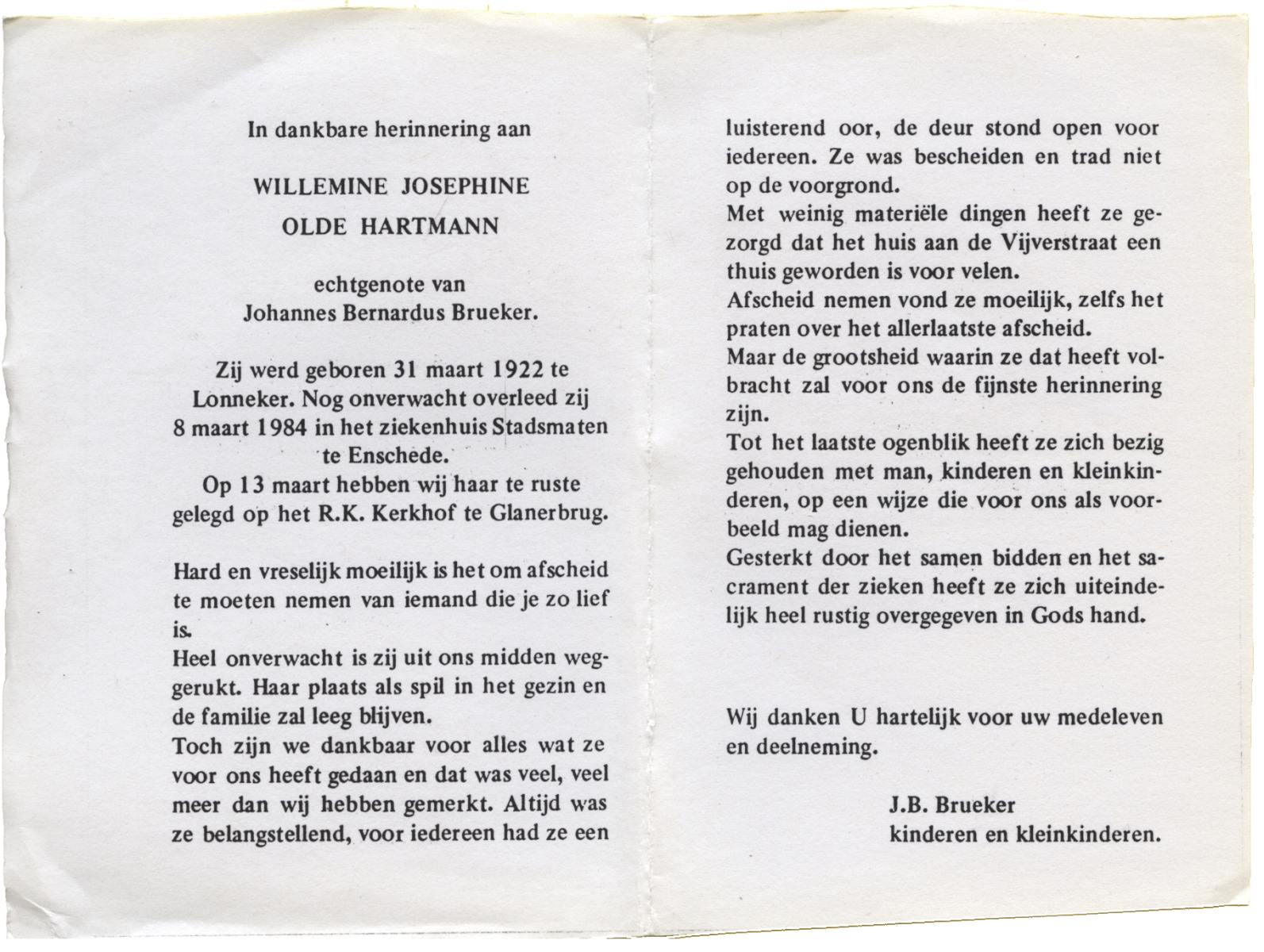OLDE HARTMANN, Willemine Josephine, geboren op 31-3-1922 te Lonneker, overleden op 8-3-1984 te Enschede op 61-jarige leeftijd, begraven op 13-3-1984 te Glanerbrug.