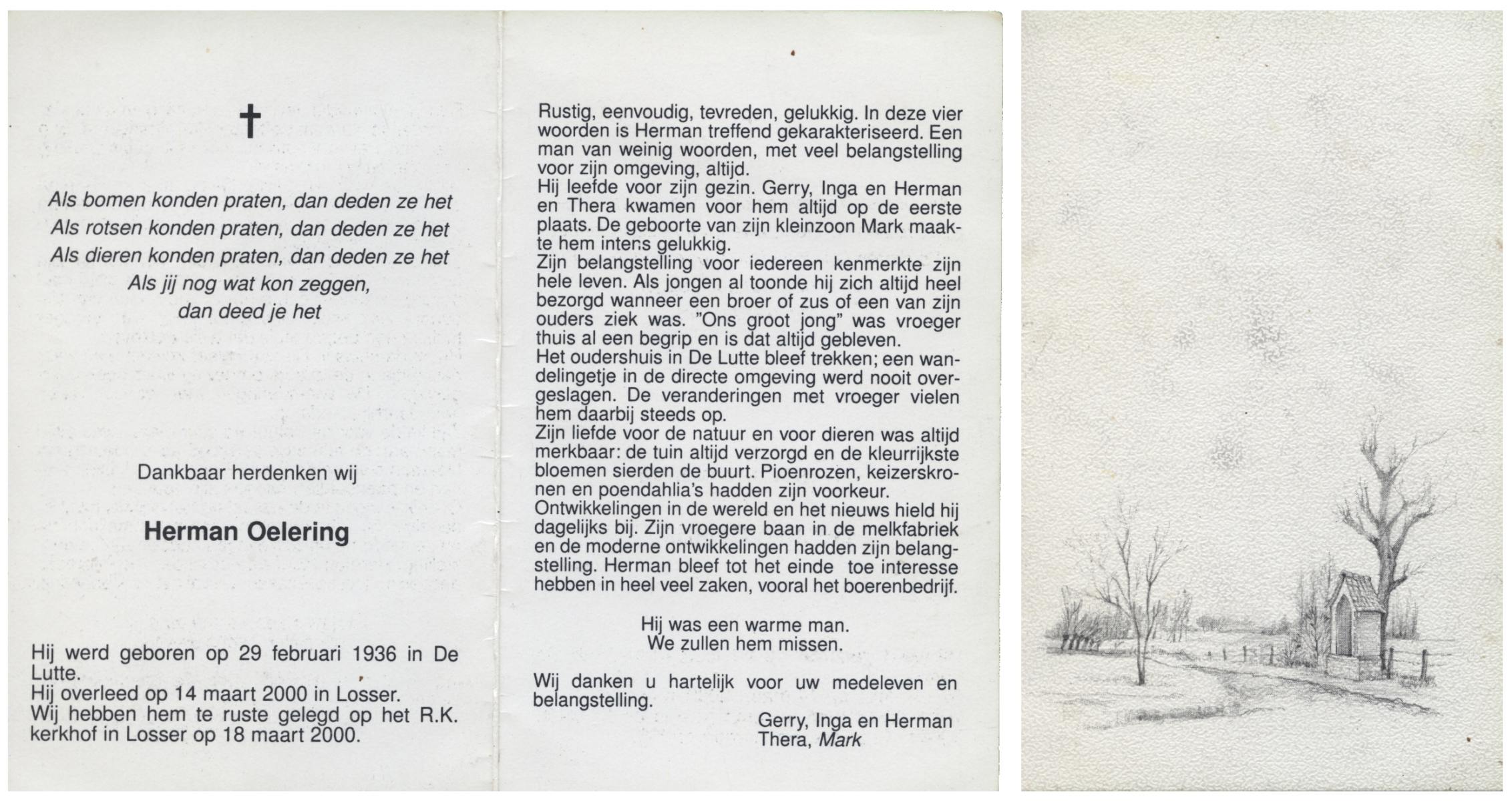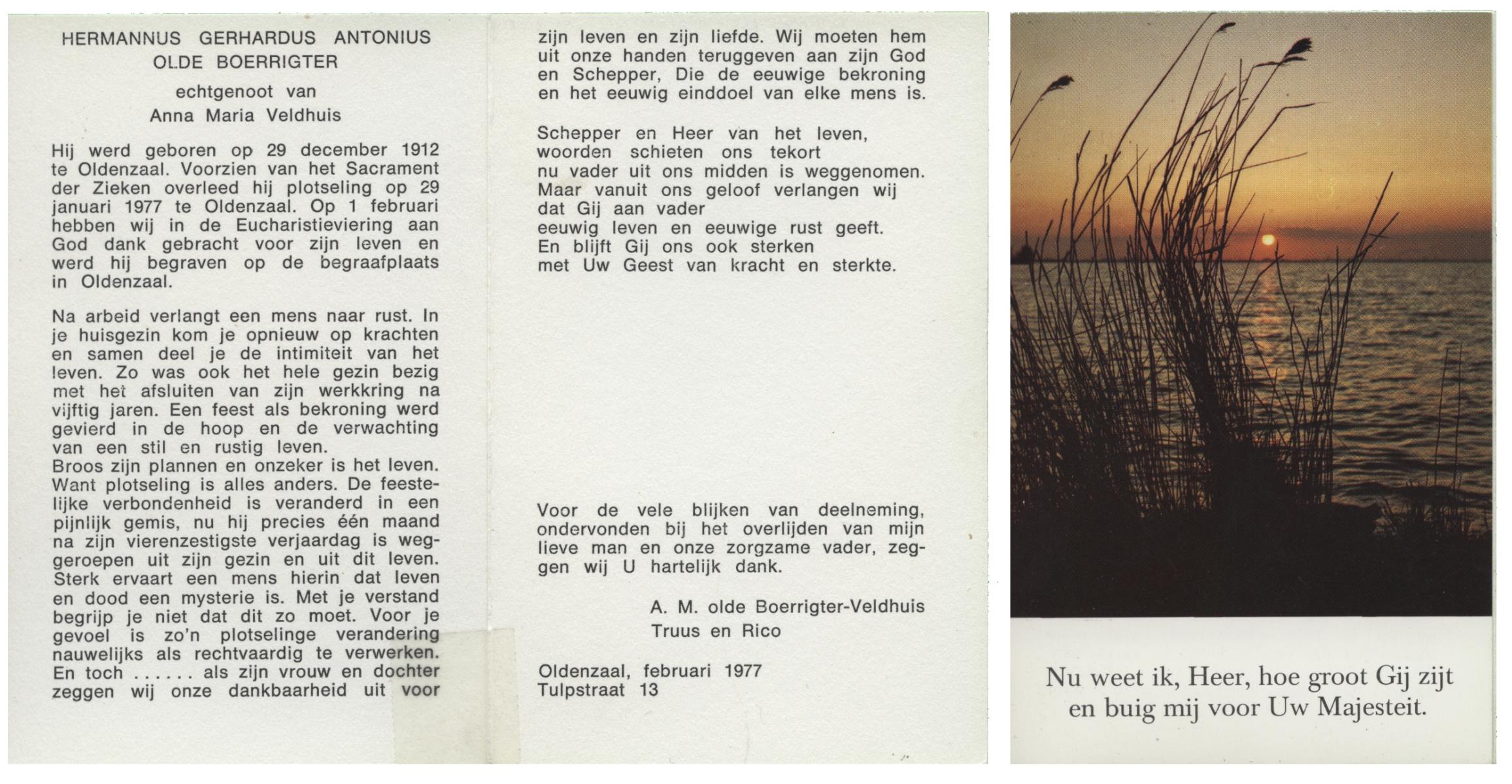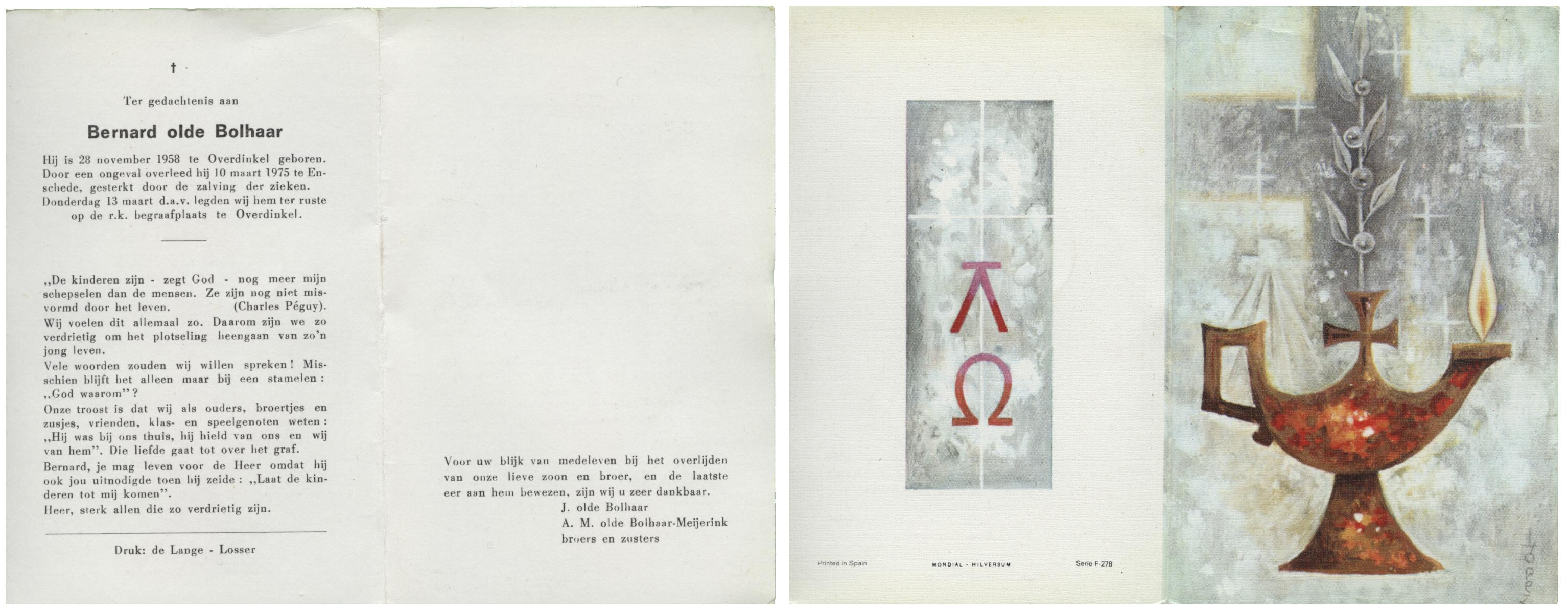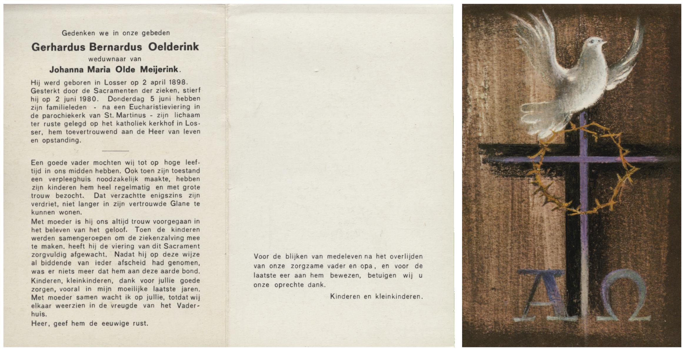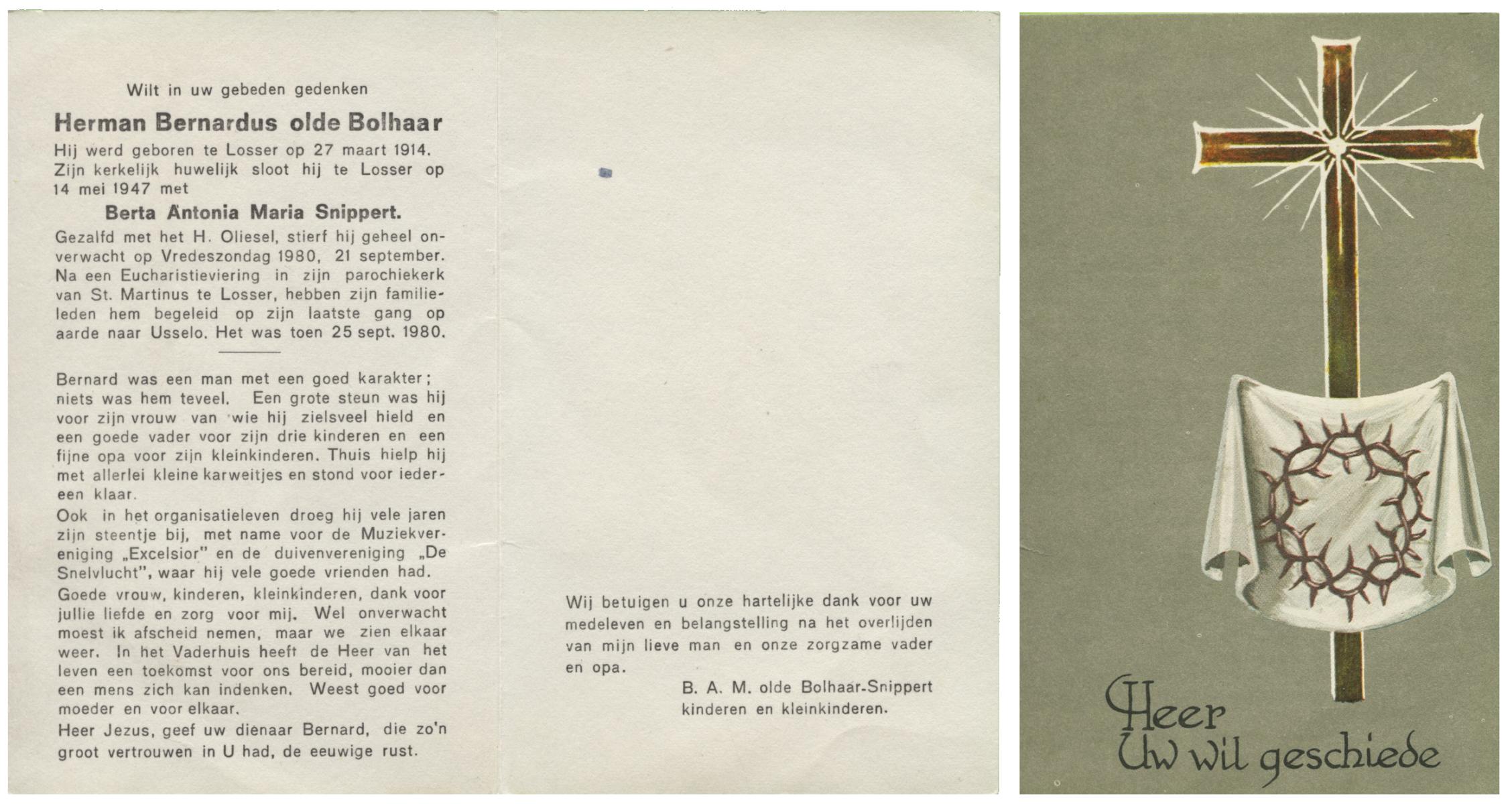 OLDE BOLHAAR, Herman Bernardus, geboren op 27-3-1914 te Losser, overleden op 21-9-1980 te Losser op 66-jarige leeftijd, gecremeerd op 25-9-1980 te Usselo.