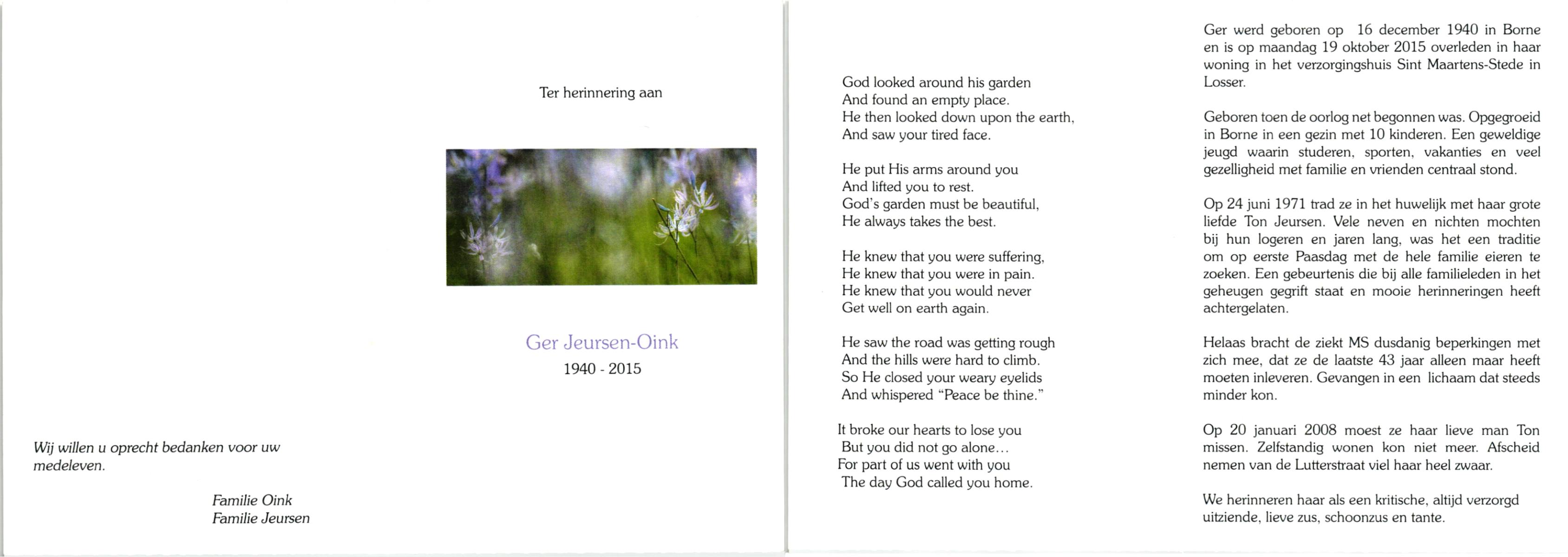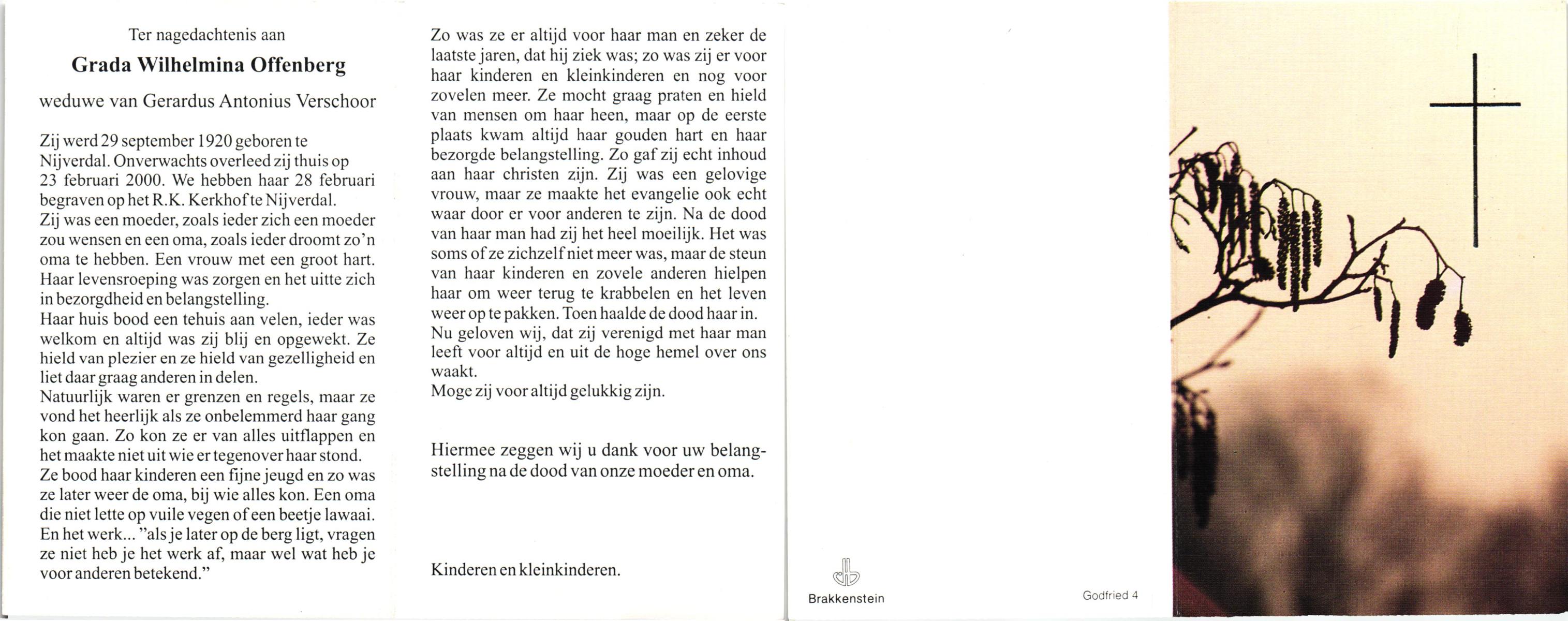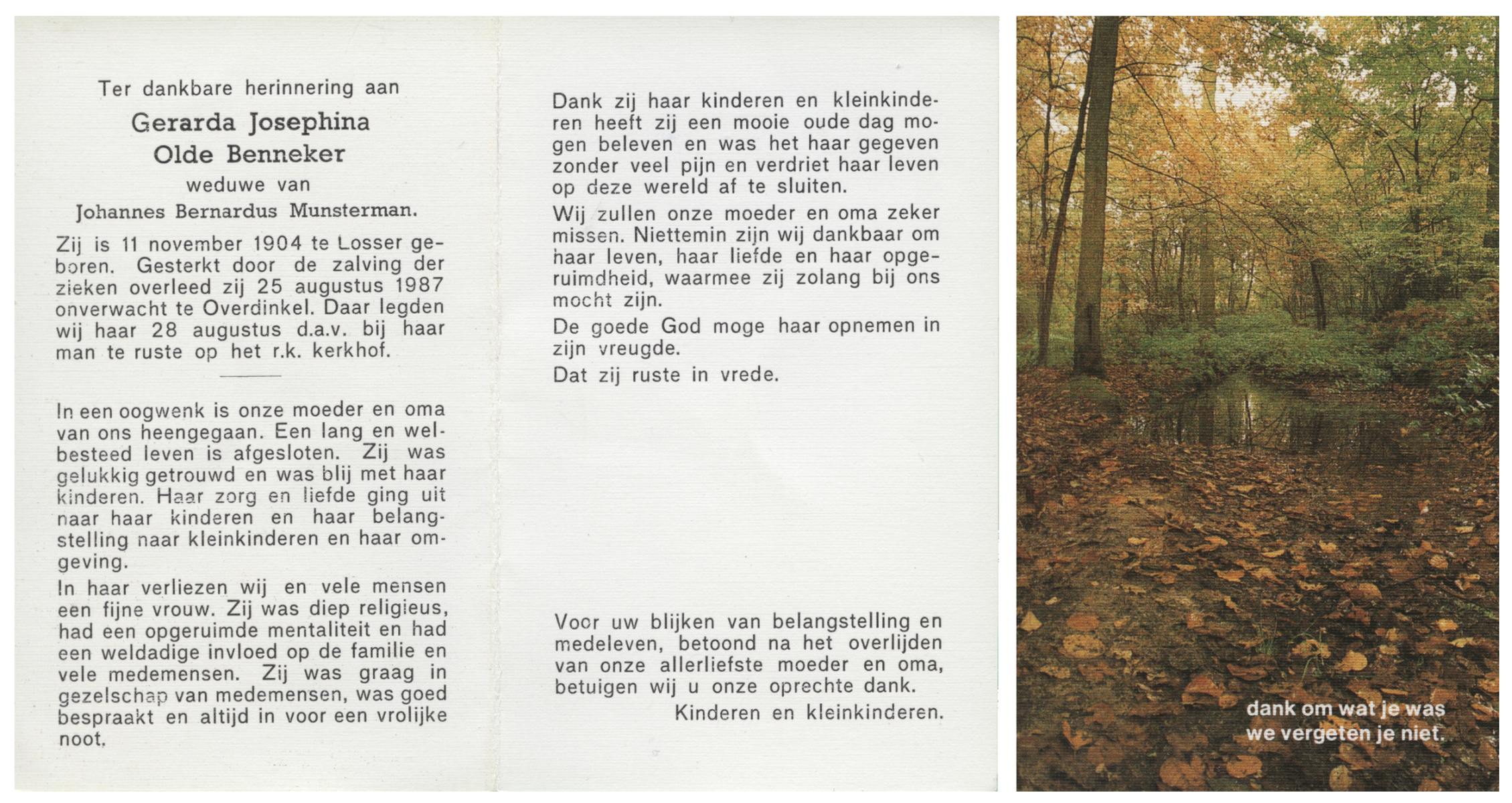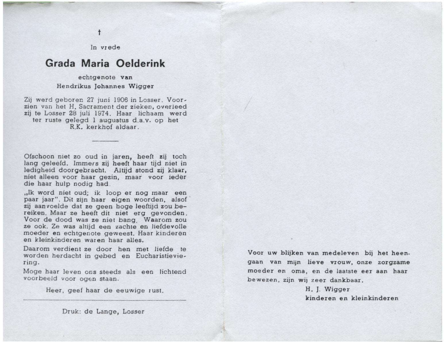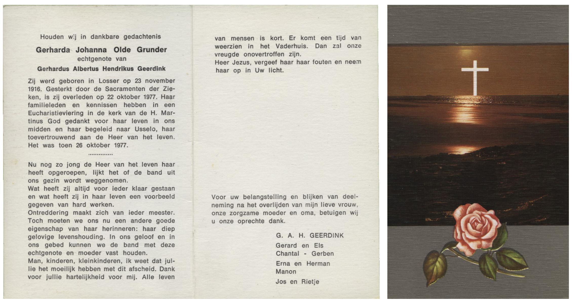 OLDE GRUNDER, Gerharda Johanna, geboren op 23-11-1916 te Losser, overleden op 22-10-1977 te Losser op 60-jarige leeftijd, gecremeerd op 26-10-1977 te Usselo.