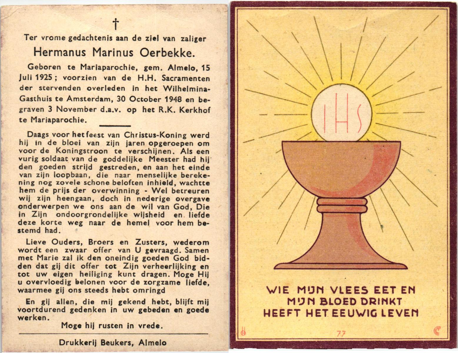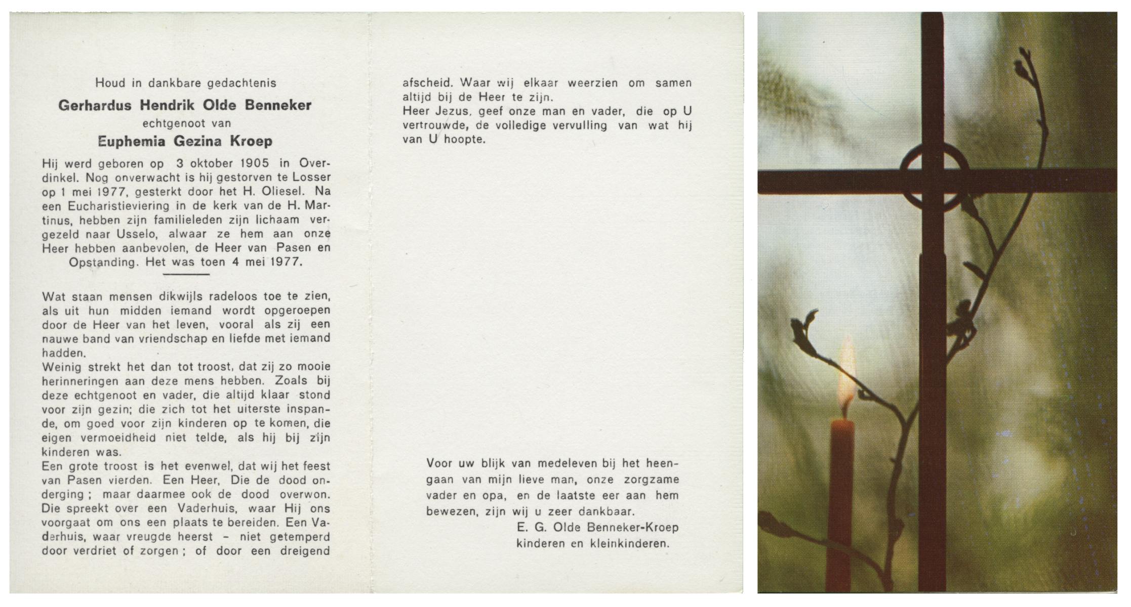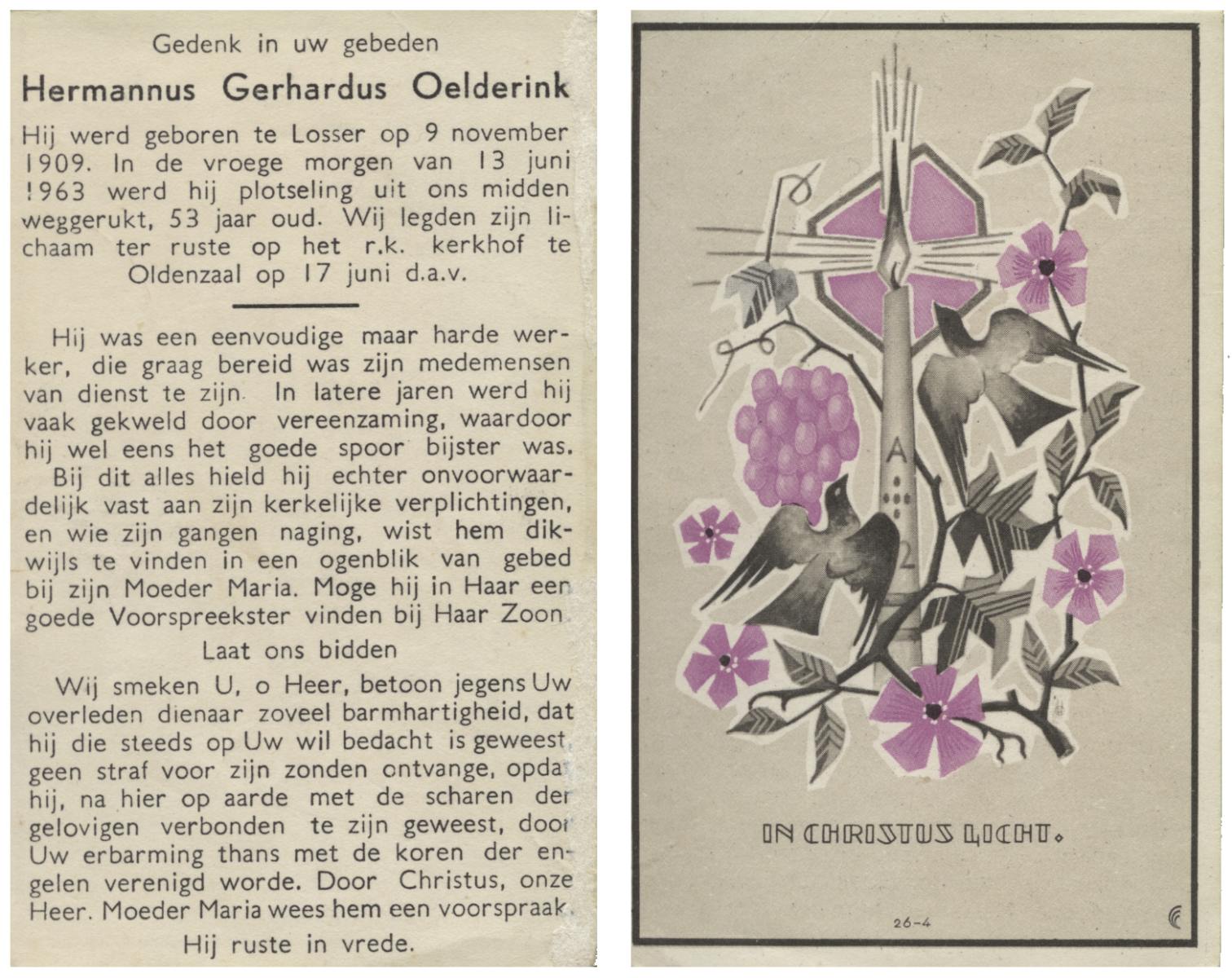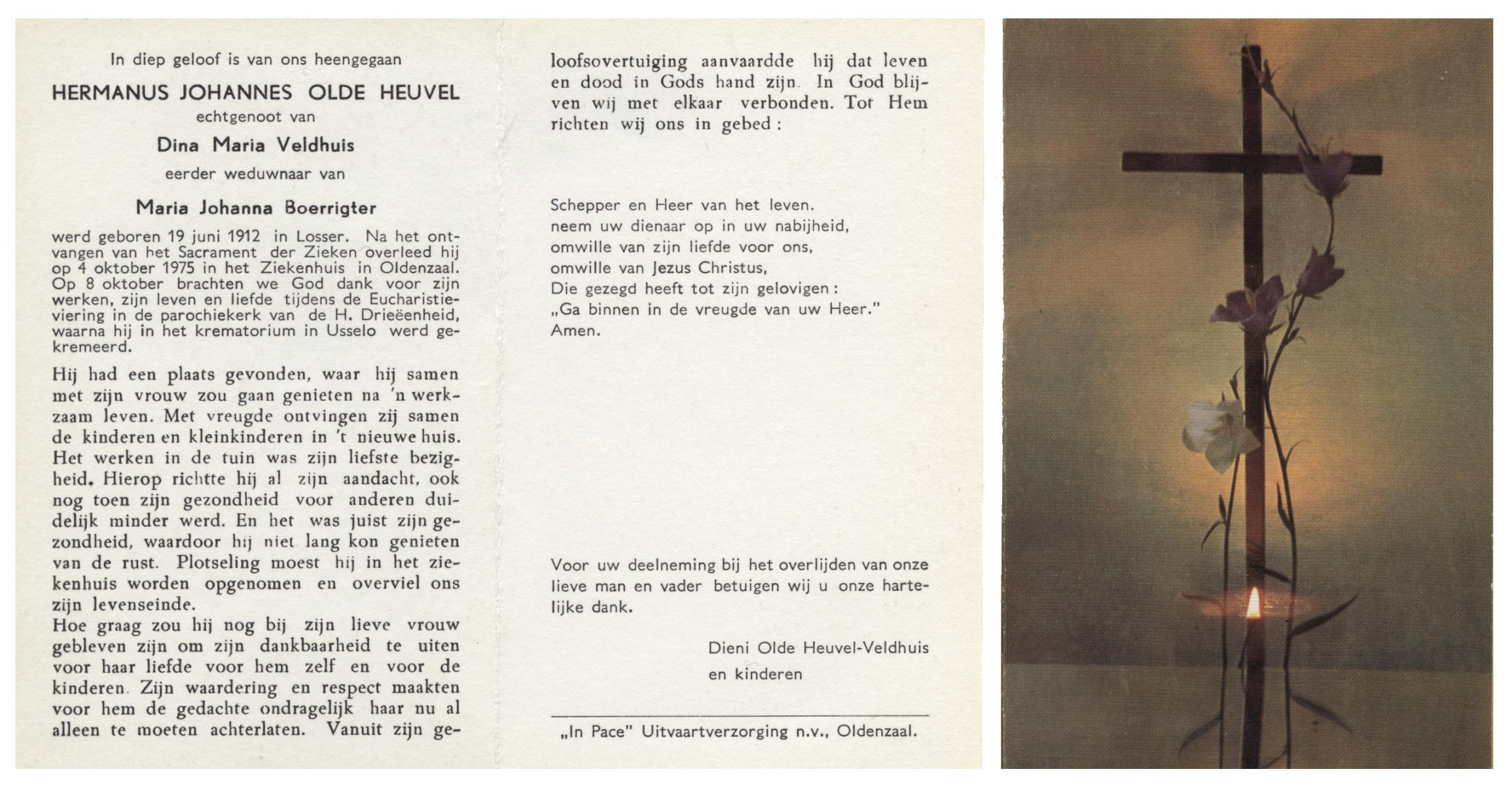 OLDE HEUVEL, Hermanus Johannes, geboren op 19-6-1912 te Losser, overleden op 4-10-1975 te Oldenzaal op 63-jarige leeftijd, gecremeerd op 8-10-1975 te Usselo.