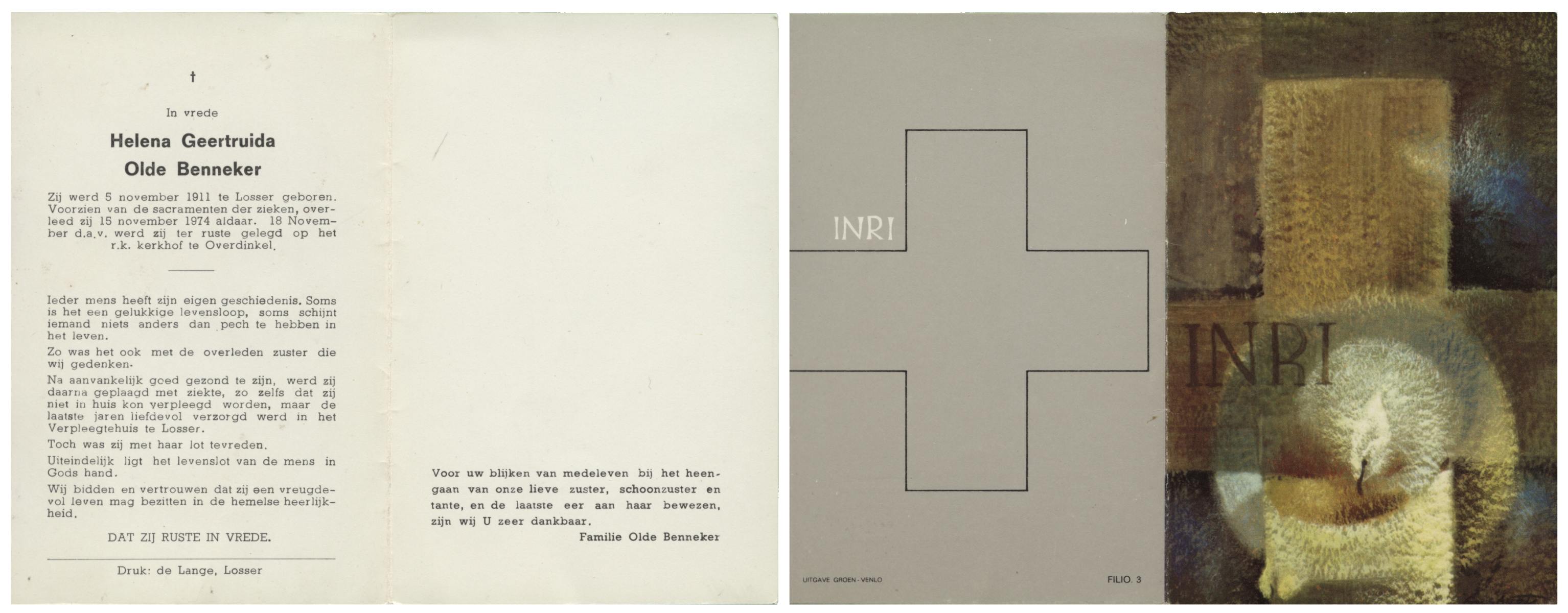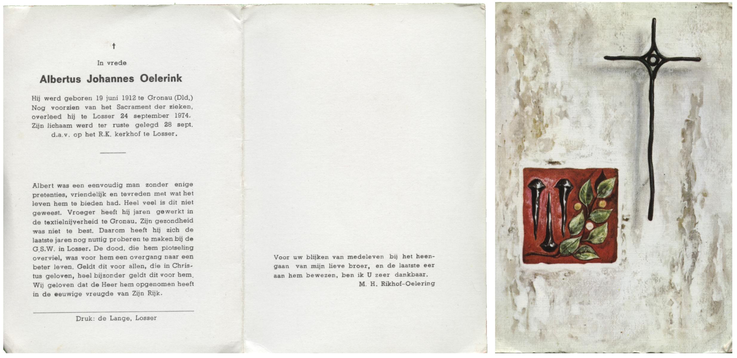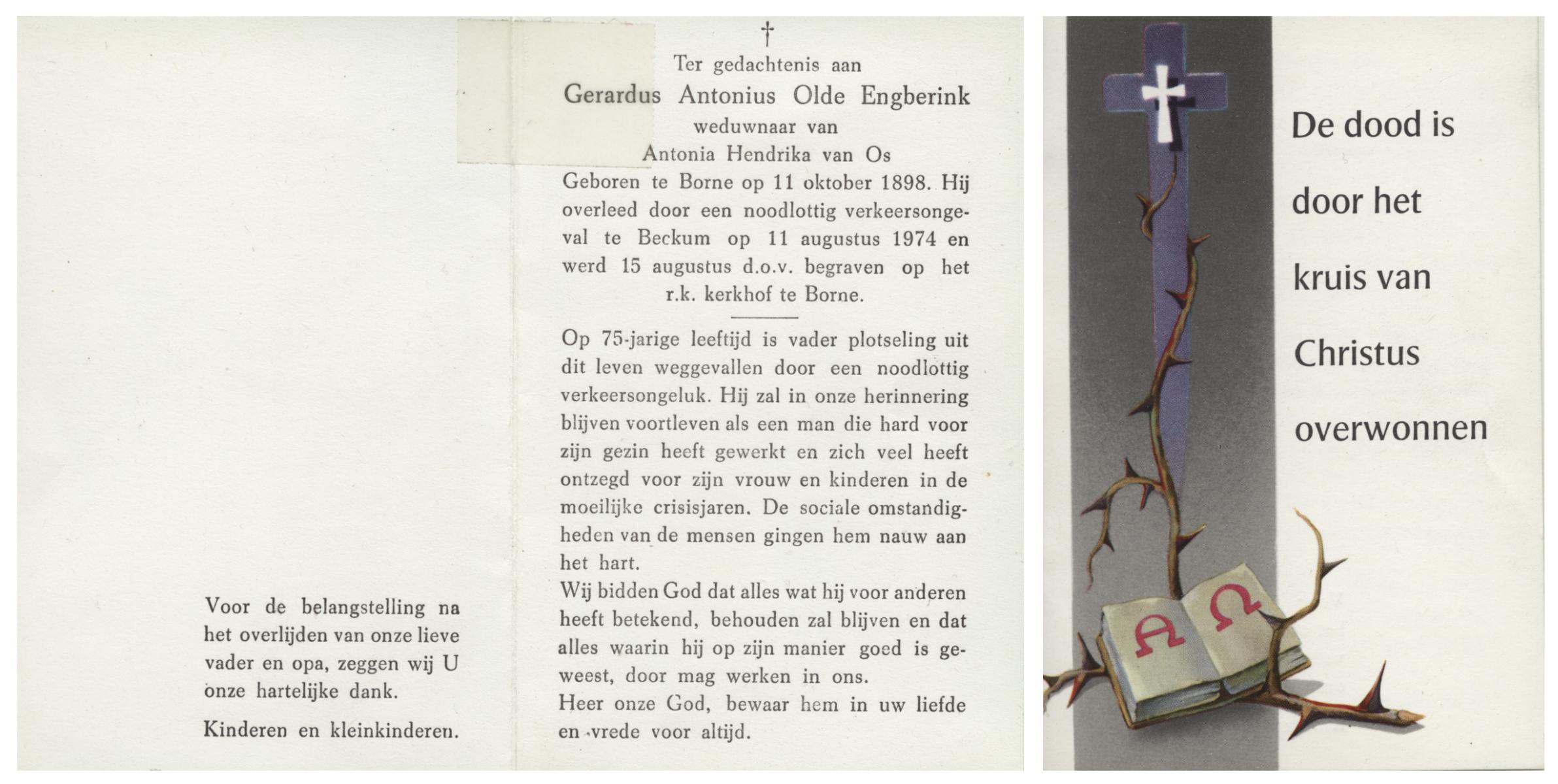 OLDE ENGBERINK, Gerardus Antonius, geboren op 11-10-1898 te Borne, overleden op 11-8-1974 te Beckum op 75-jarige leeftijd, begraven op 15-8-1974 te Borne.