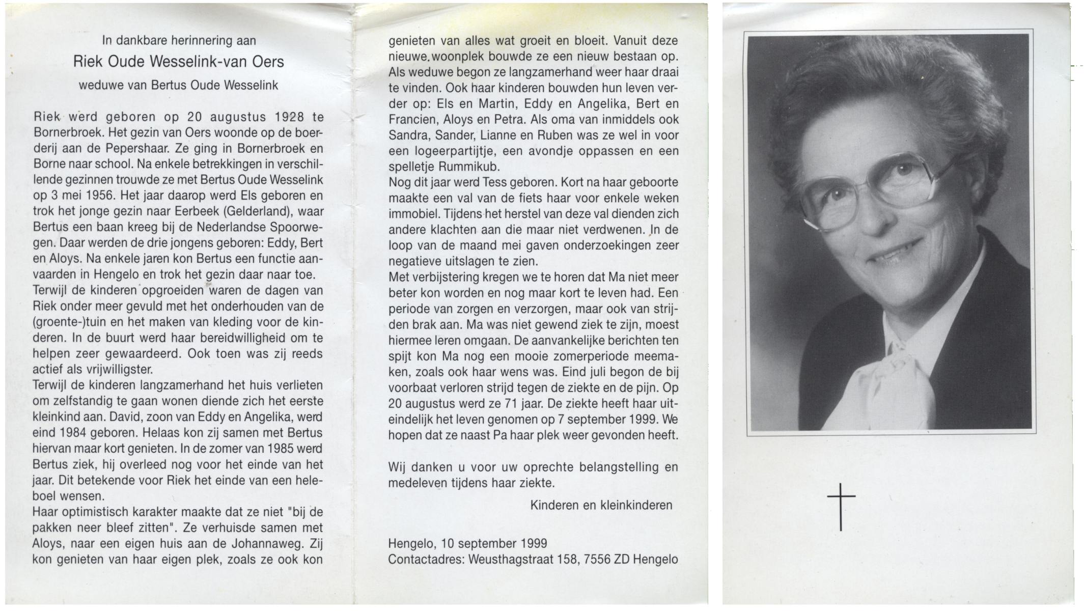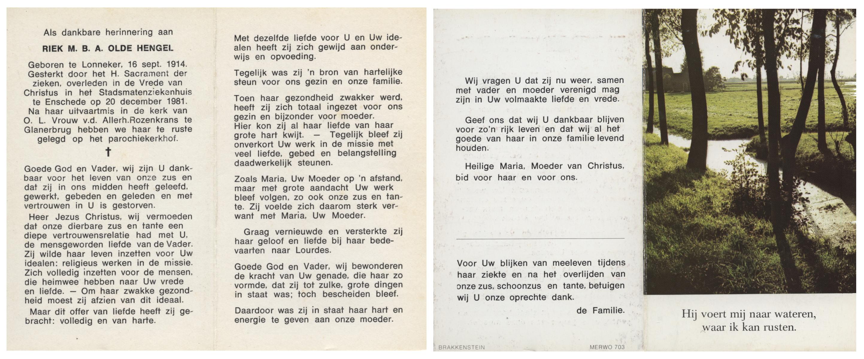 OLDE HENGEL, Riek M.B.A., geboren op 16-9-1914 te Lonneker, overleden op 20-12-1981 te Enschede op 67-jarige leeftijd, begraven te Glanerbrug.
