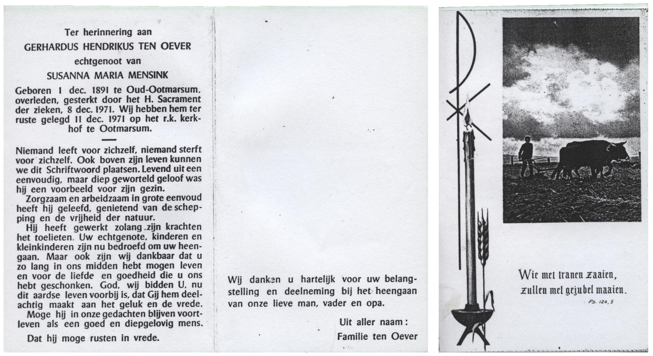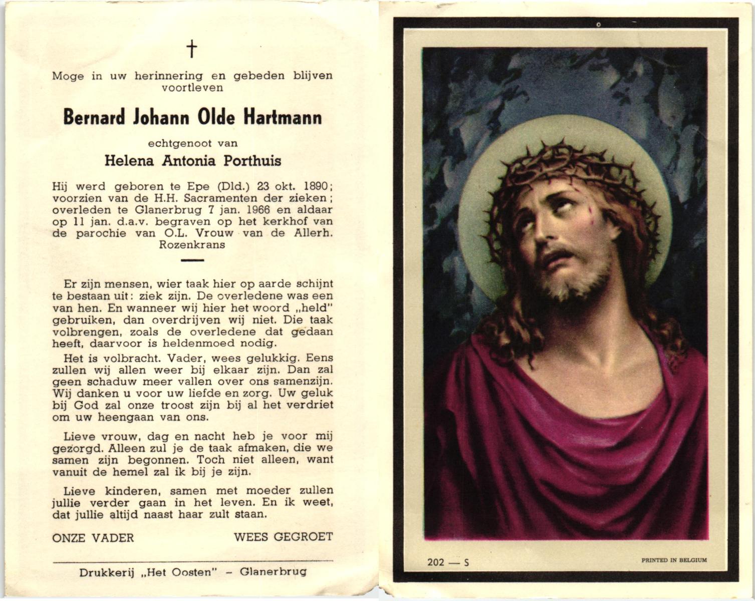 OLDE HARTMANN, Bernard Johann, geboren op 23-10-1890 te Epe, Dld, overleden op 7-1-1966 te Glanerbrug op 75-jarige leeftijd, begraven op 11-1-1966 te Glanerbrug.