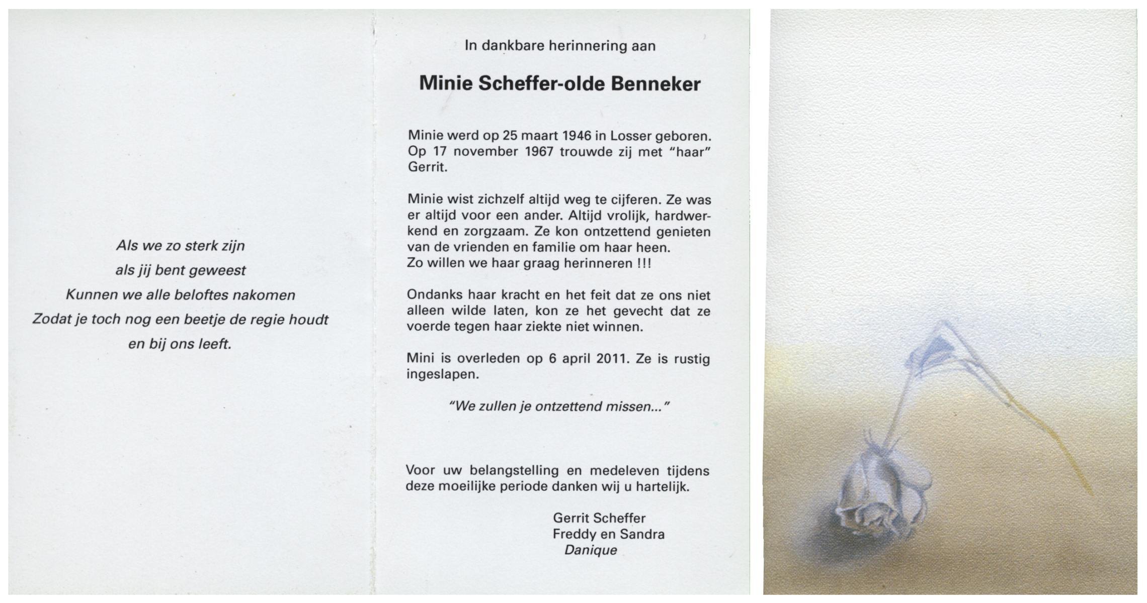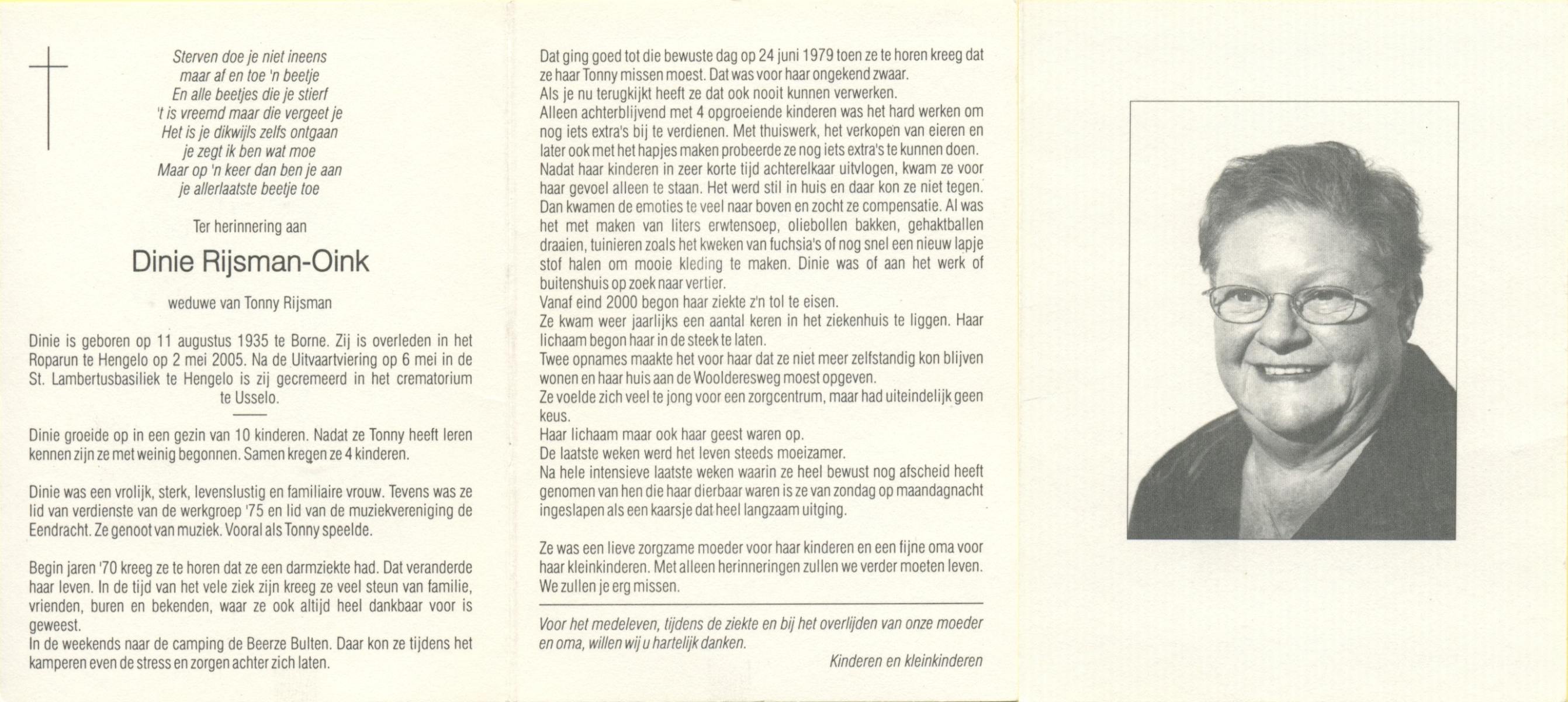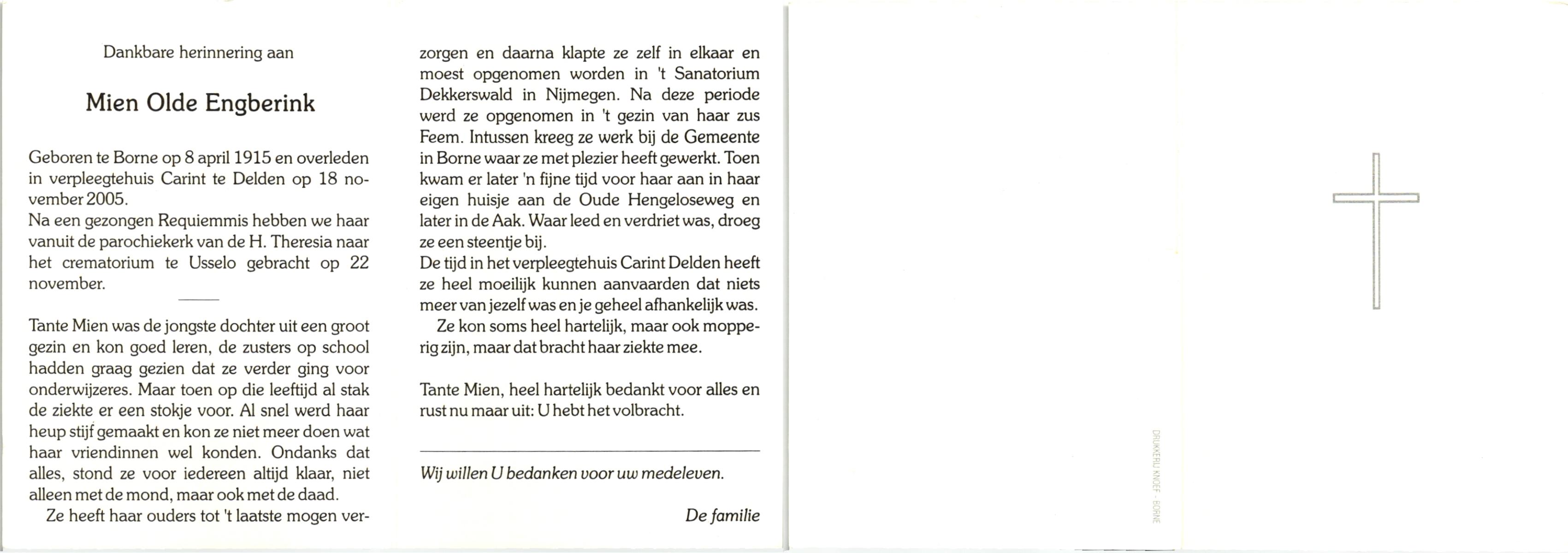 OLDE ENGBERINK, , Mien, geboren op 8-4-1915 te Borne, overleden op 18-11-2005 te Delden op 90-jarige leeftijd, gecremeerd op 22-11-2005 te Usselo.