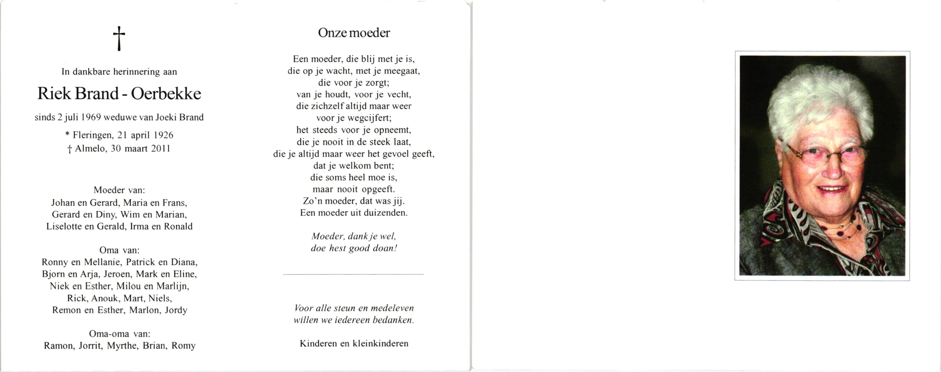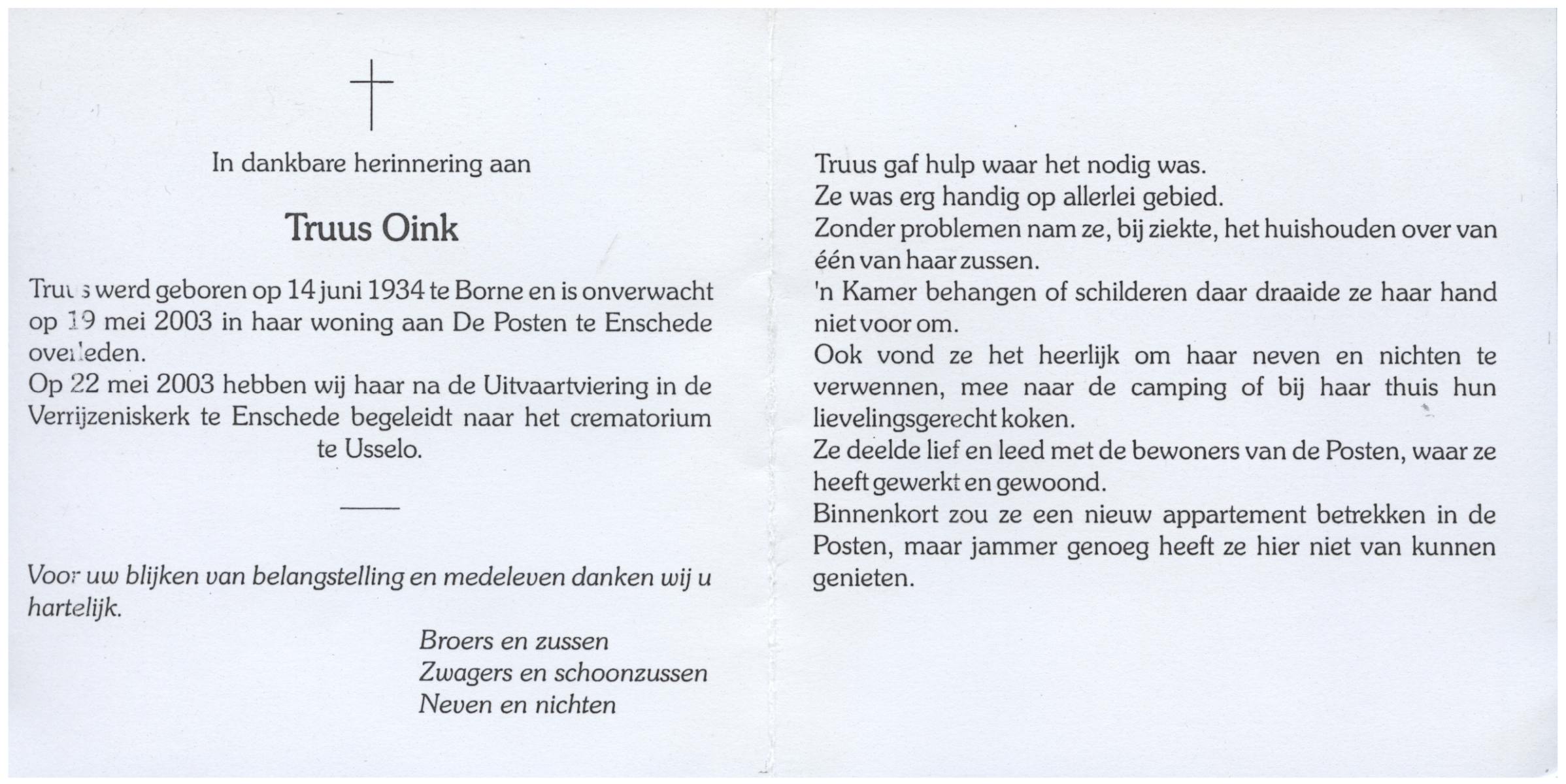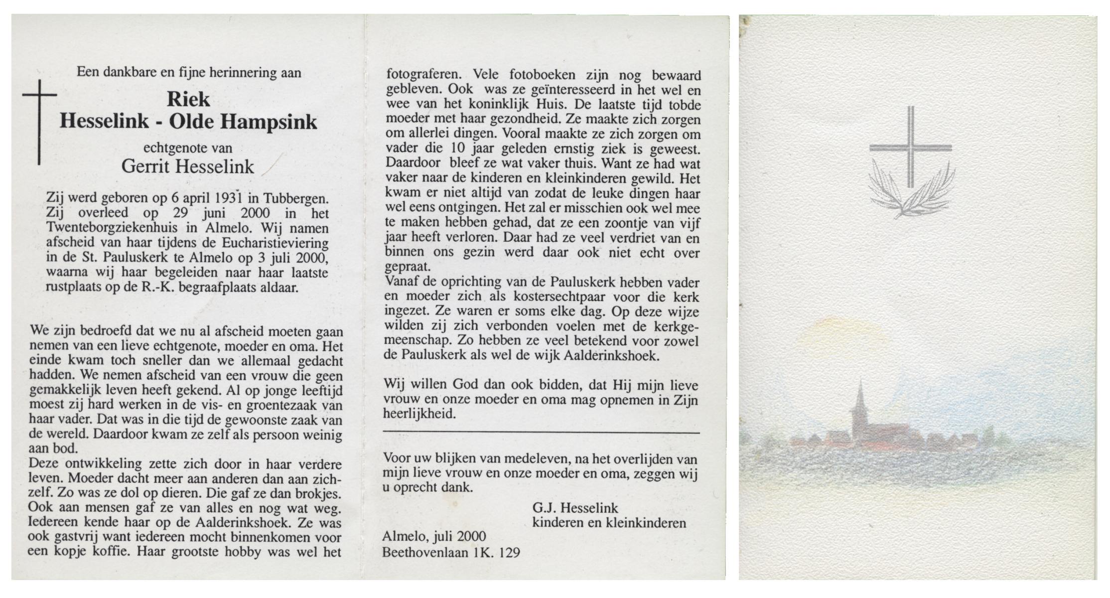 OLDE HAMPSINK, Riek, geboren op 6-4-1931 te Tubbergen, overleden op 29-6-2000 te Almelo op 69-jarige leeftijd, begraven op 3-7-2000 te Almelo R.K.Kerkhof.