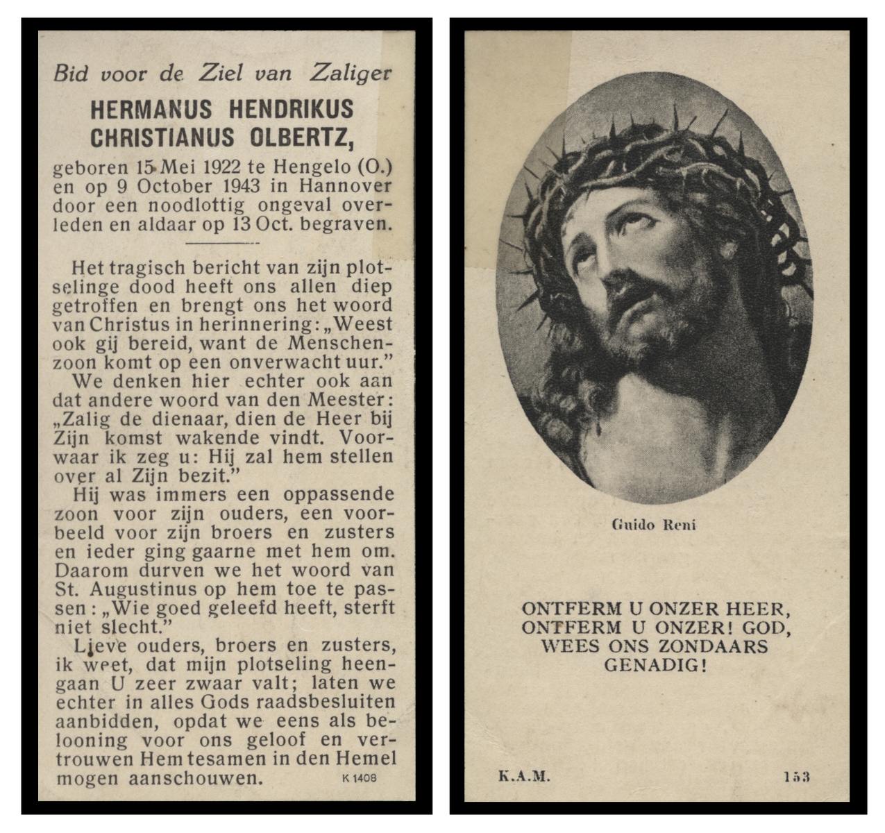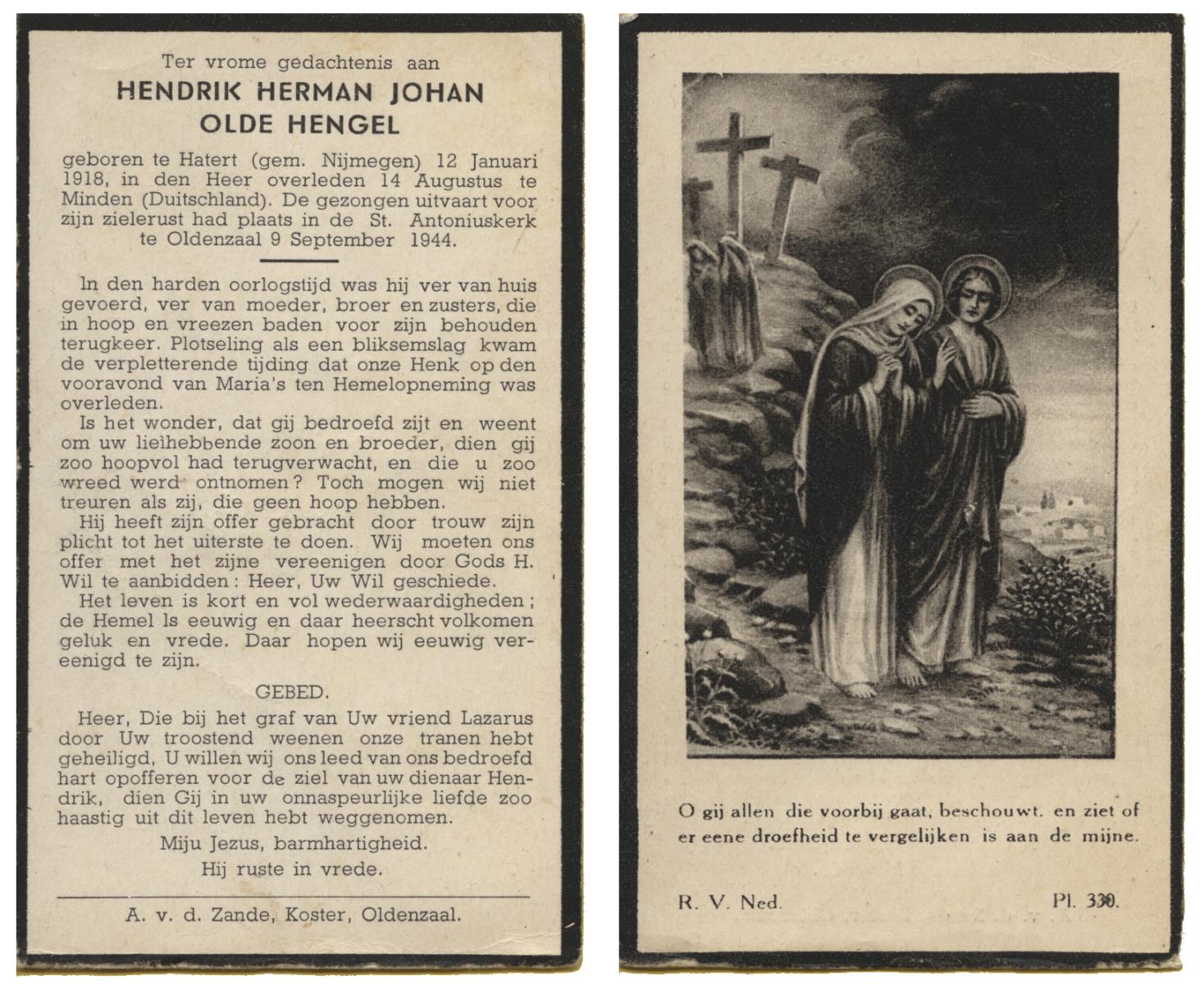 OLDE HENGEL, Hendrik Herman Johan, geboren op 12-1-1918 te Nijmegen, Hatert, overleden op 14-8-1944 te Minden, Dld op 26-jarige leeftijd, begraven op 9-9-1944 te Oldenzaal.