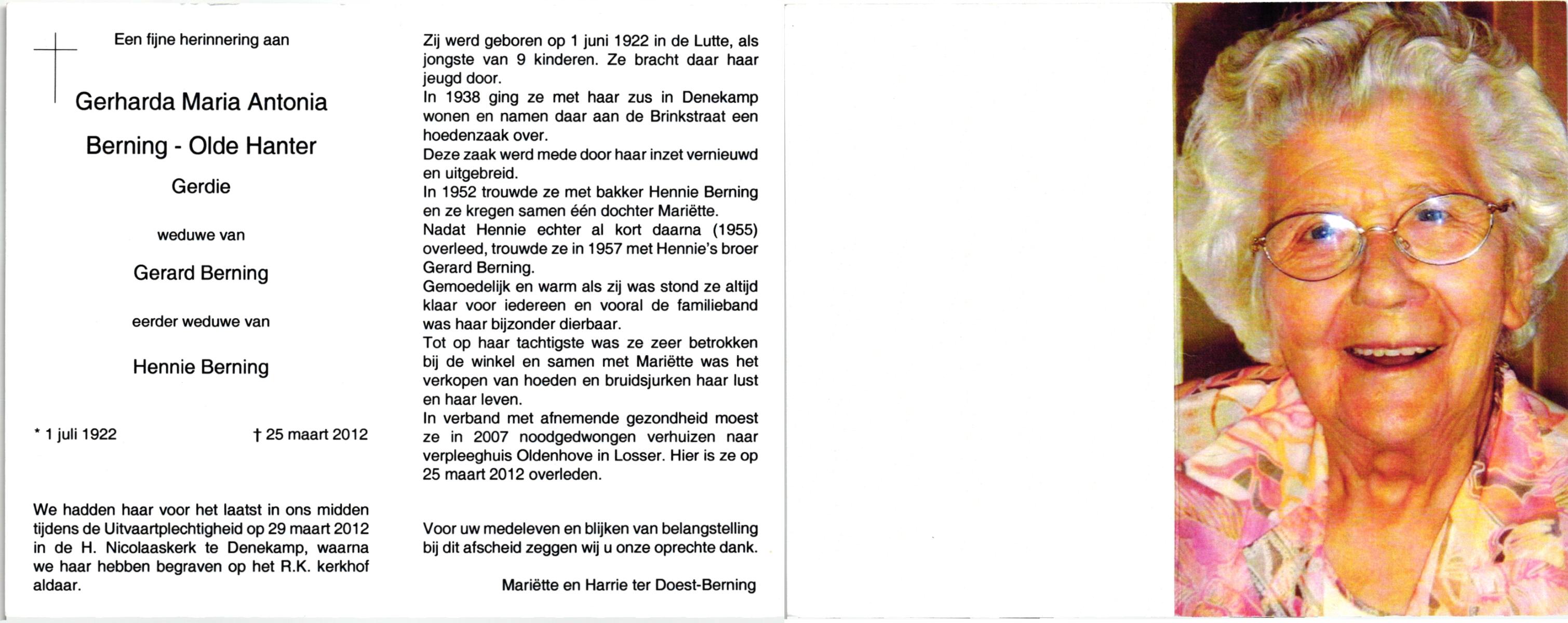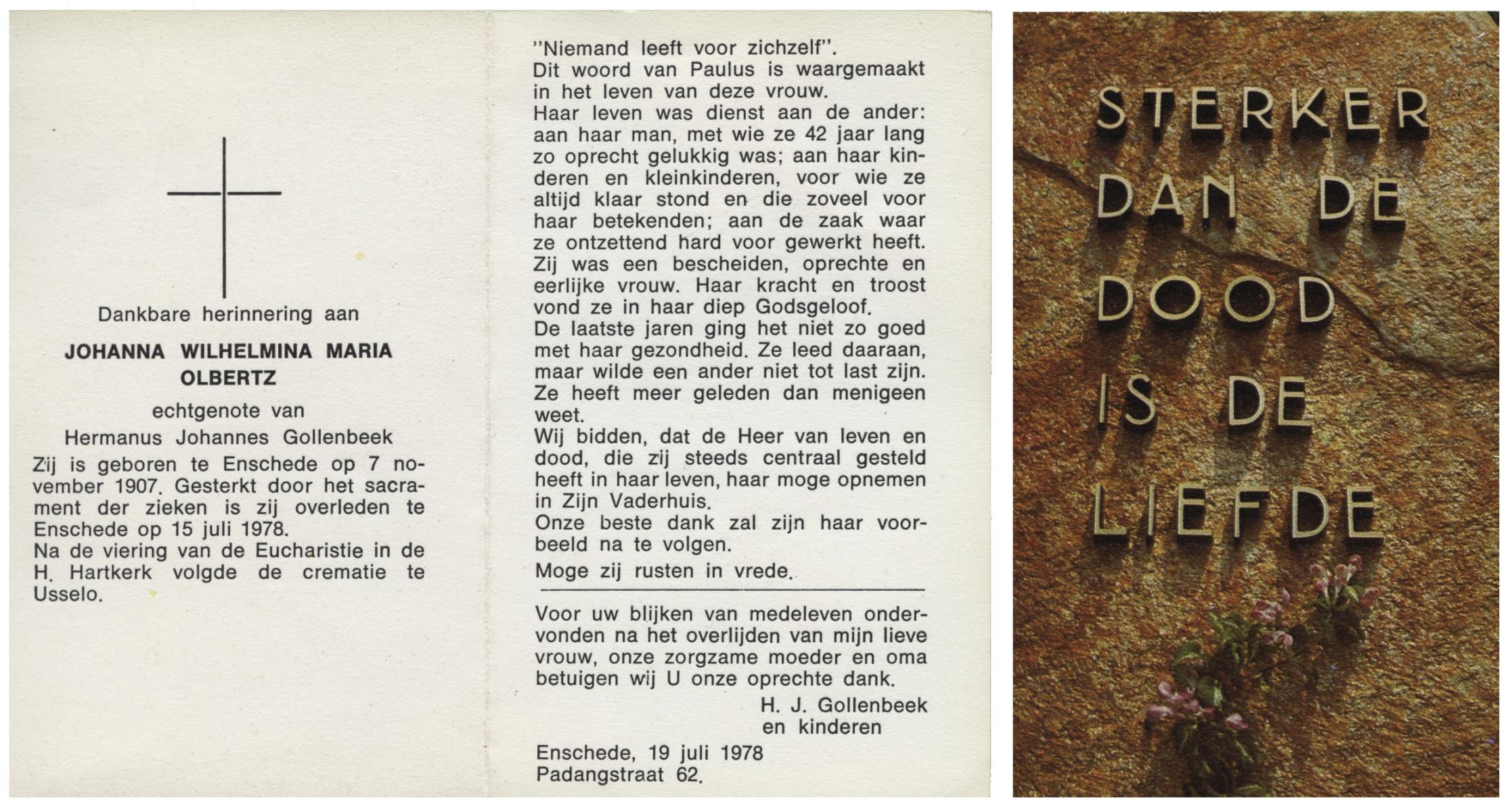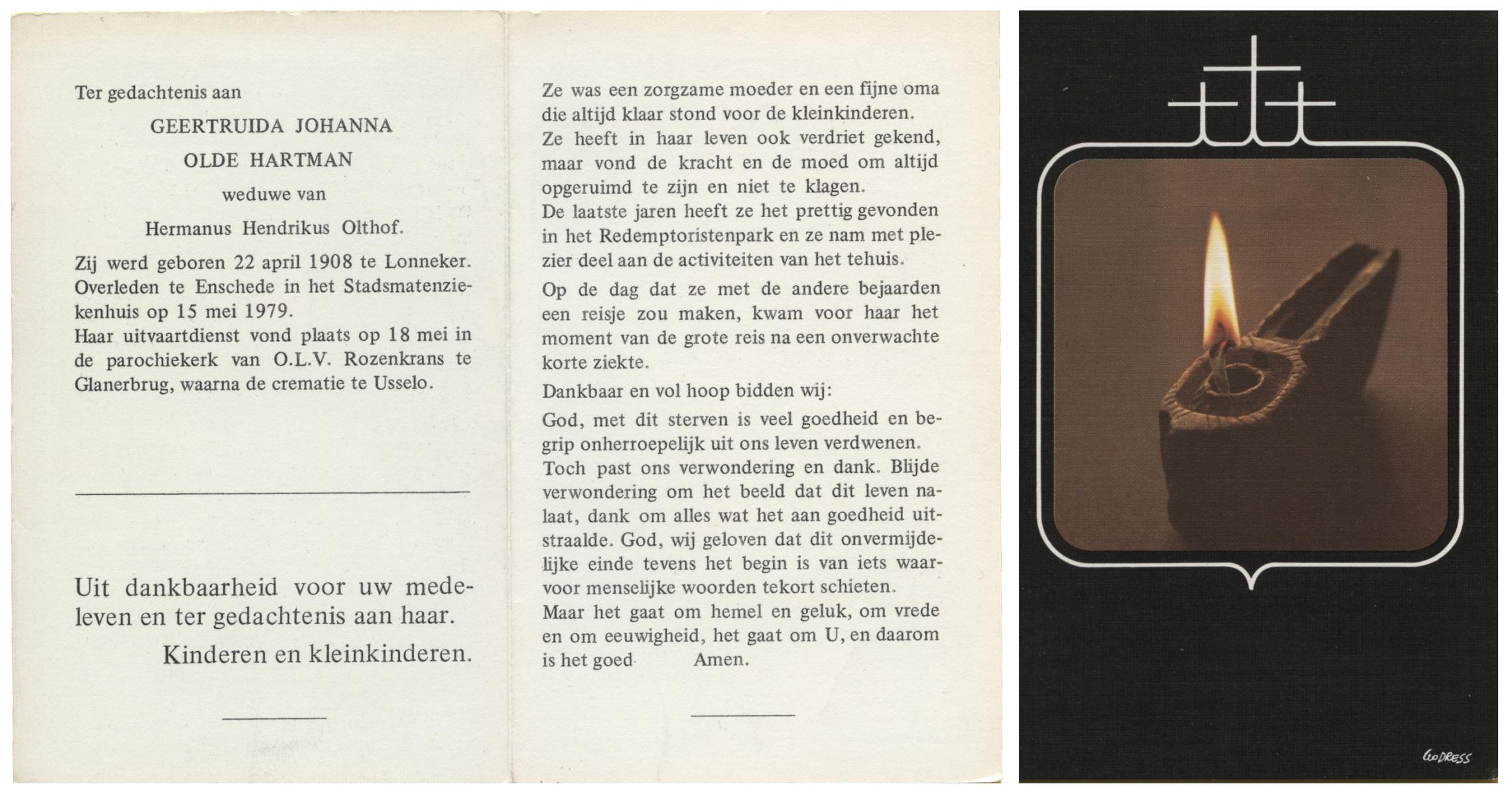 OLDE HARTMAN, Geertruida Johanna, geboren op 22-4-1908 te Lonneker, overleden op 15-5-1979 te Enschede op 71-jarige leeftijd, gecremeerd op 18-5-1979 te Usselo.